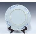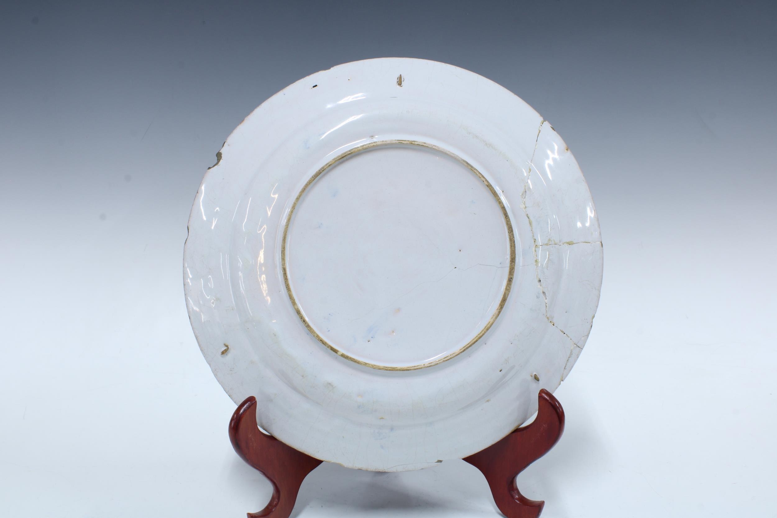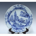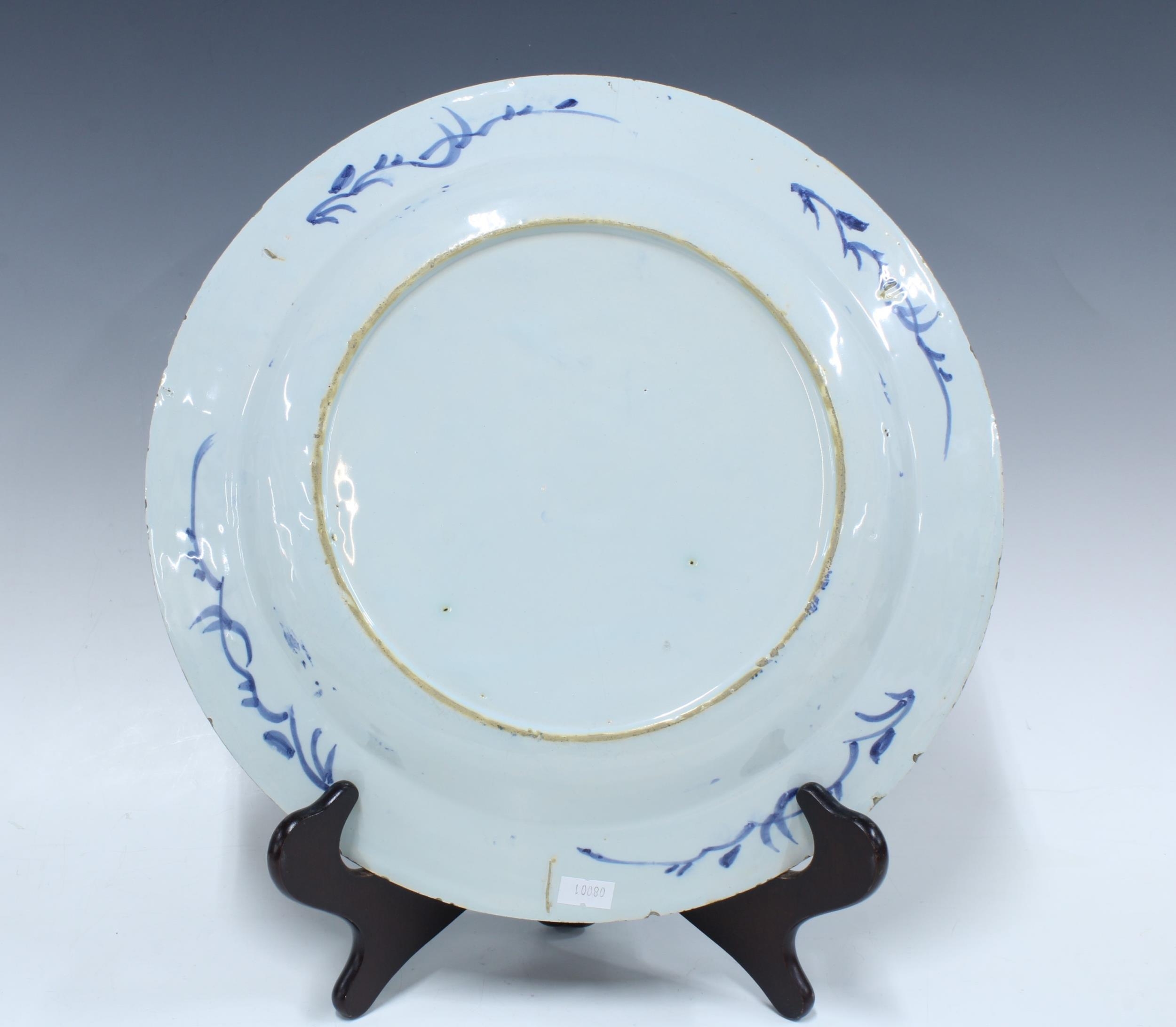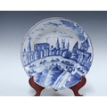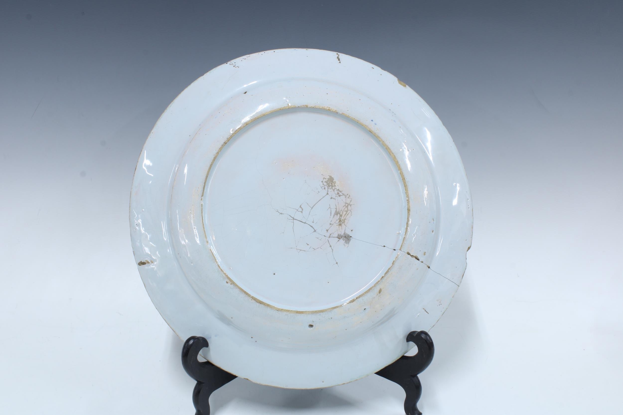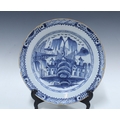 Two large 18th century Delft blue and white tin glazed chargers / plates, together with a smaller tin glazed plate, handpainted with a scene of Venice (all a/f with damages) and repairs (3)