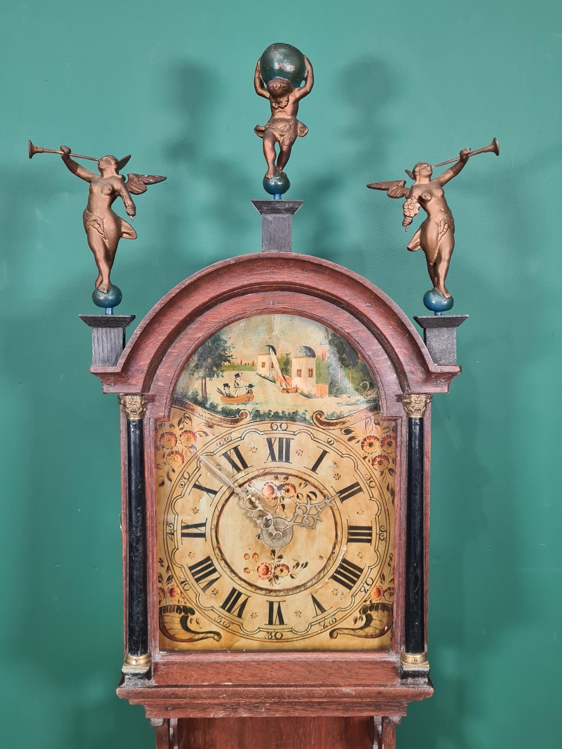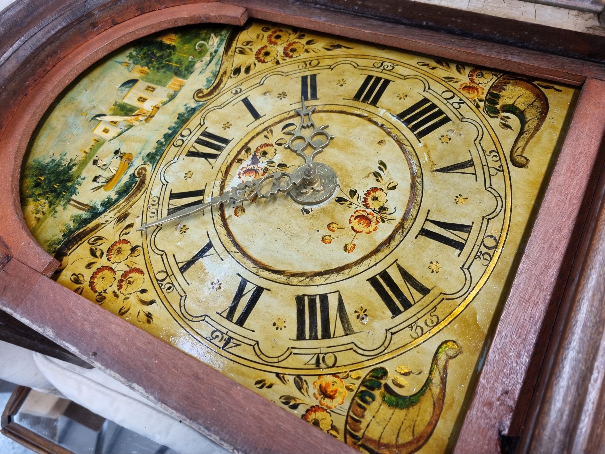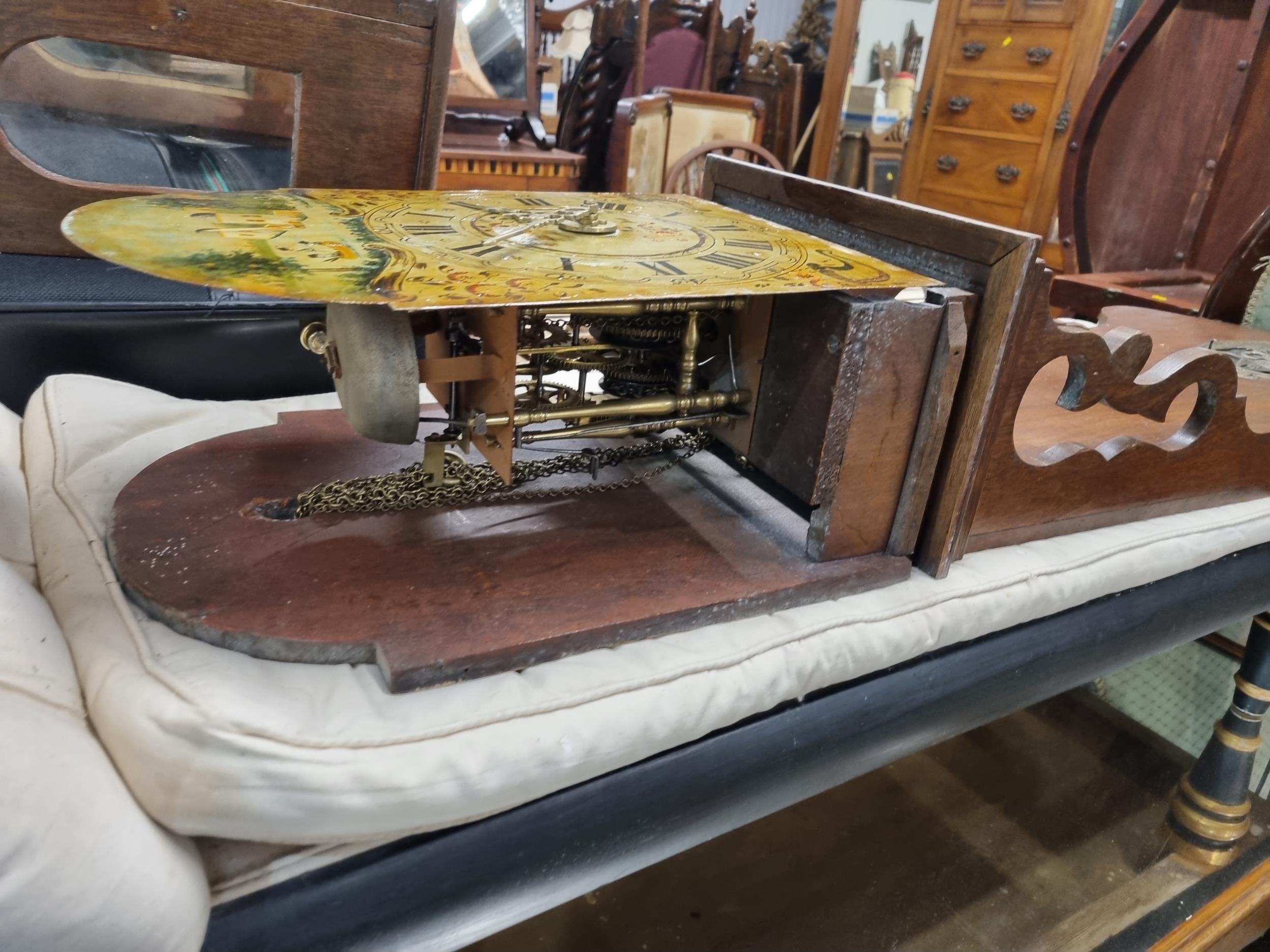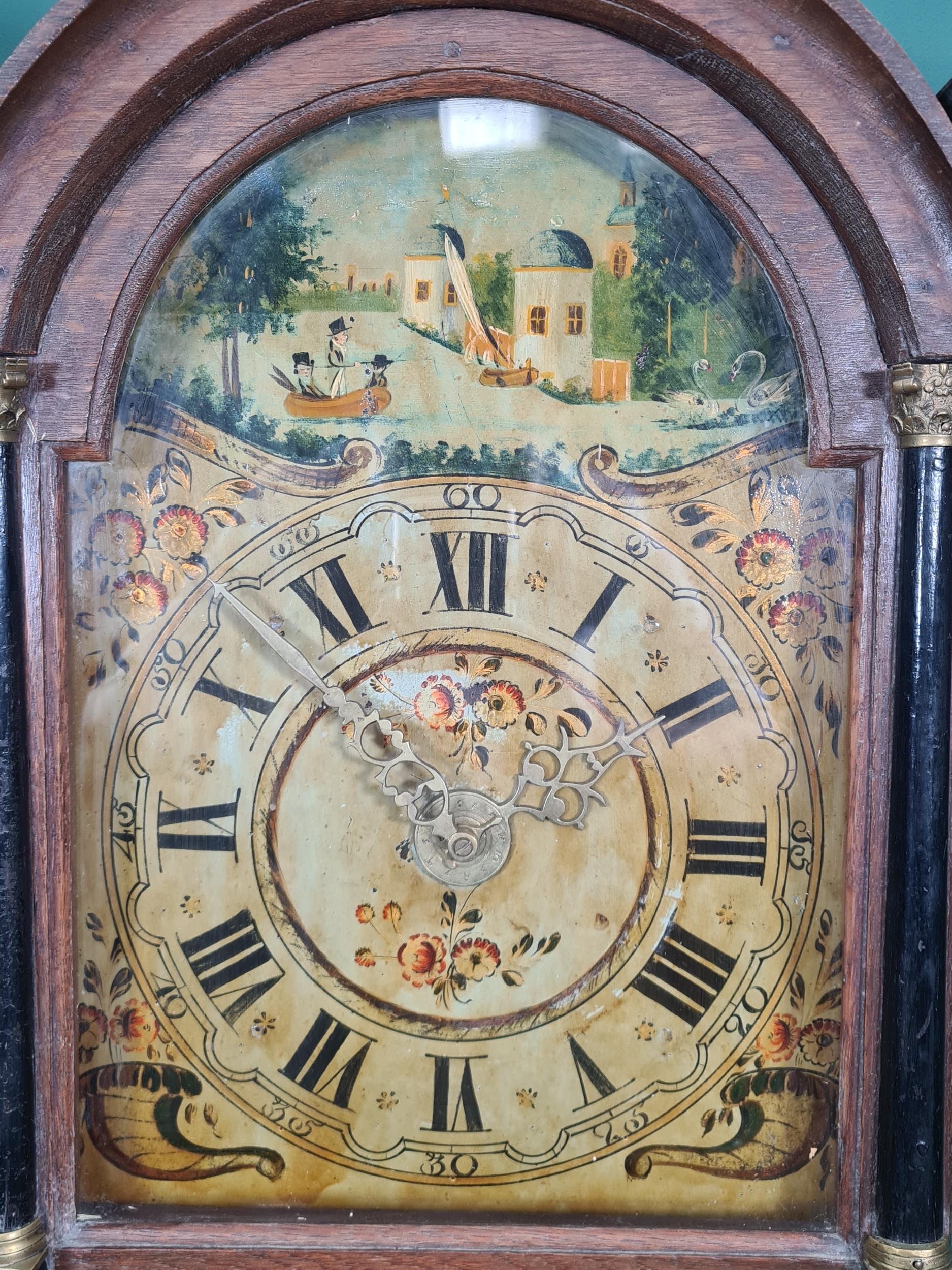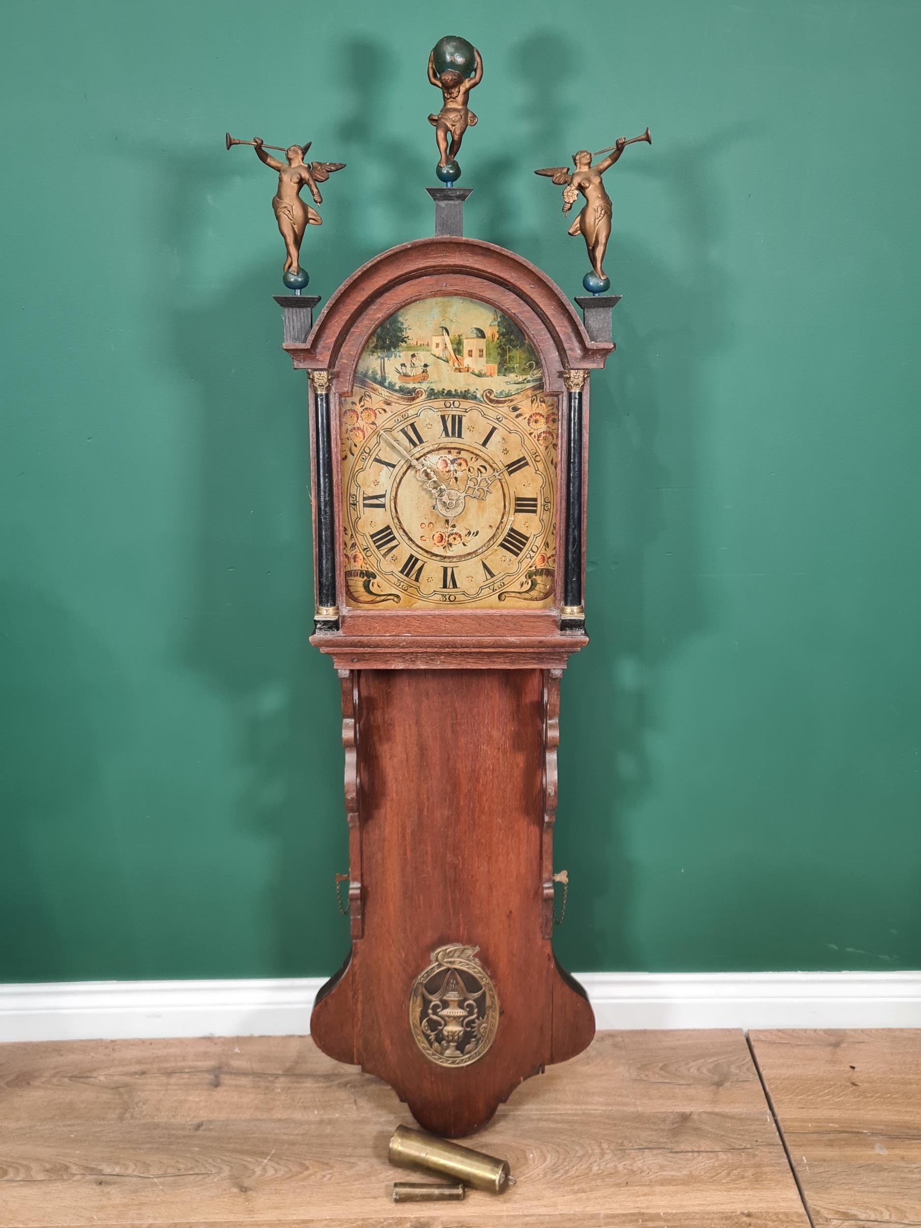 A Dutch oak cased Wall Clock with painted arched dial depicting fishing scenes with figural decorations, complete with weights, (R3)