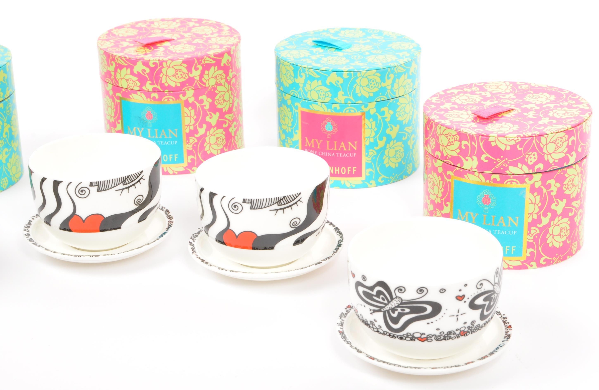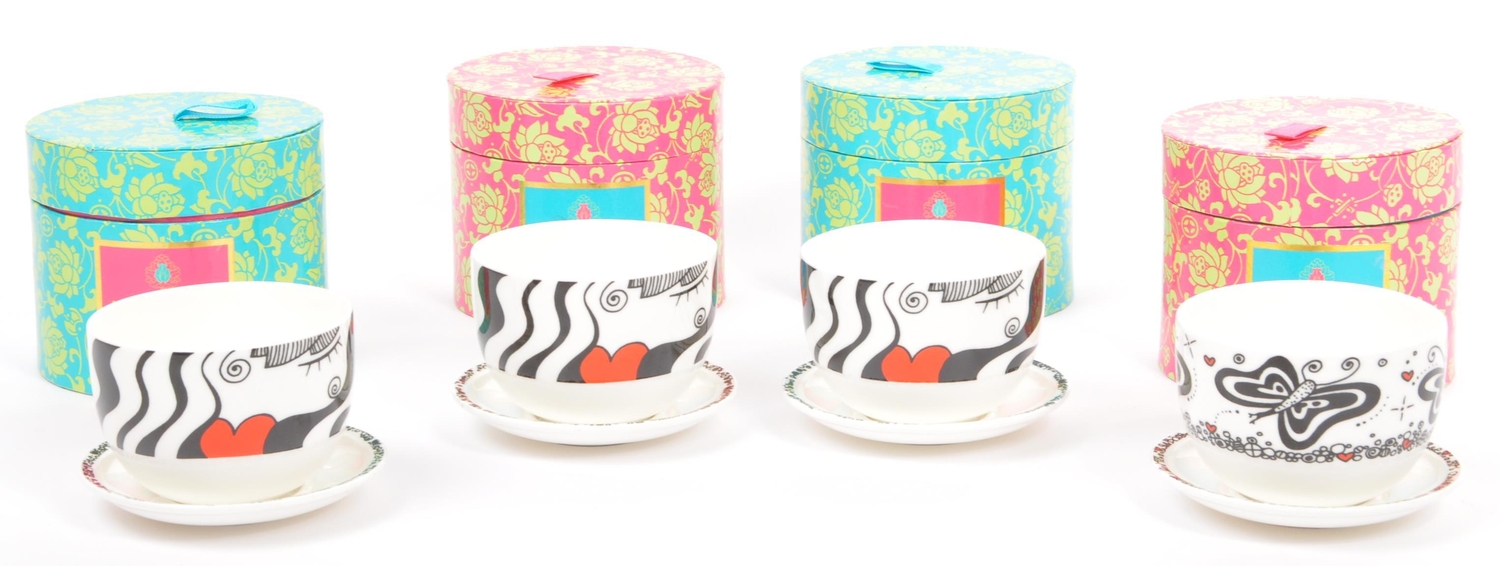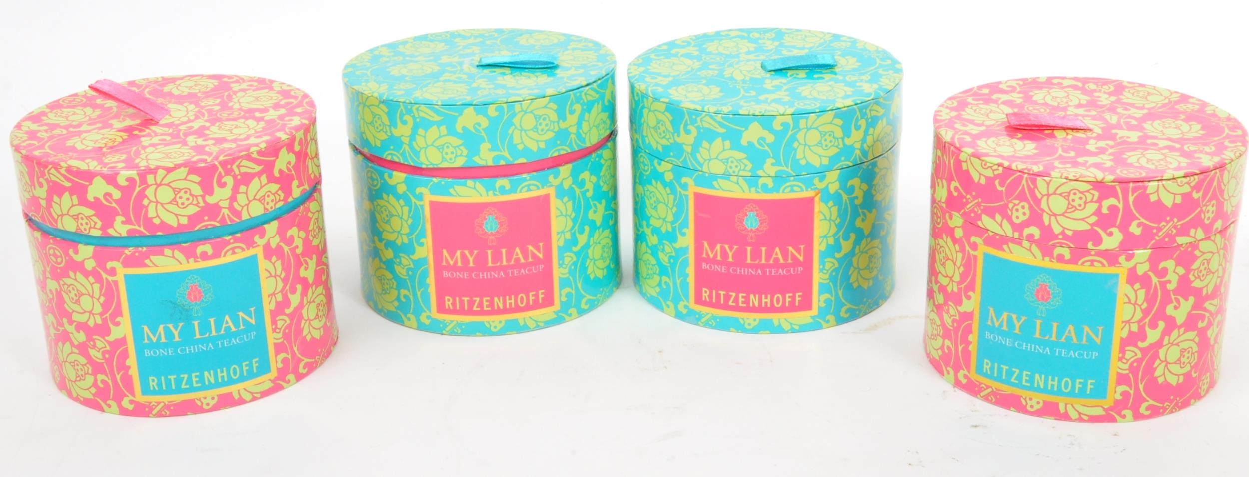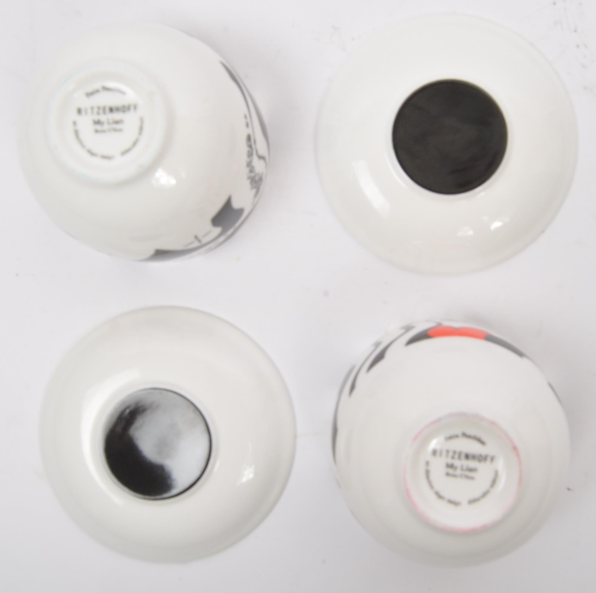 A set of four boxed NOS New Old Stock Ritzenhoff My Lian china teacup and saucers having abstracted monochrome design. Designed by Pera Peschkes. Measures approx. 13cm tall.
