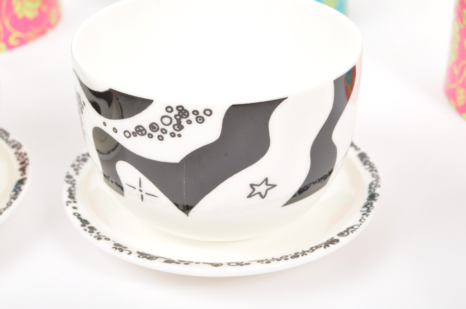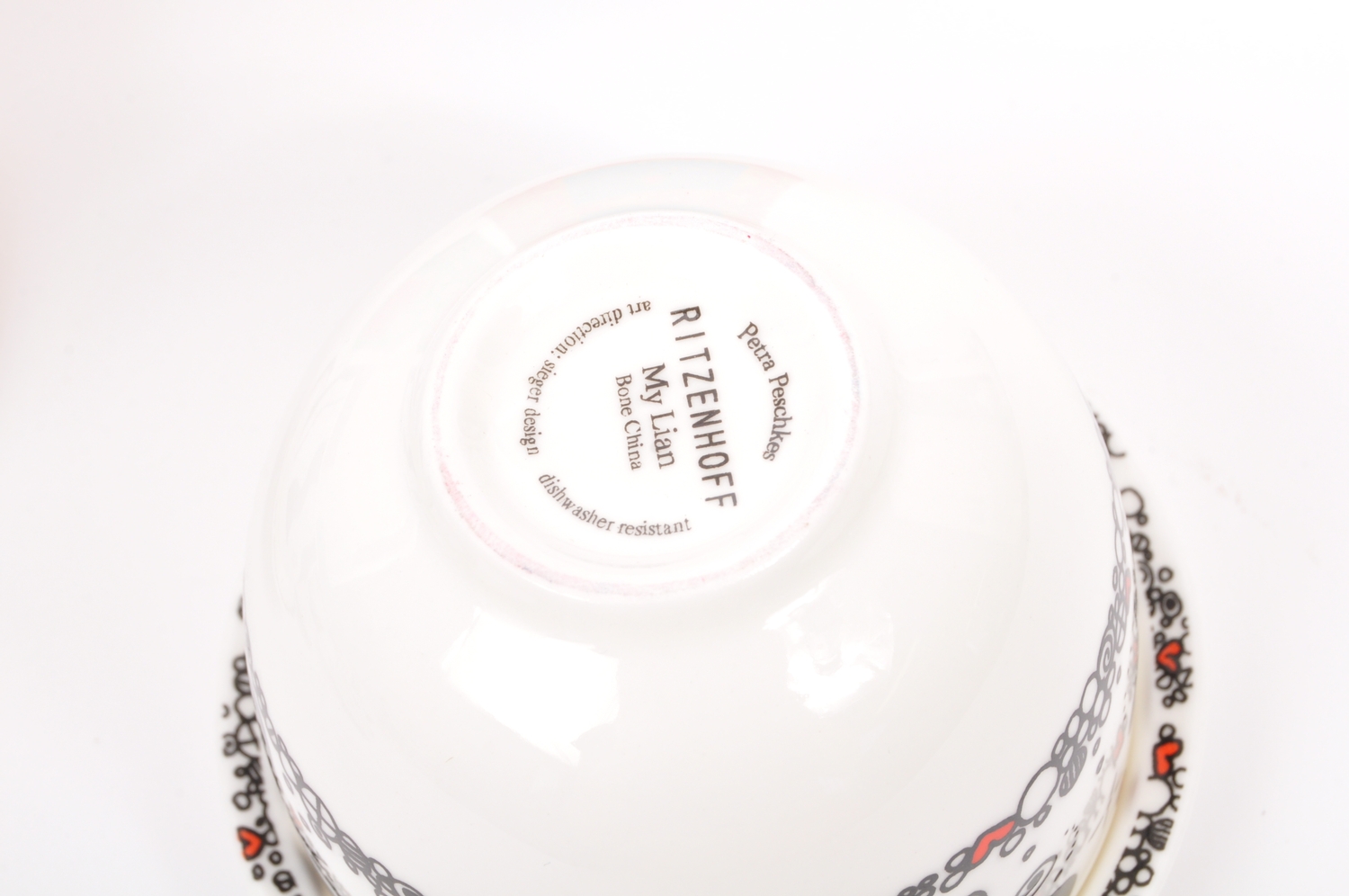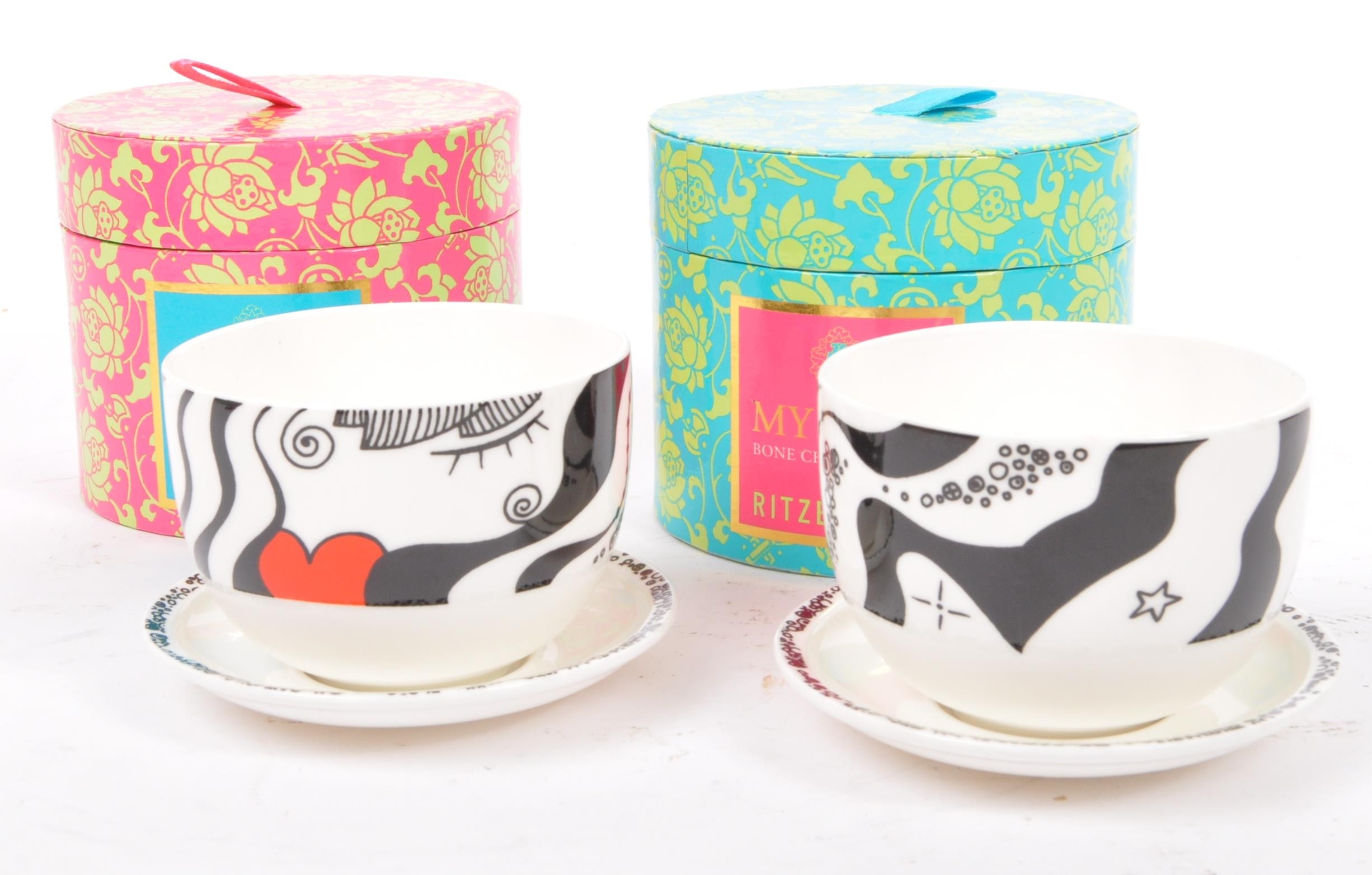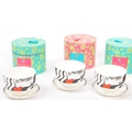 A set of four boxed NOS New Old Stock Ritzenhoff My Lian china teacup and saucers having abstracted monochrome design. Designed by Pera Peschkes. Measures approx. 13cm tall.