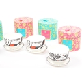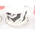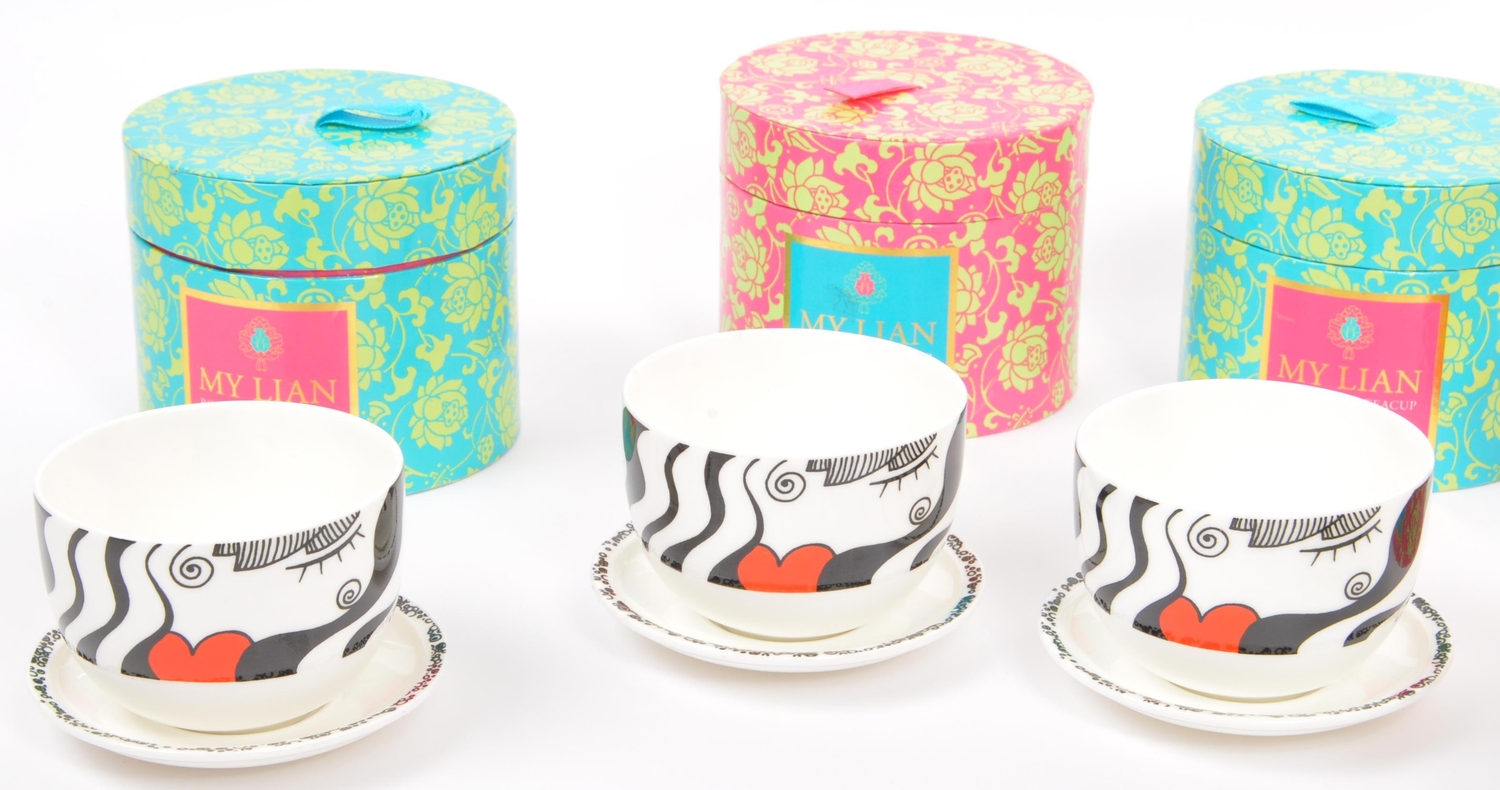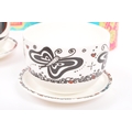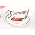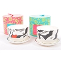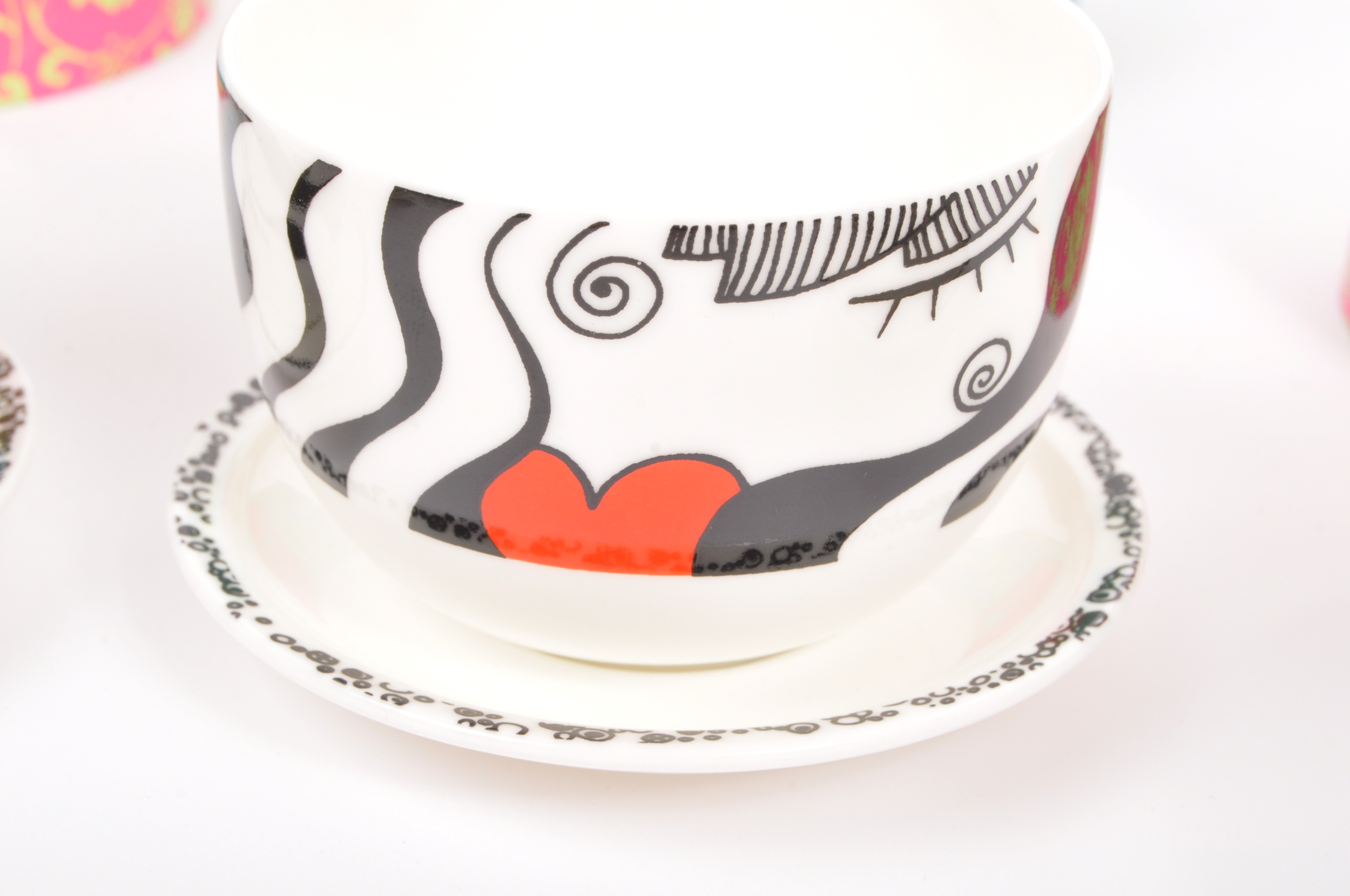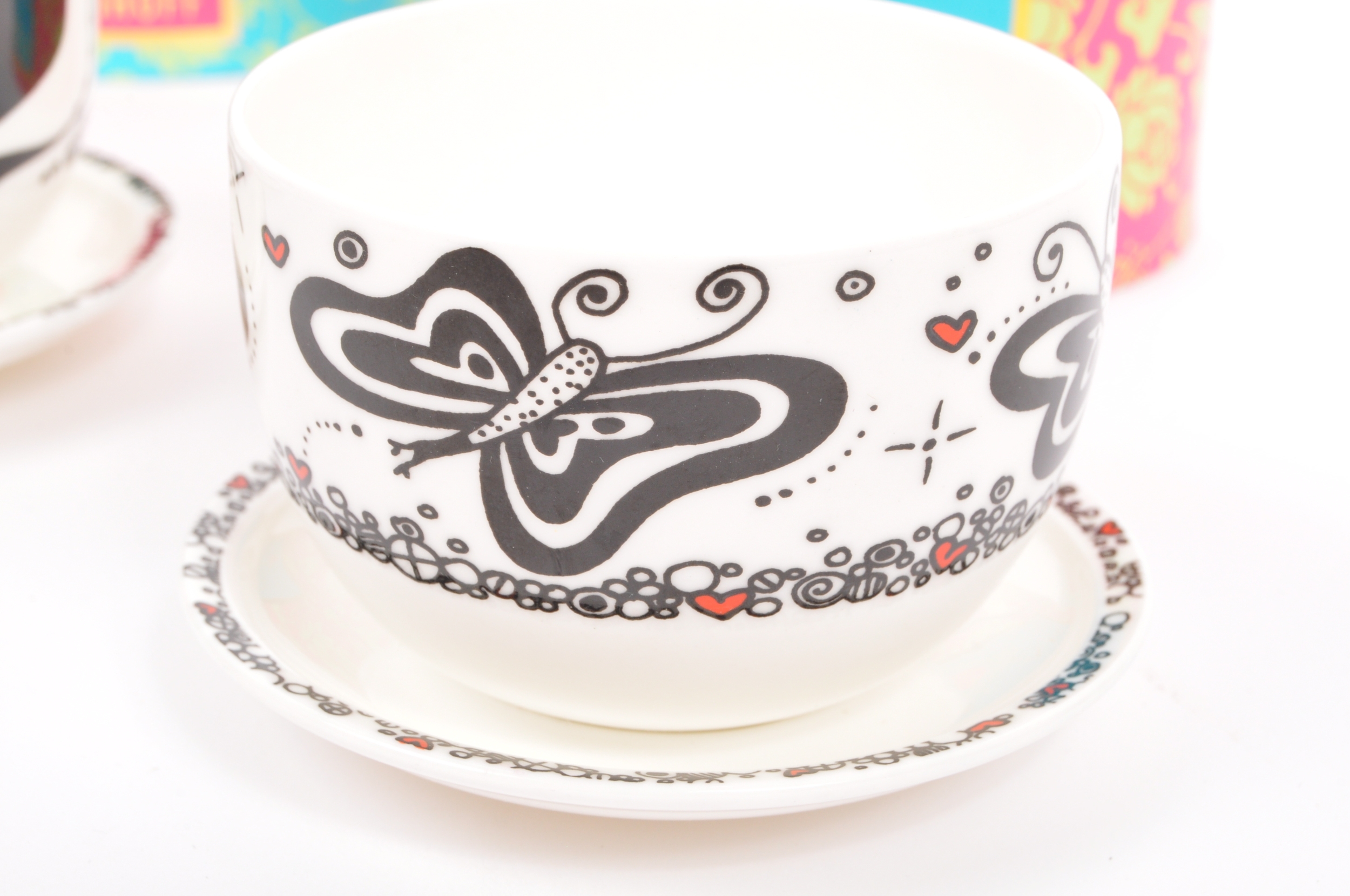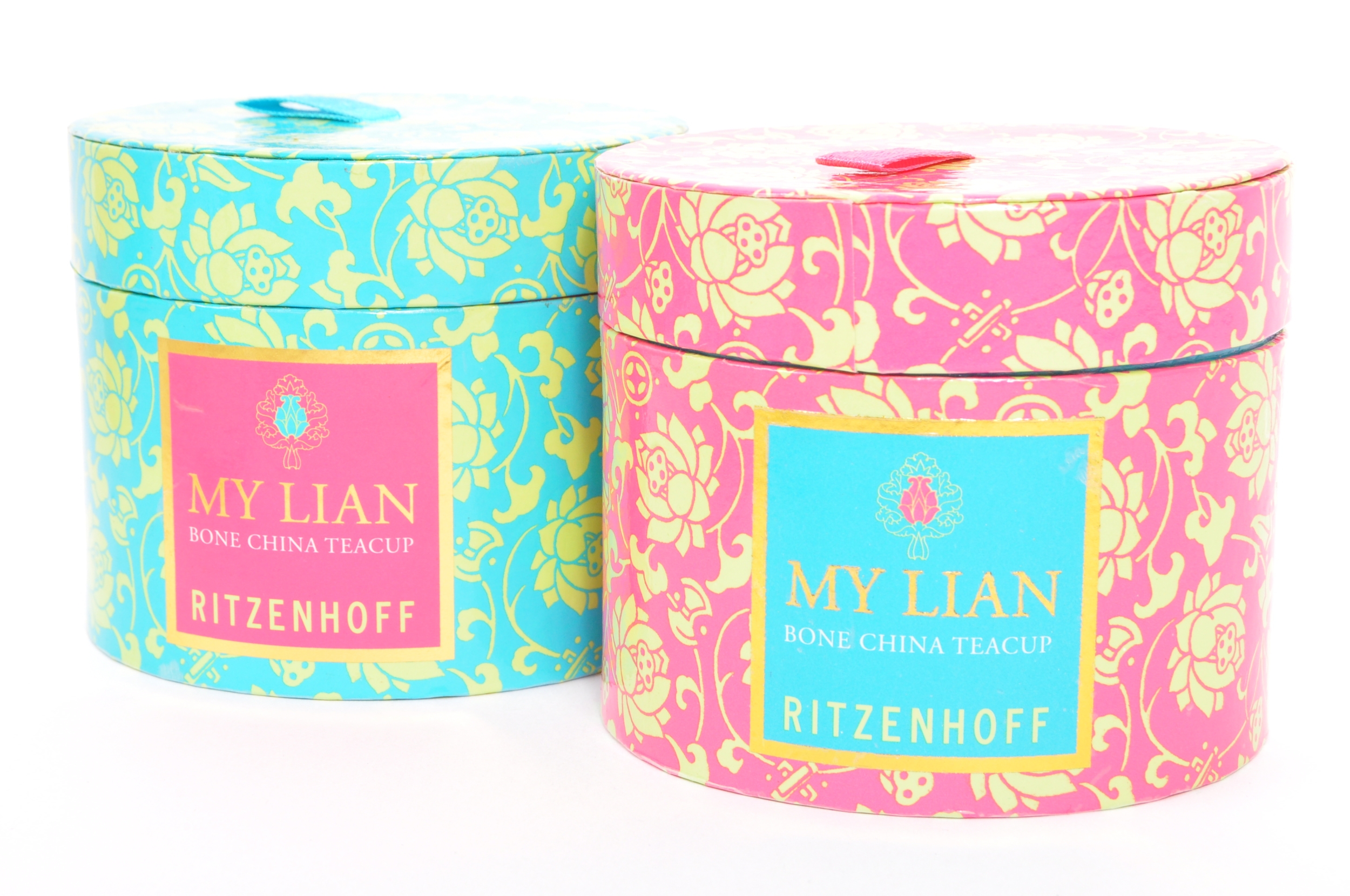 A set of four boxed NOS New Old Stock Ritzenhoff My Lian china teacup and saucers having abstracted monochrome design. Designed by Pera Peschkes. Measures approx. 13cm tall.
