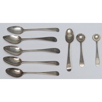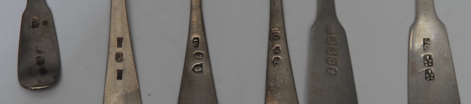 Scottish Provincial Silver - a Pointed Old English pattern teaspoon, James Douglas, Dundee c.1795; others, conforming maker; a Fiddle pattern salt spoon, marked CR, thistle, TL?; another, maker JG; another, Adam Burgess, Dumfies, c.1840 (6)