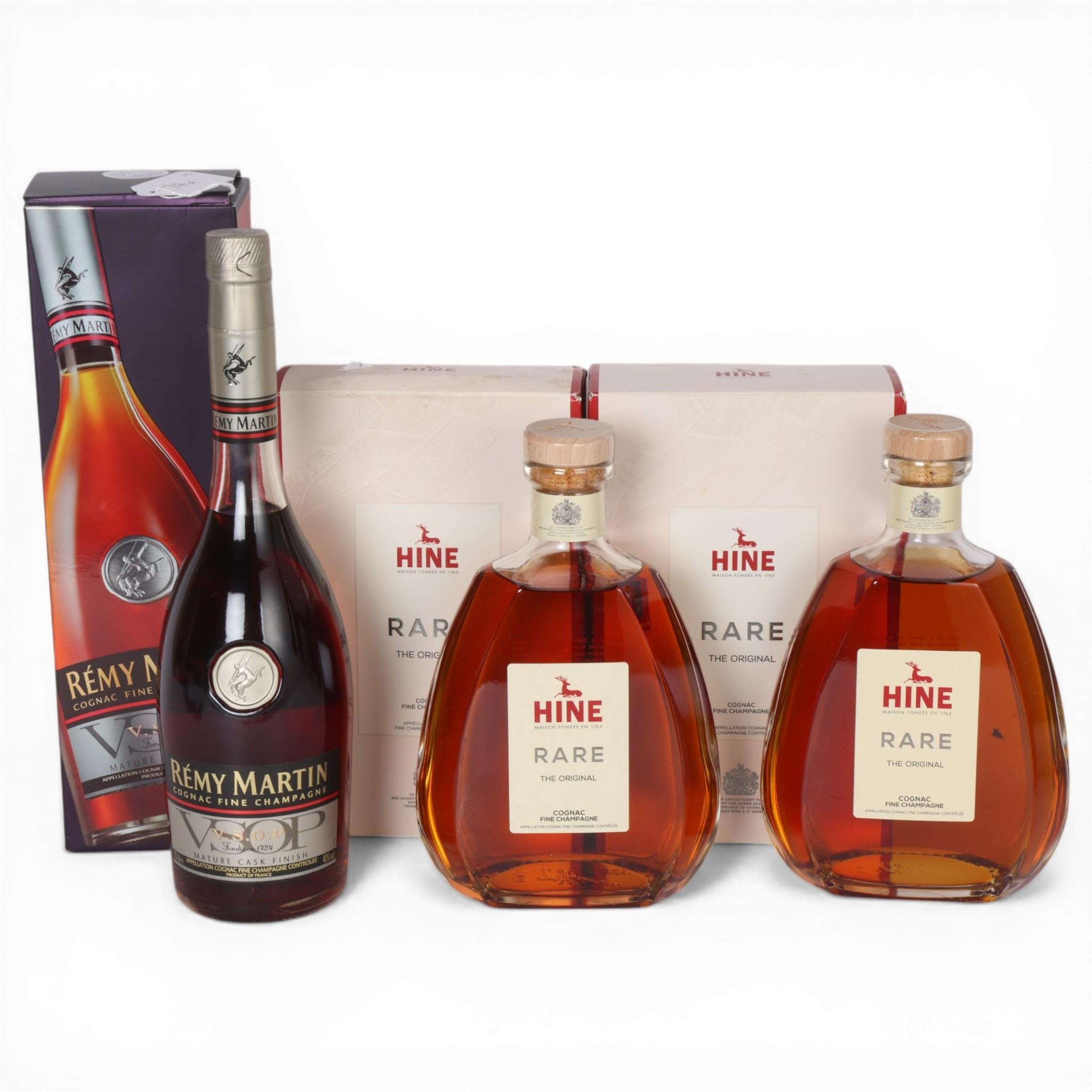 3 bottles of Fine Champagne cognac, 2 Hine The Original Rare 70cl boxed and Remy Martin VSOP Mature Cask Finish, 70cl, boxed