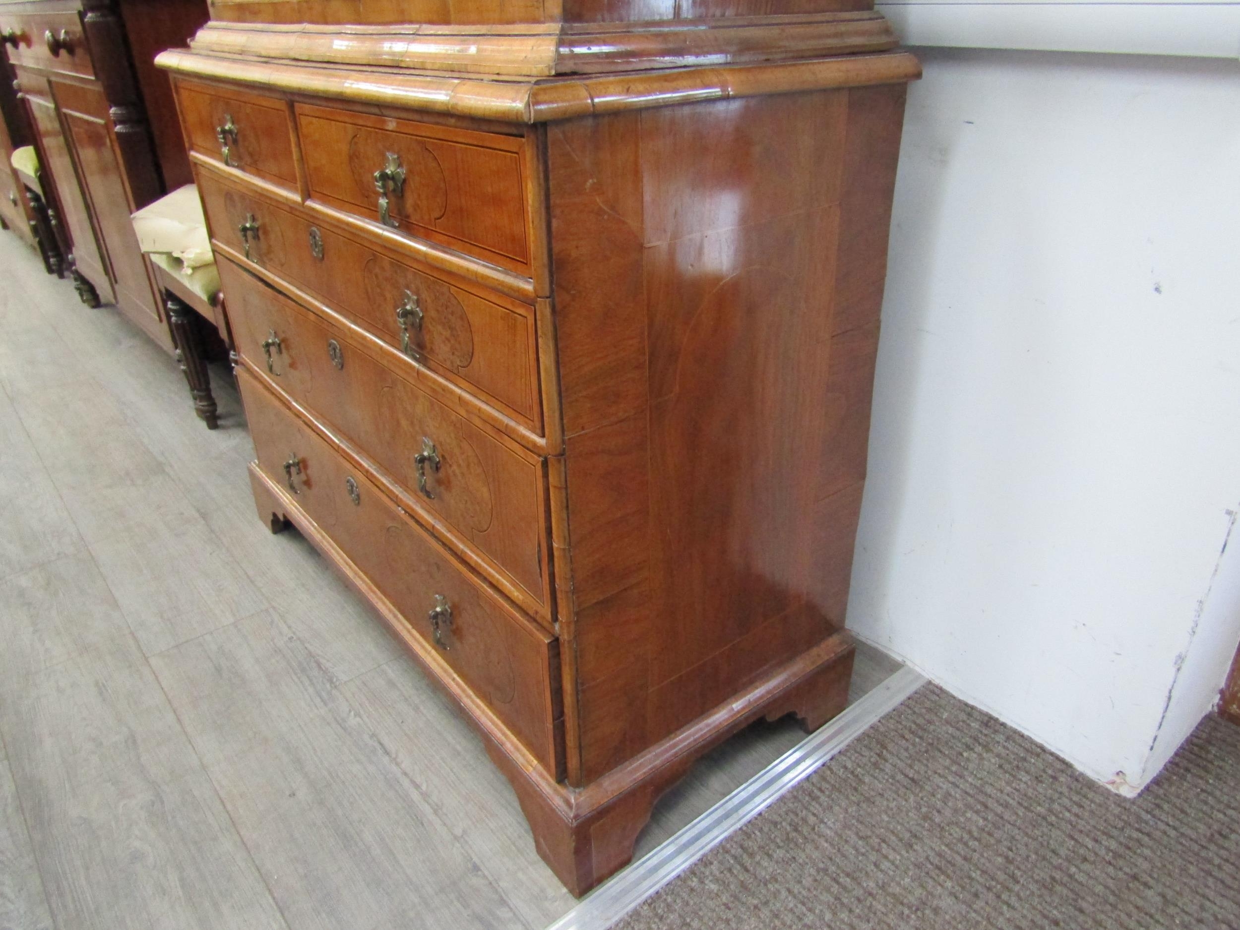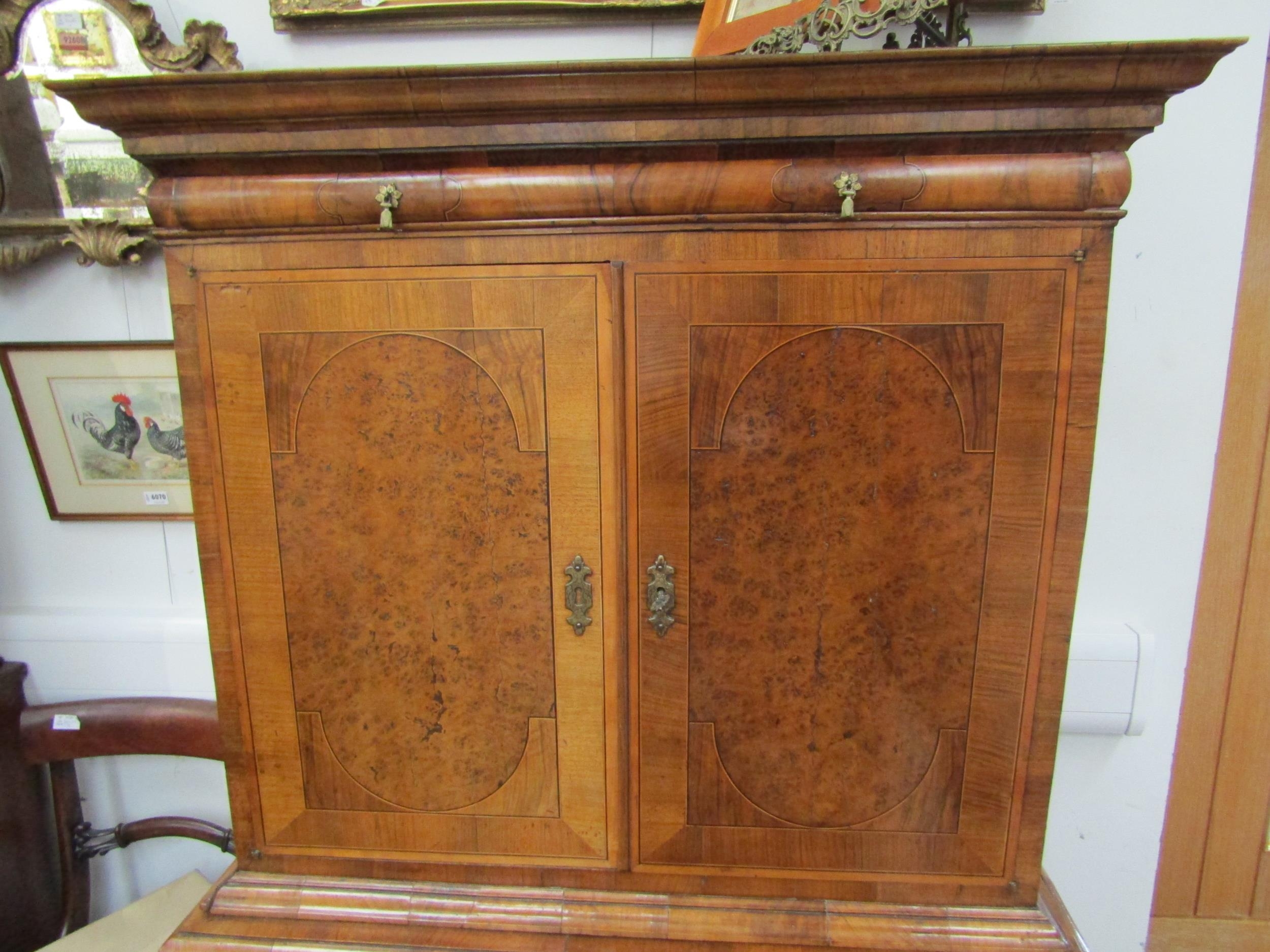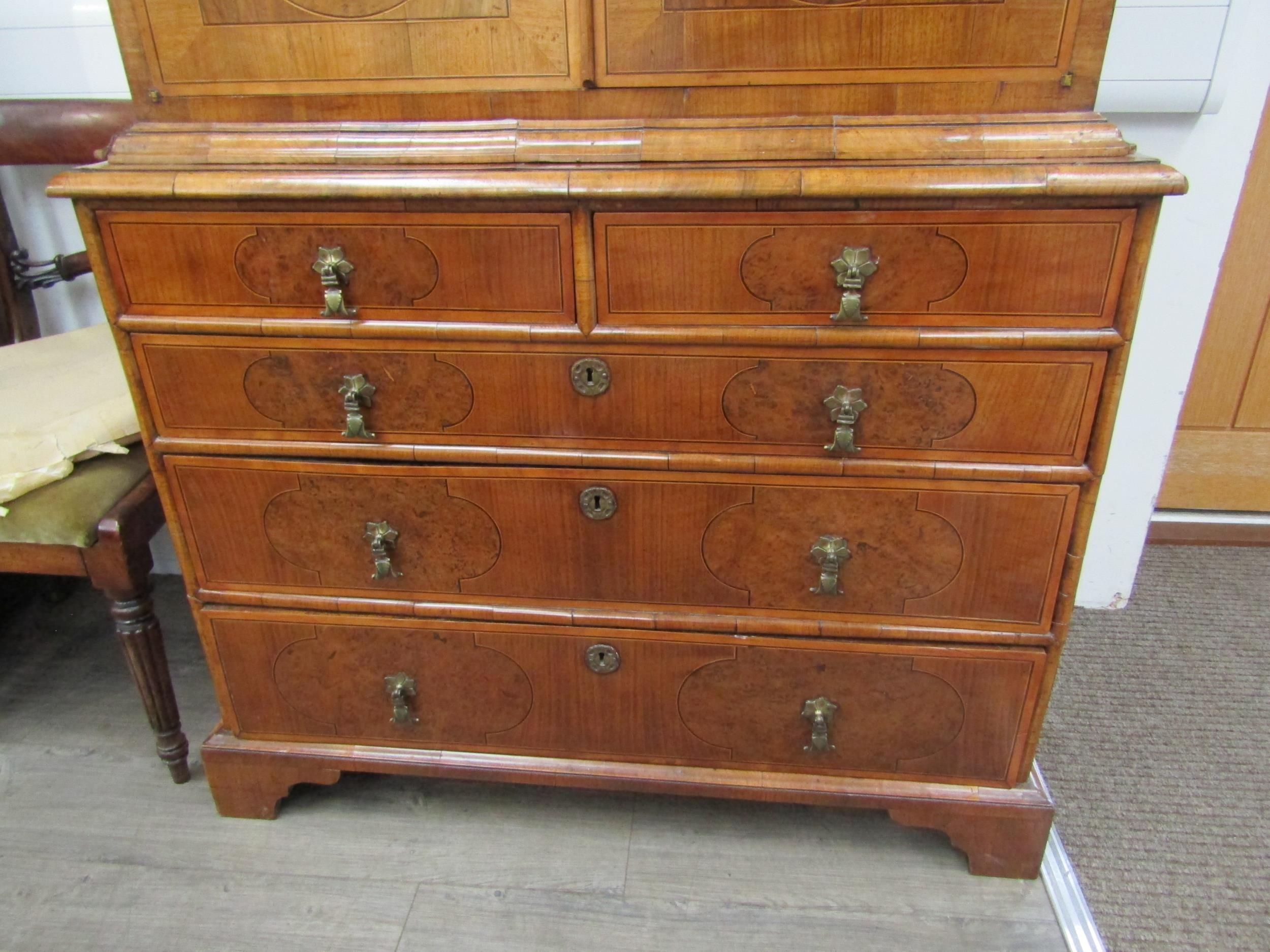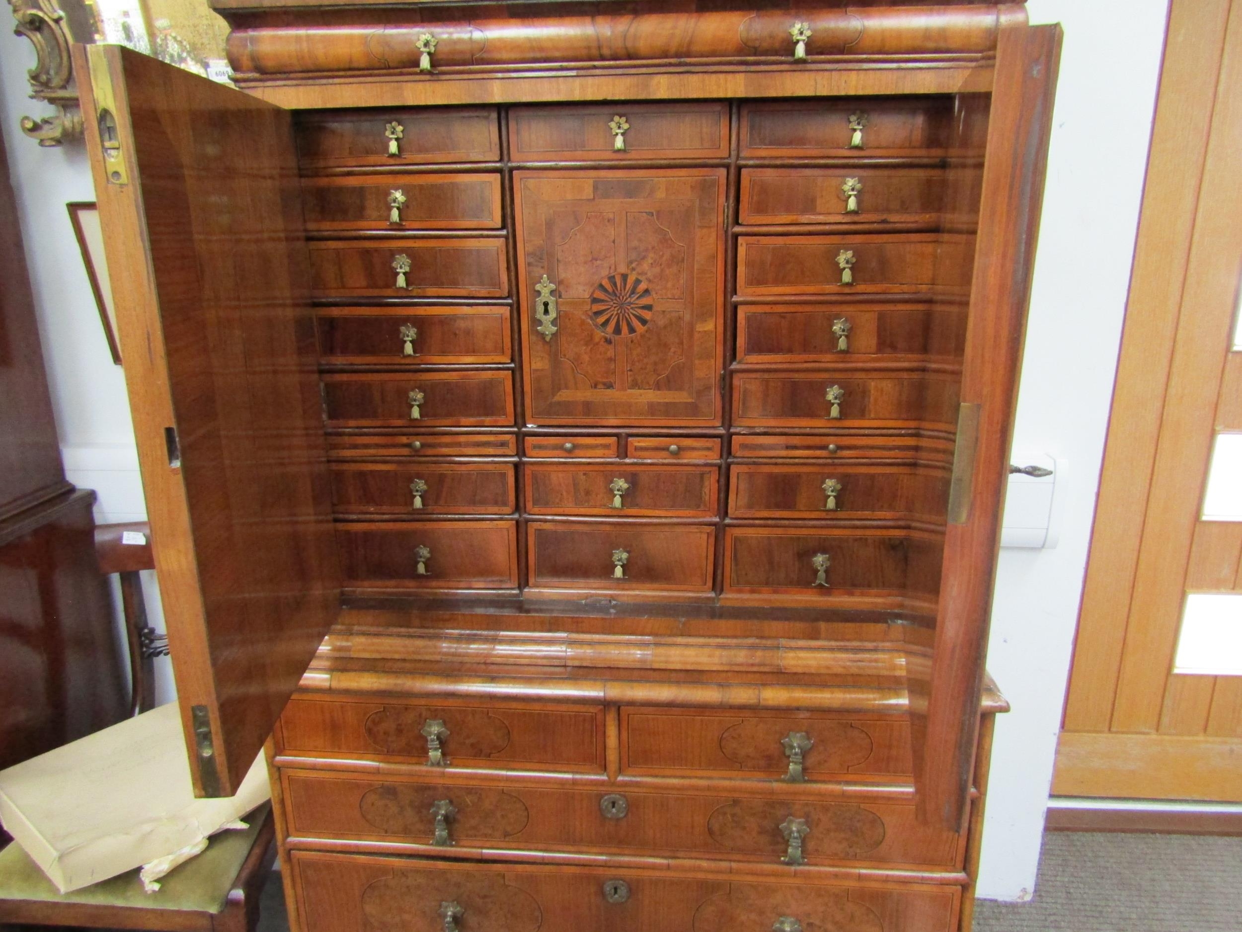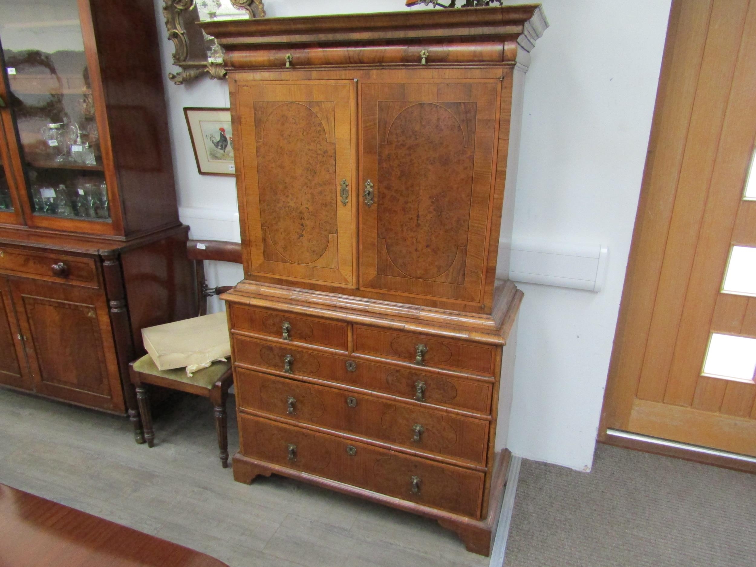 A William & Mary burr walnut veneered cabinet on chest, ogee pediment over single top drawer. The doors opening to reveal a multi-drawer and cupboard interior. All standing on a chest of two over three graduated drawers, some later restoration with purchase receipt 170cm x 103cm x 45cm