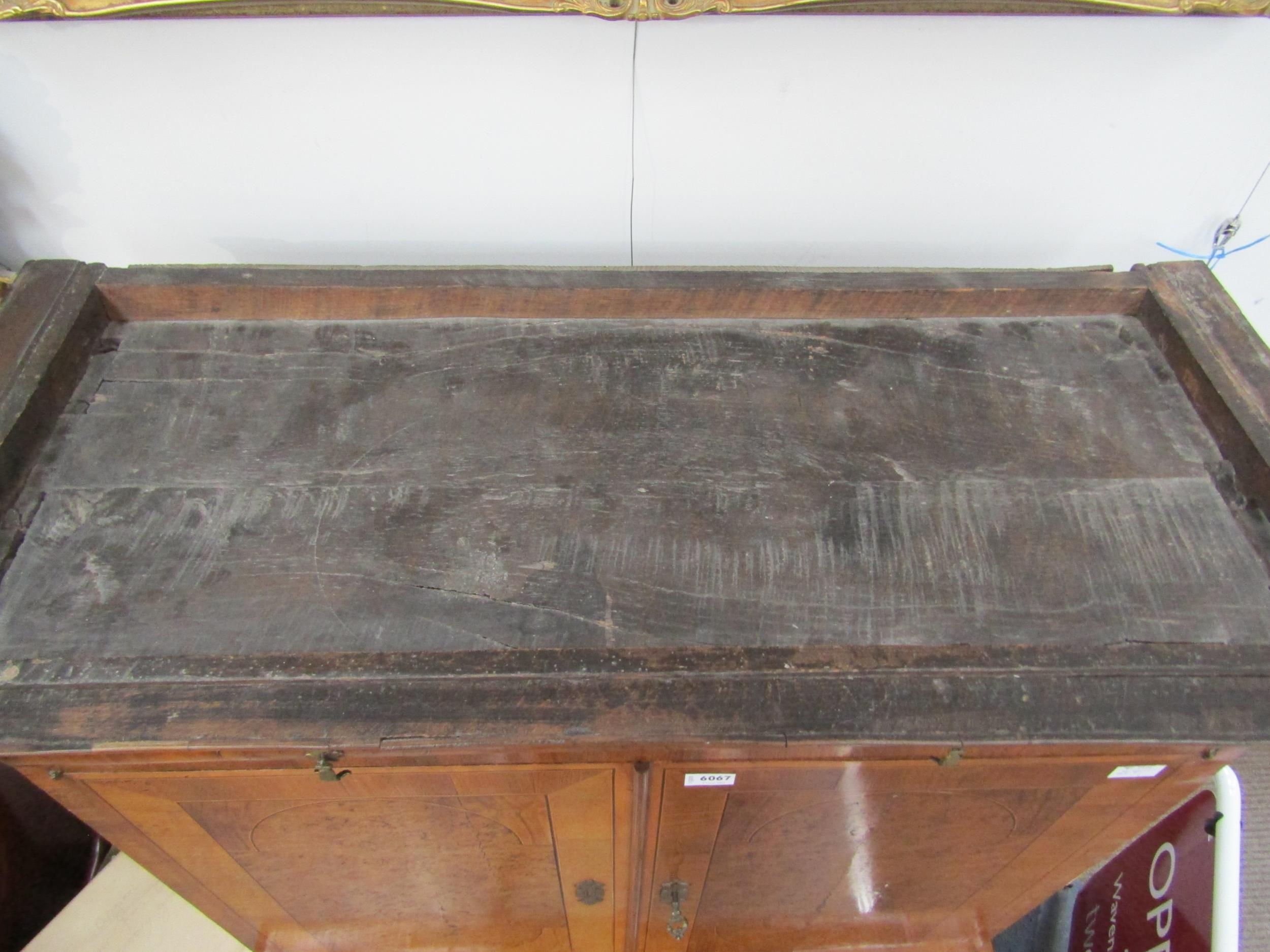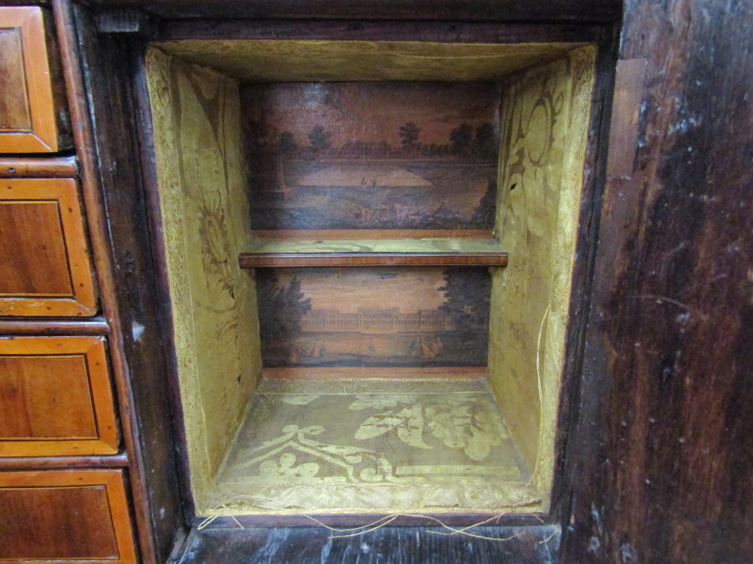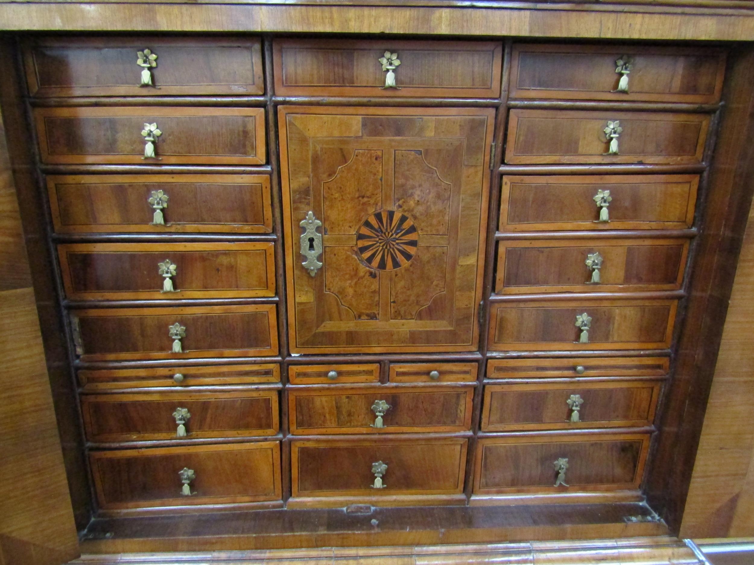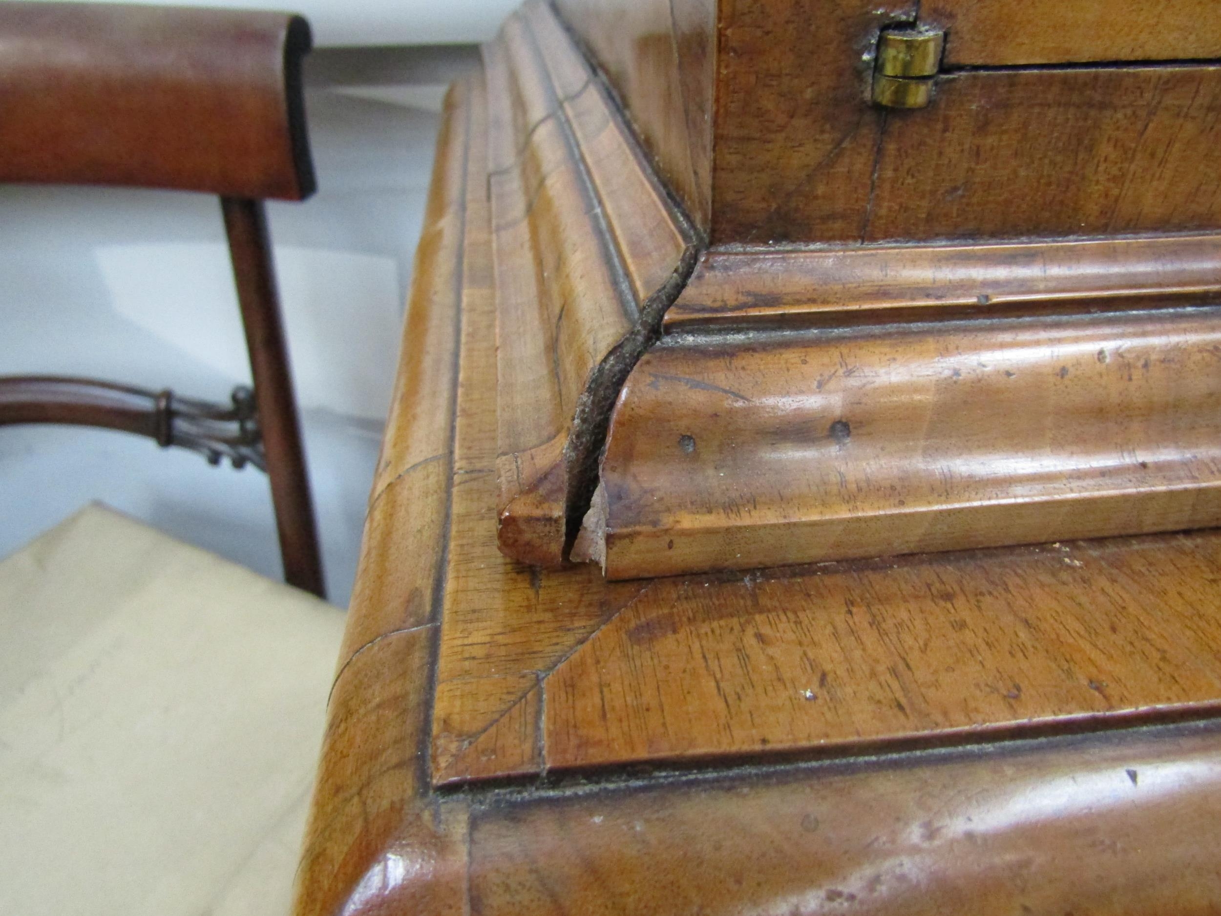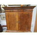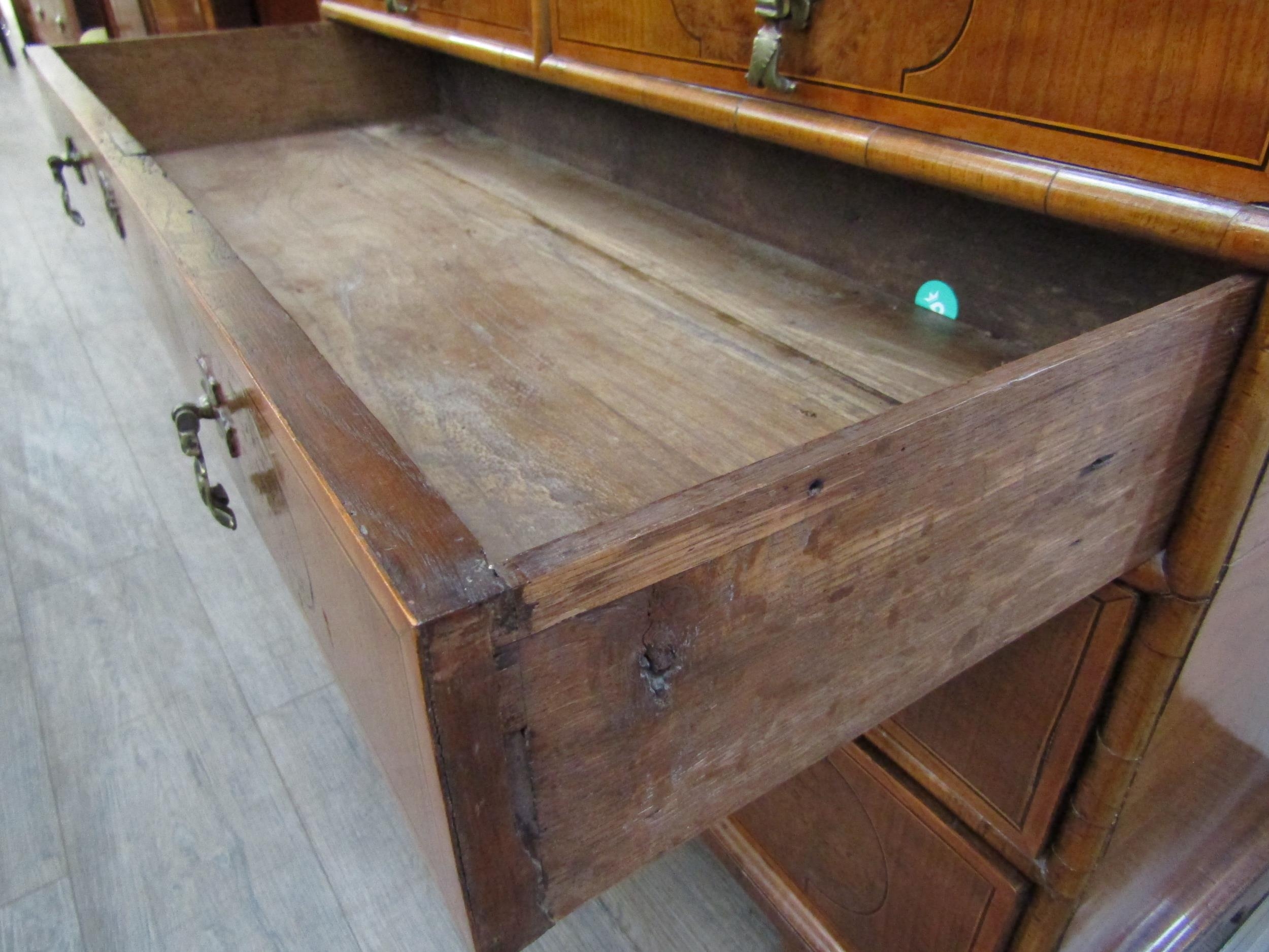 A William & Mary burr walnut veneered cabinet on chest, ogee pediment over single top drawer. The doors opening to reveal a multi-drawer and cupboard interior. All standing on a chest of two over three graduated drawers, some later restoration with purchase receipt 170cm x 103cm x 45cm