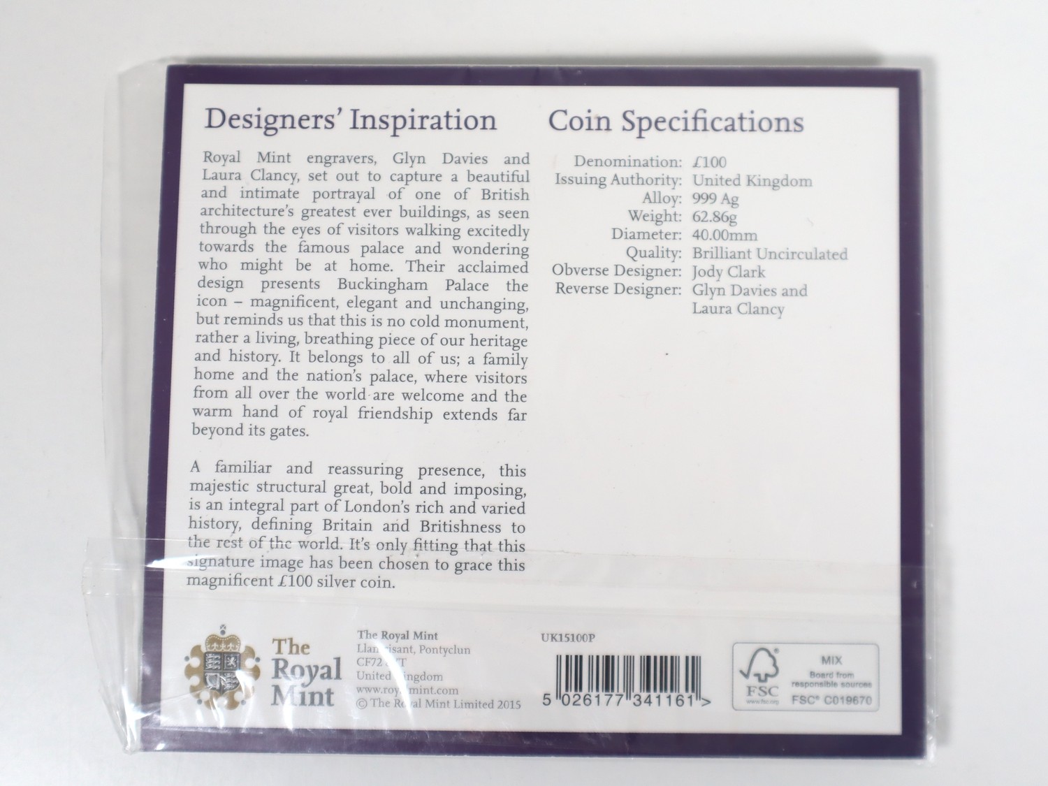 2015 UK £100 Fine Silver Coin Buckingham Palace 999A 62.86g