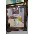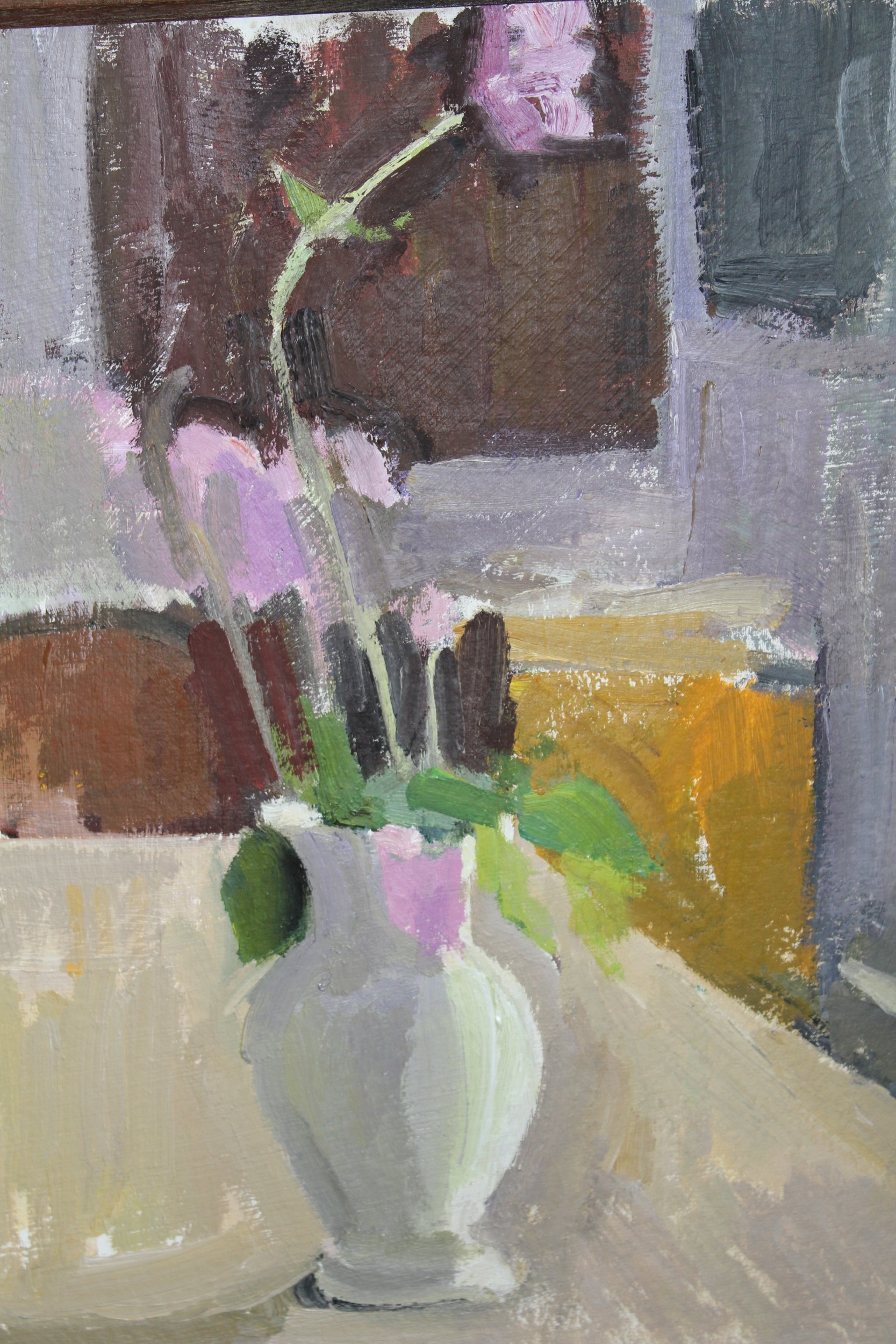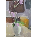 Follower of Winfred Nicholson, oil on card, study of pink flowers in a grey vase, 41 x 31cm