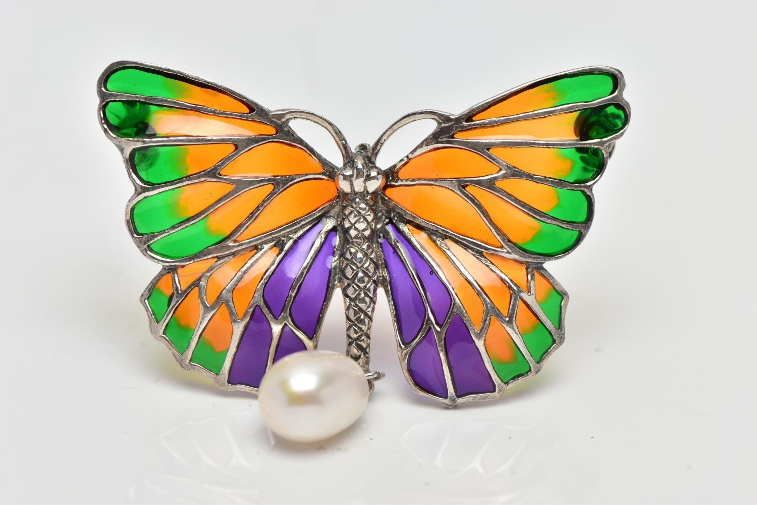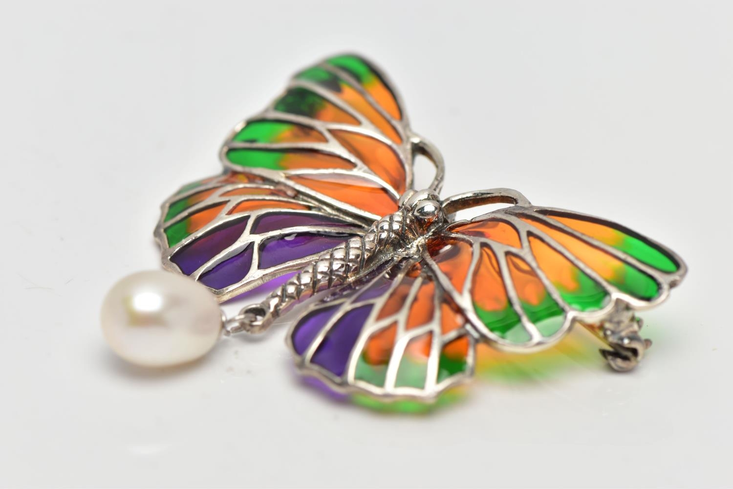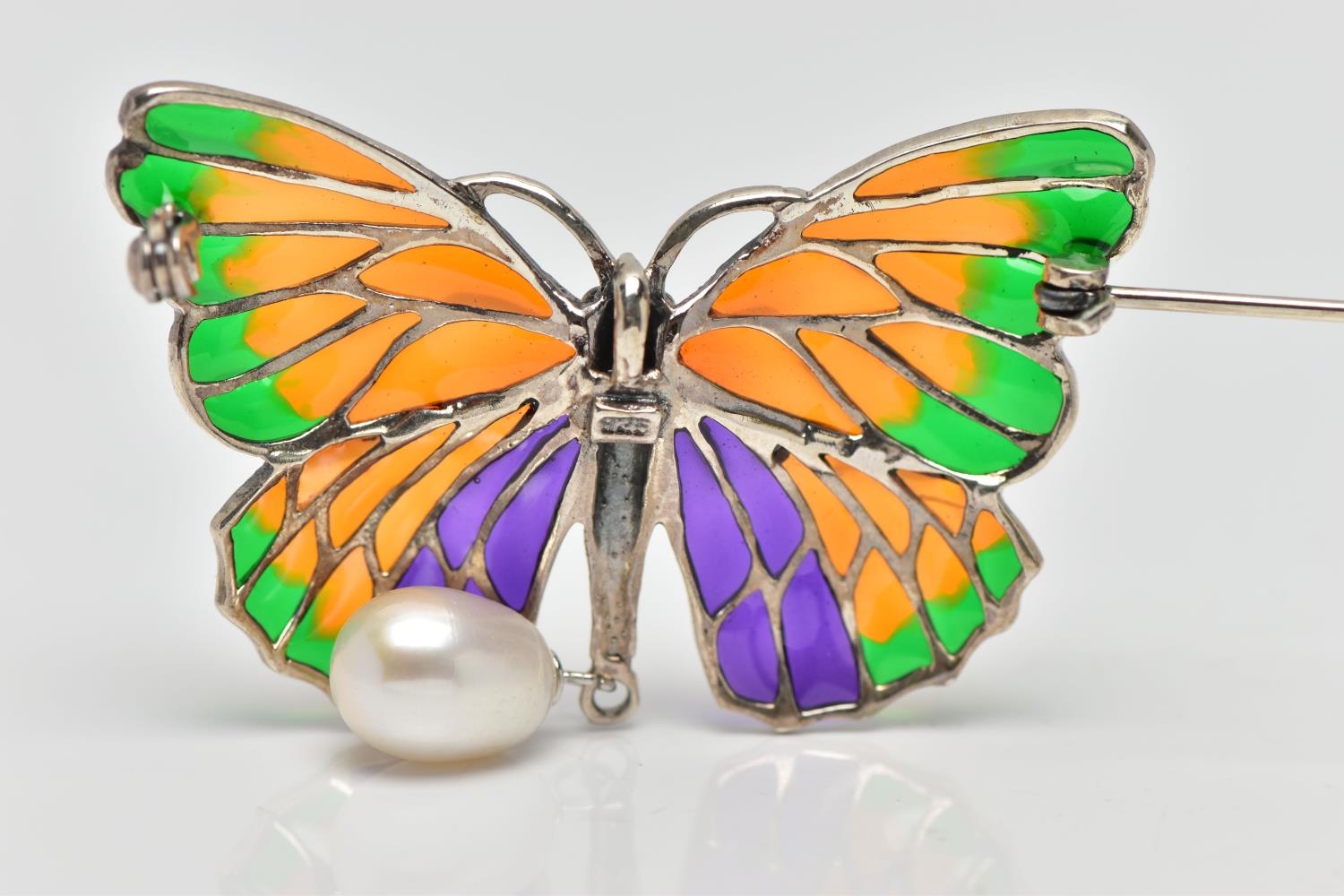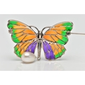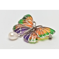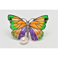 A PLIQUE A JOUR AND CULTURED PEARL BUTTERFLY BROOCH, the textured white metal body, with orange, green and purple plique a jour enamel wings, suspending a cultured pearl, stamped 925, wingspan 48mm, may be worn as a pendant (condition report: overall very good condition, pin in good working order)