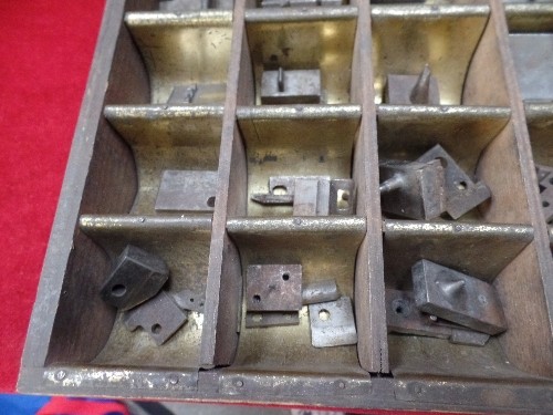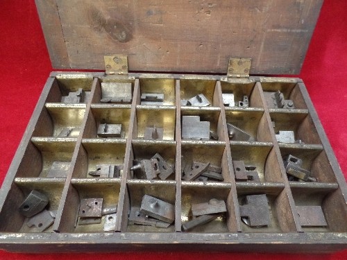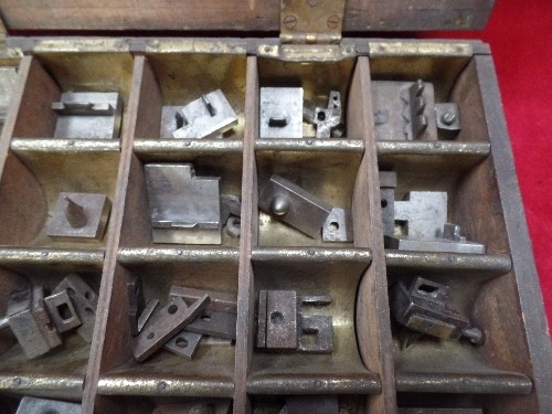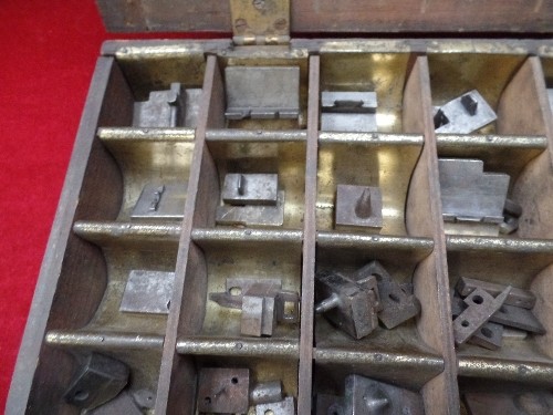 VINTAGE SET OF PRESS DIES OR STAMPS IN A FITTED METAL LINED WOODEN BOX