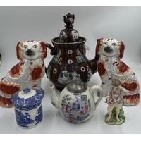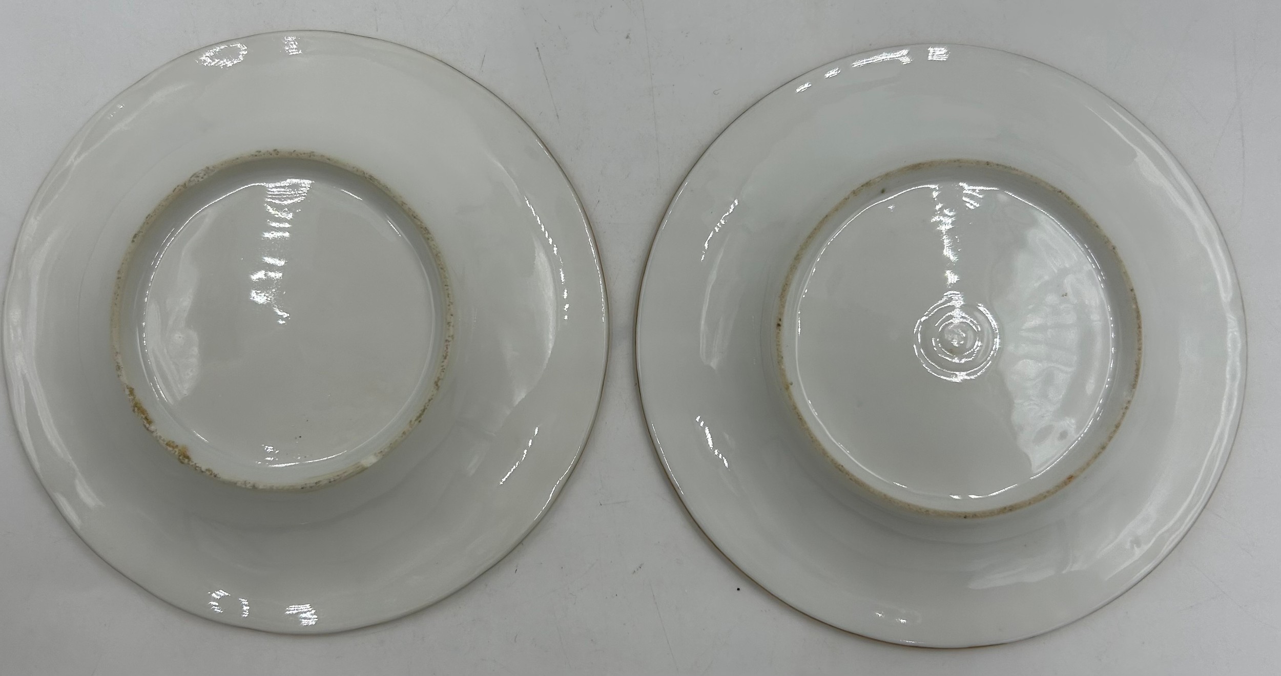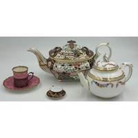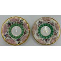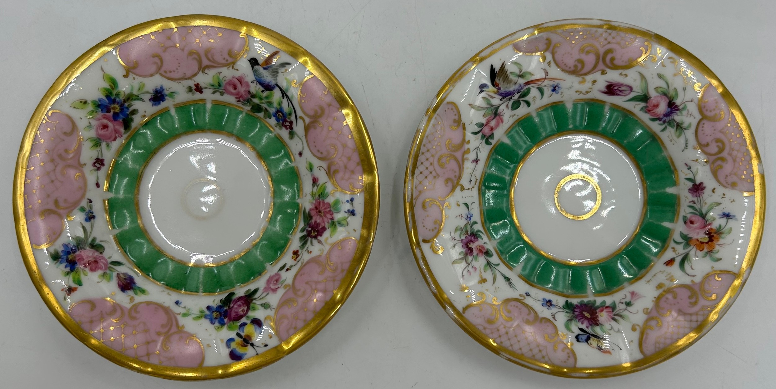 Damage to one foot of cherub. Saucers with paint loss and gilt rub.