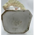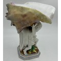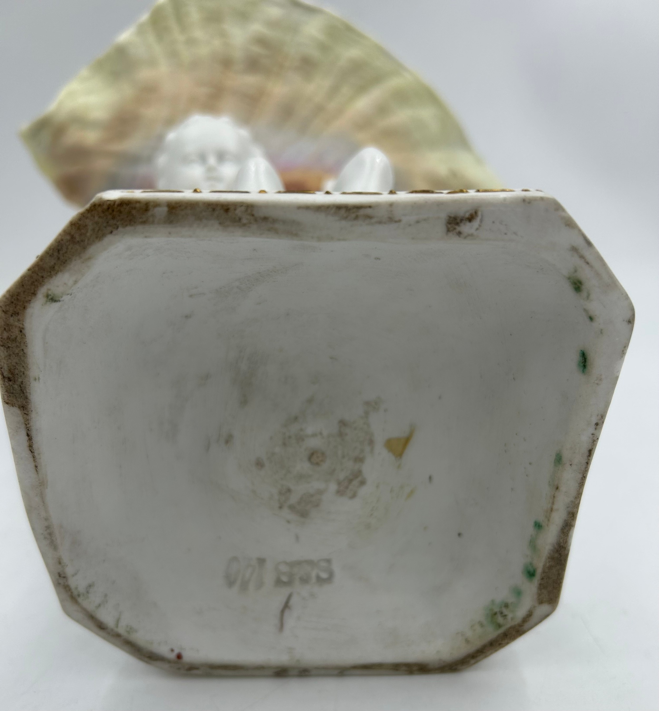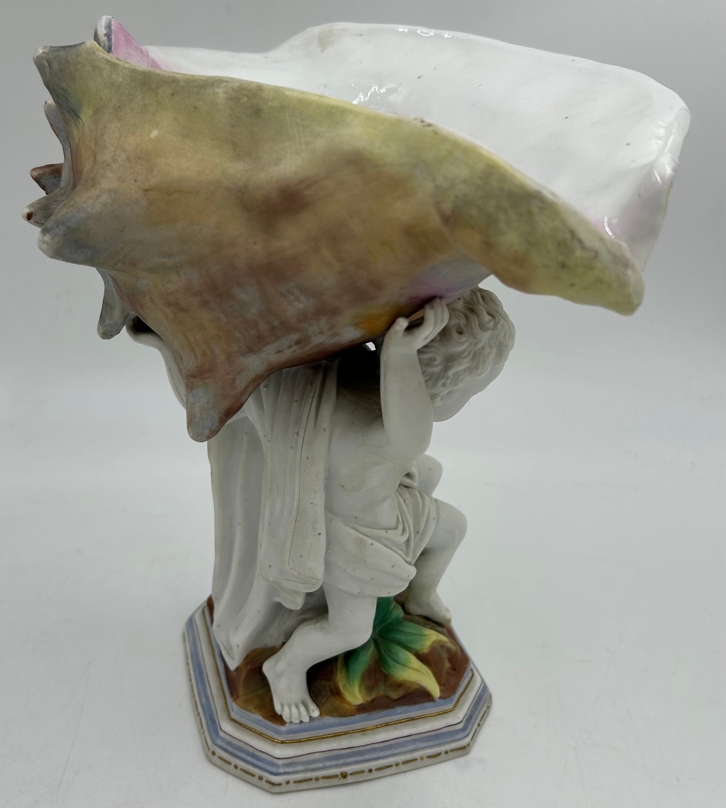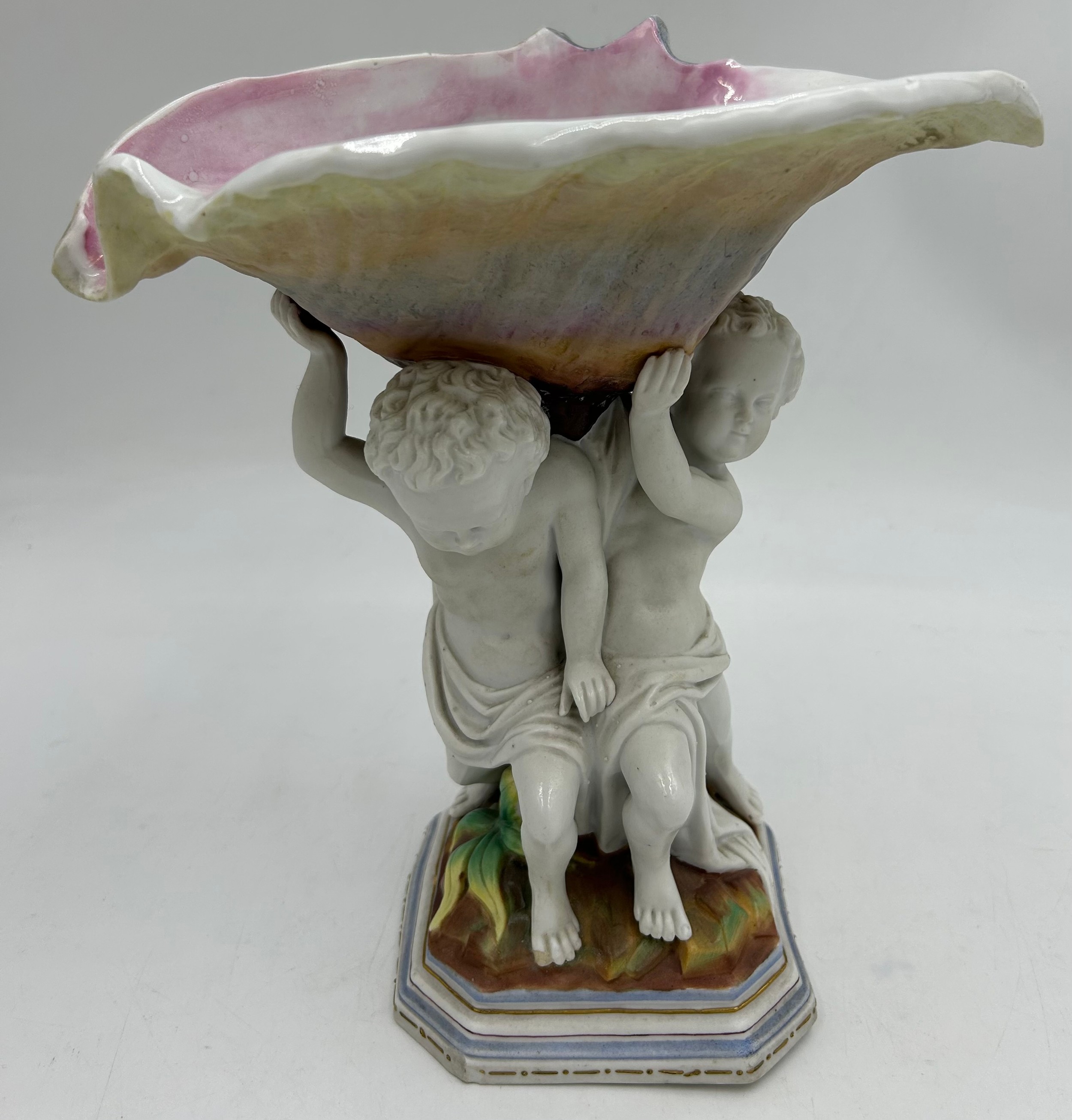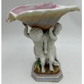 A 19thC hand painted cherub bisque centrepiece with two putti and seashell together with 2 x hand painted saucers. (3).