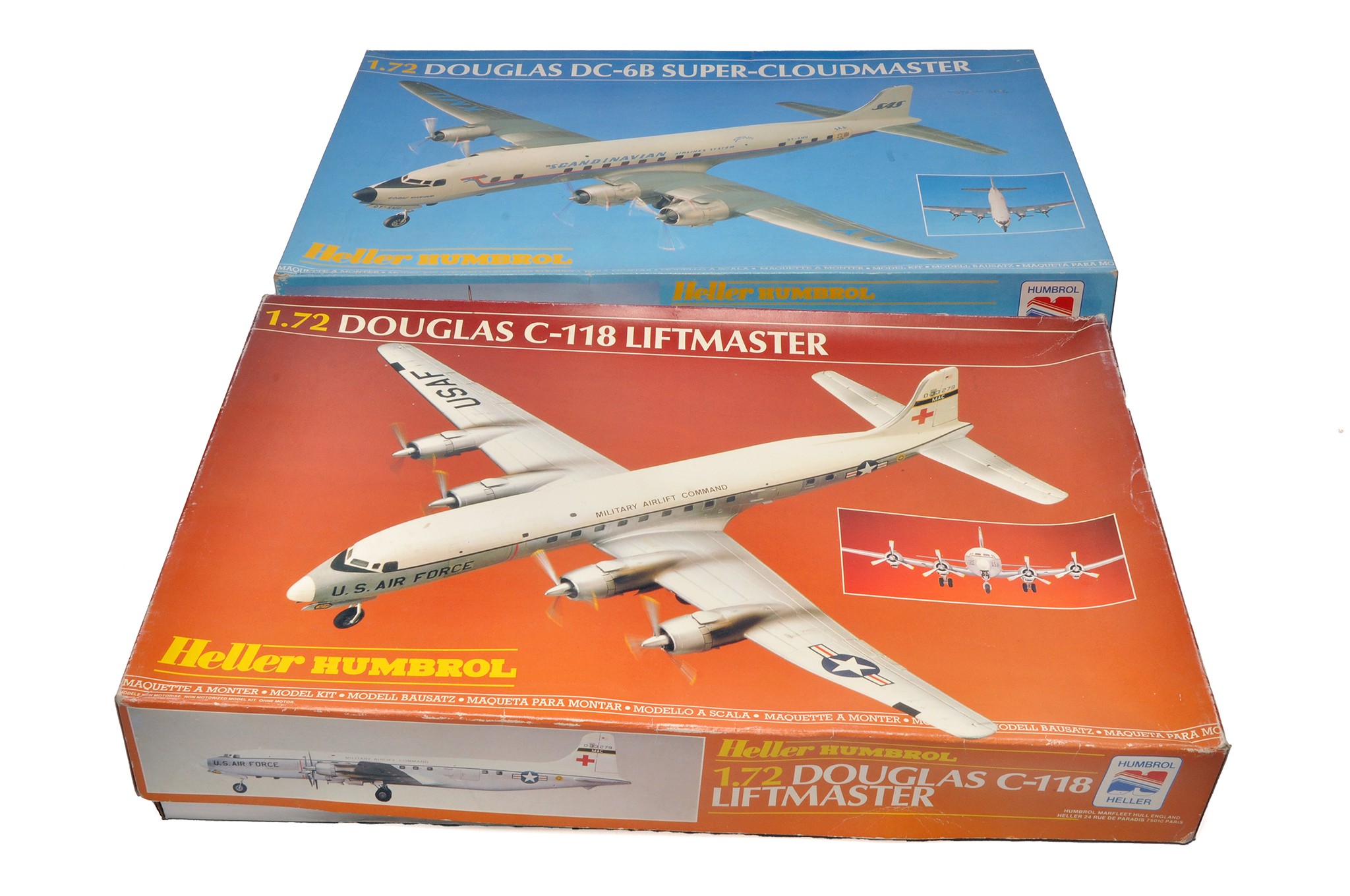 Heller 1/72 plastic model aircraft kit duo comprising the Douglas DC-6B Cloudmaster and Douglas C-118 Liftmaster. Both complete,