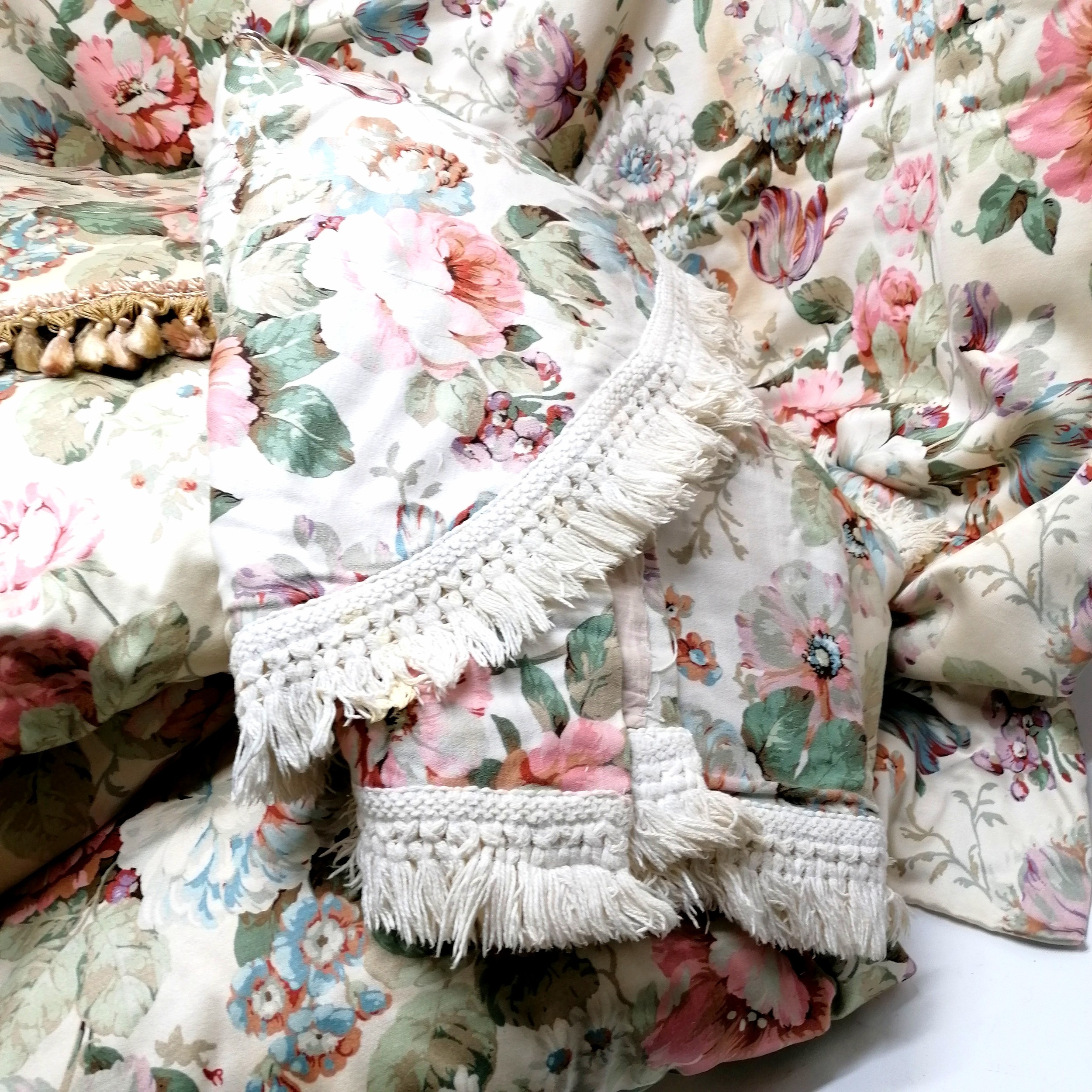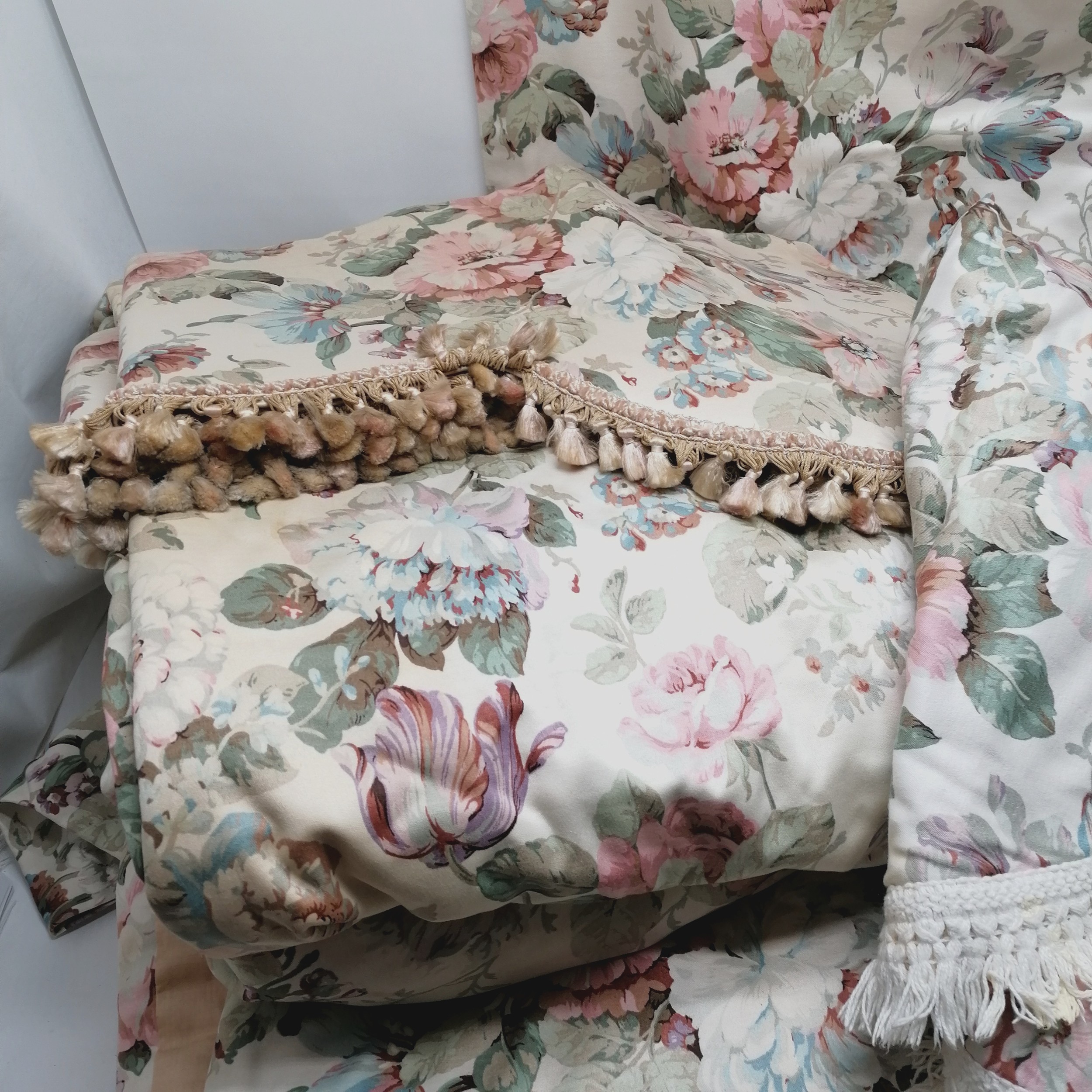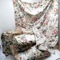 Sanderson Pannilar fabric interlined curtains 2 x 60cm wide x 210 long ans 2 x 140cm wide x 210cm long T/w pelmet and a bedspread - have some wear