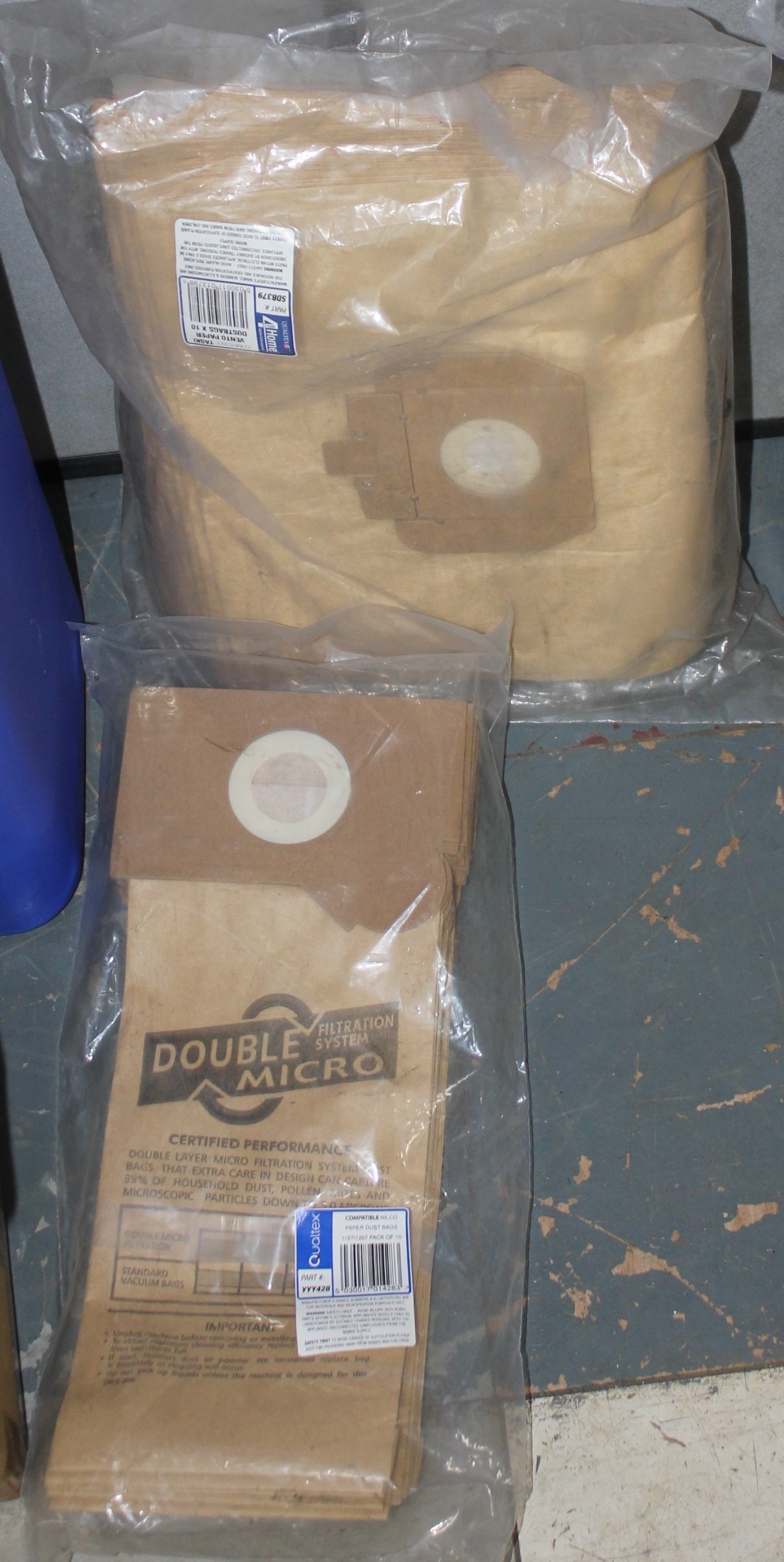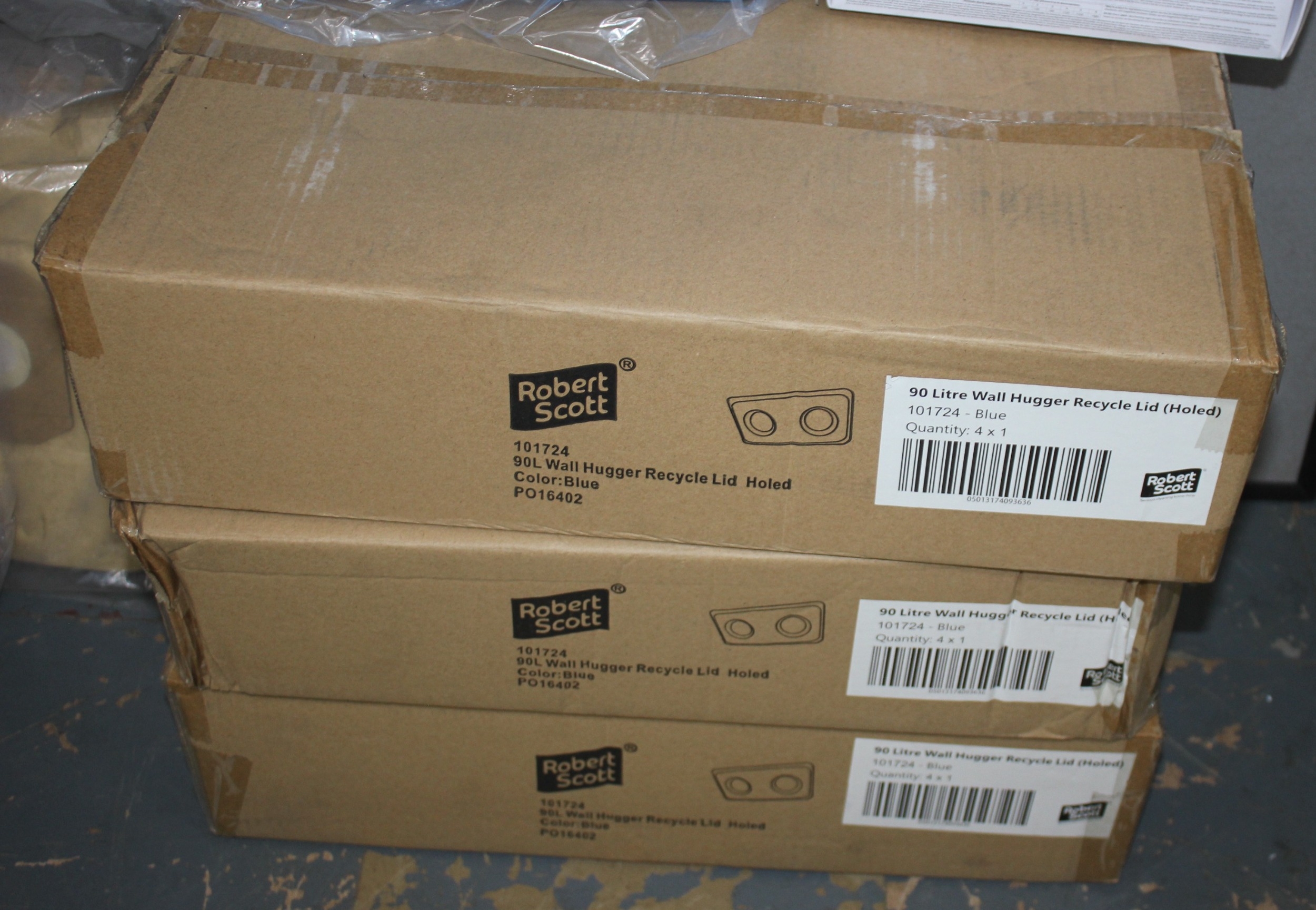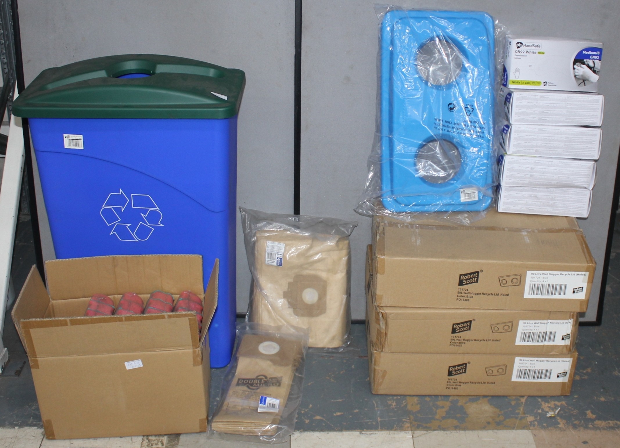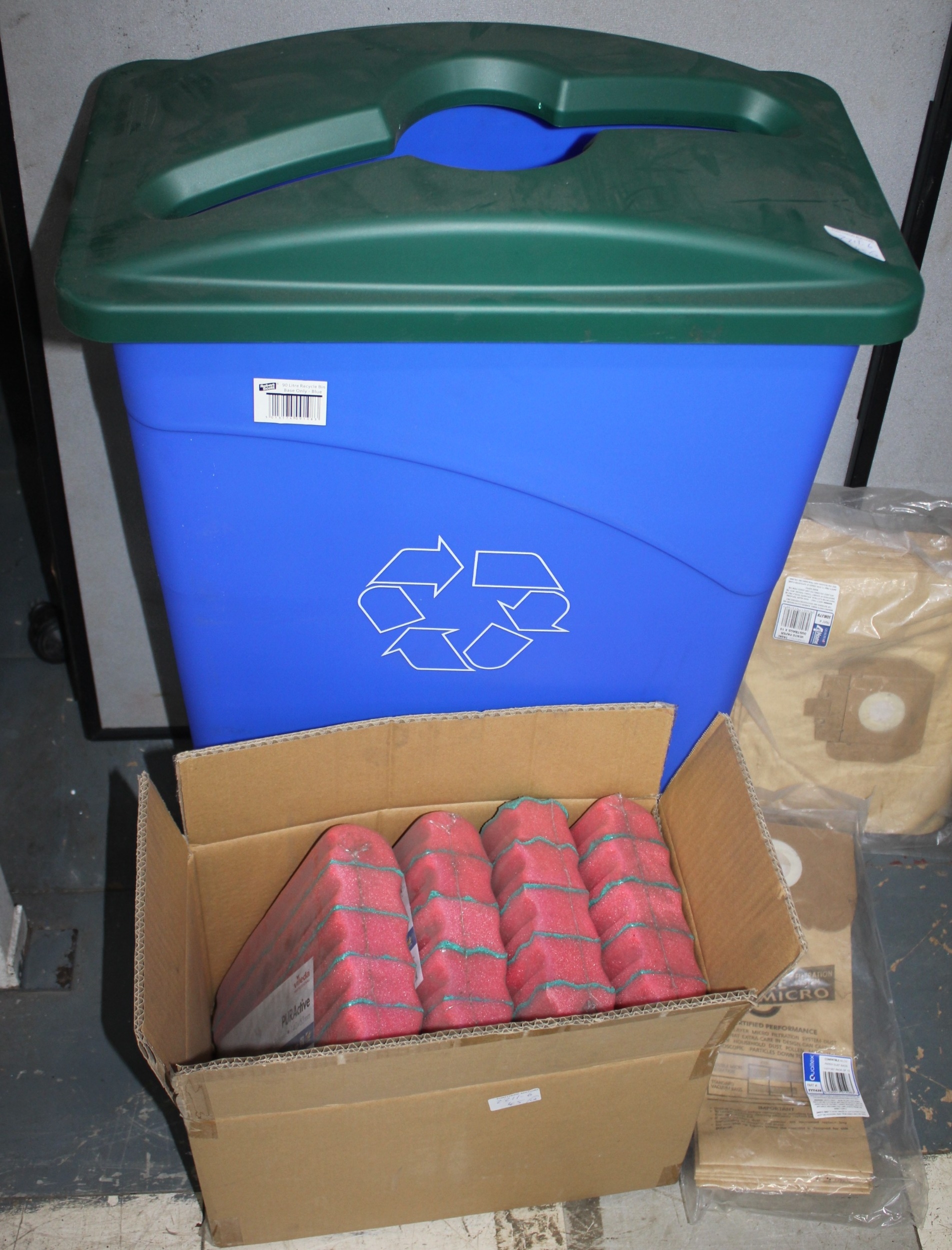 12 x 9ol WALL HUGGER RECYCLE LIDS, 5x200 NITRILE GLOVES, BLUE PLASTIC BIN, VACUUM BAGS, SCOURERS
