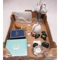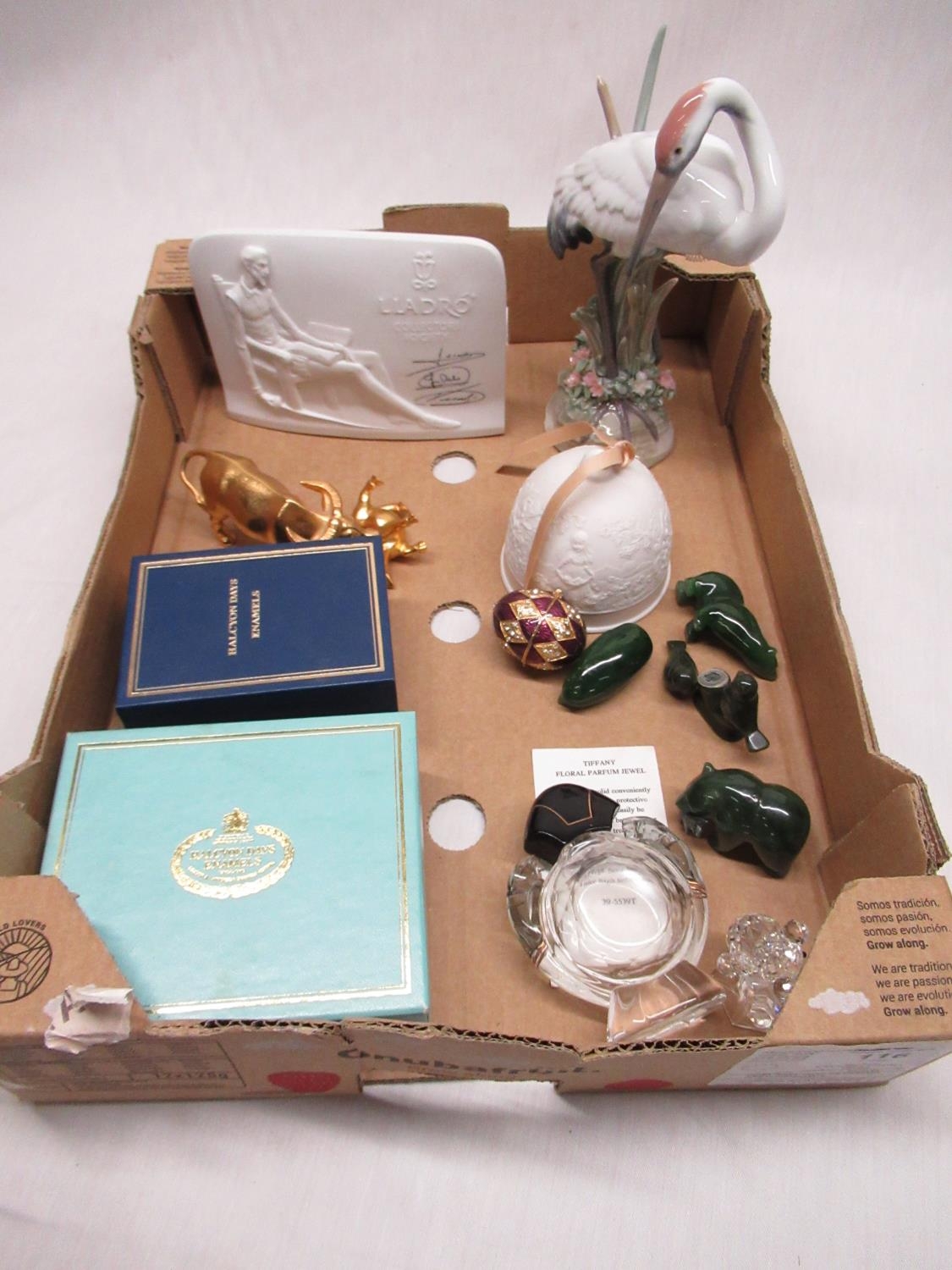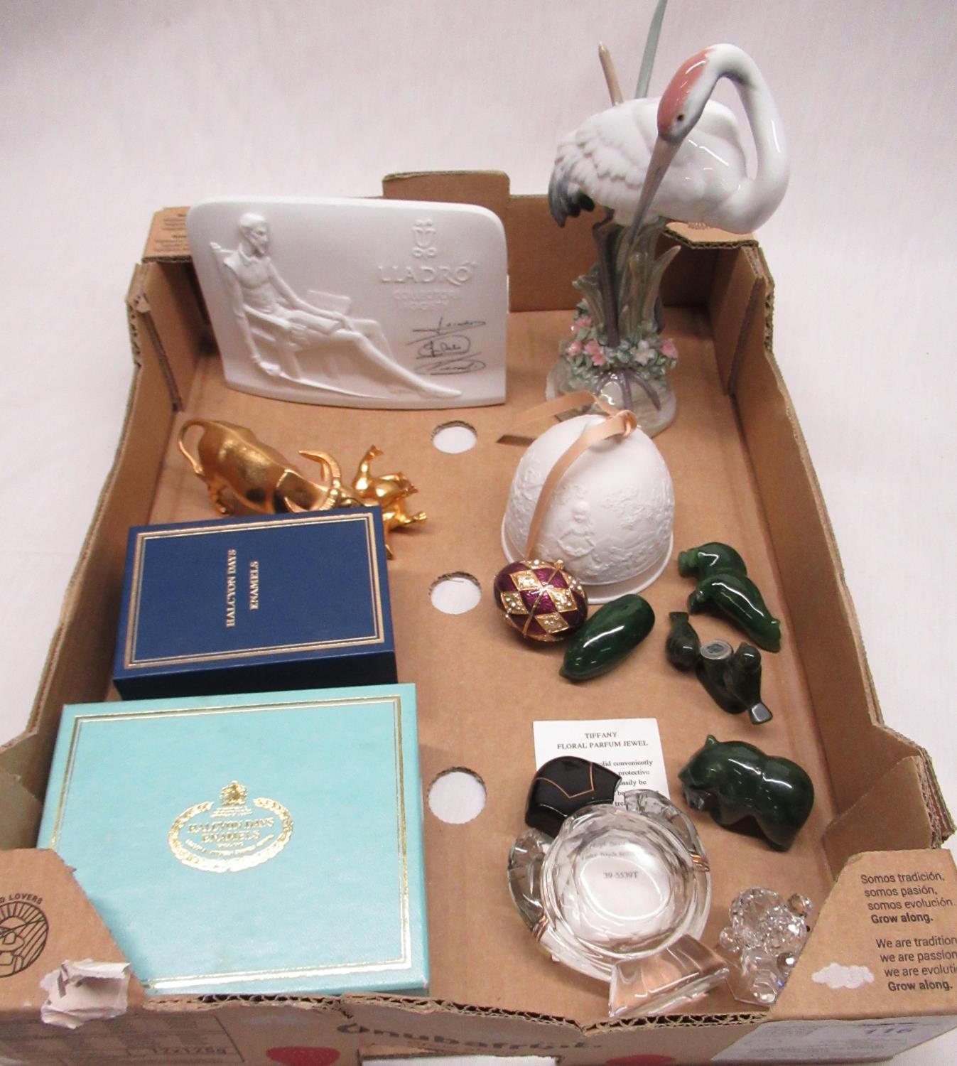 Lladro model of a Heron with painted trademark impressed no. 1612, H20cm a Lladro plaque, Halcyon Days and other enamel boxes, perfume bottle and other decorative items