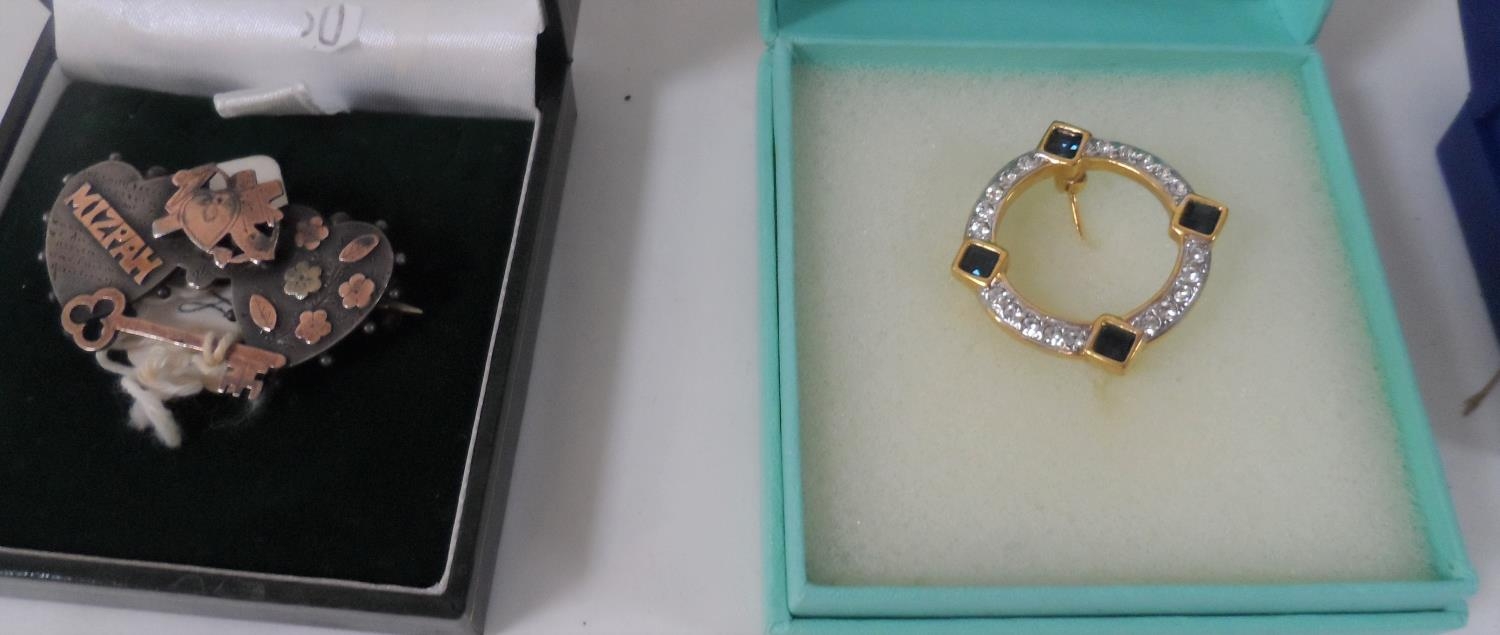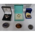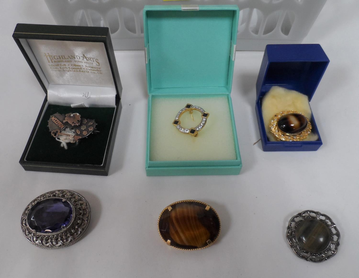 Vintage silver Mizpah brooch together with 5 other ladies brooches including 3 hard-stone examples (6)