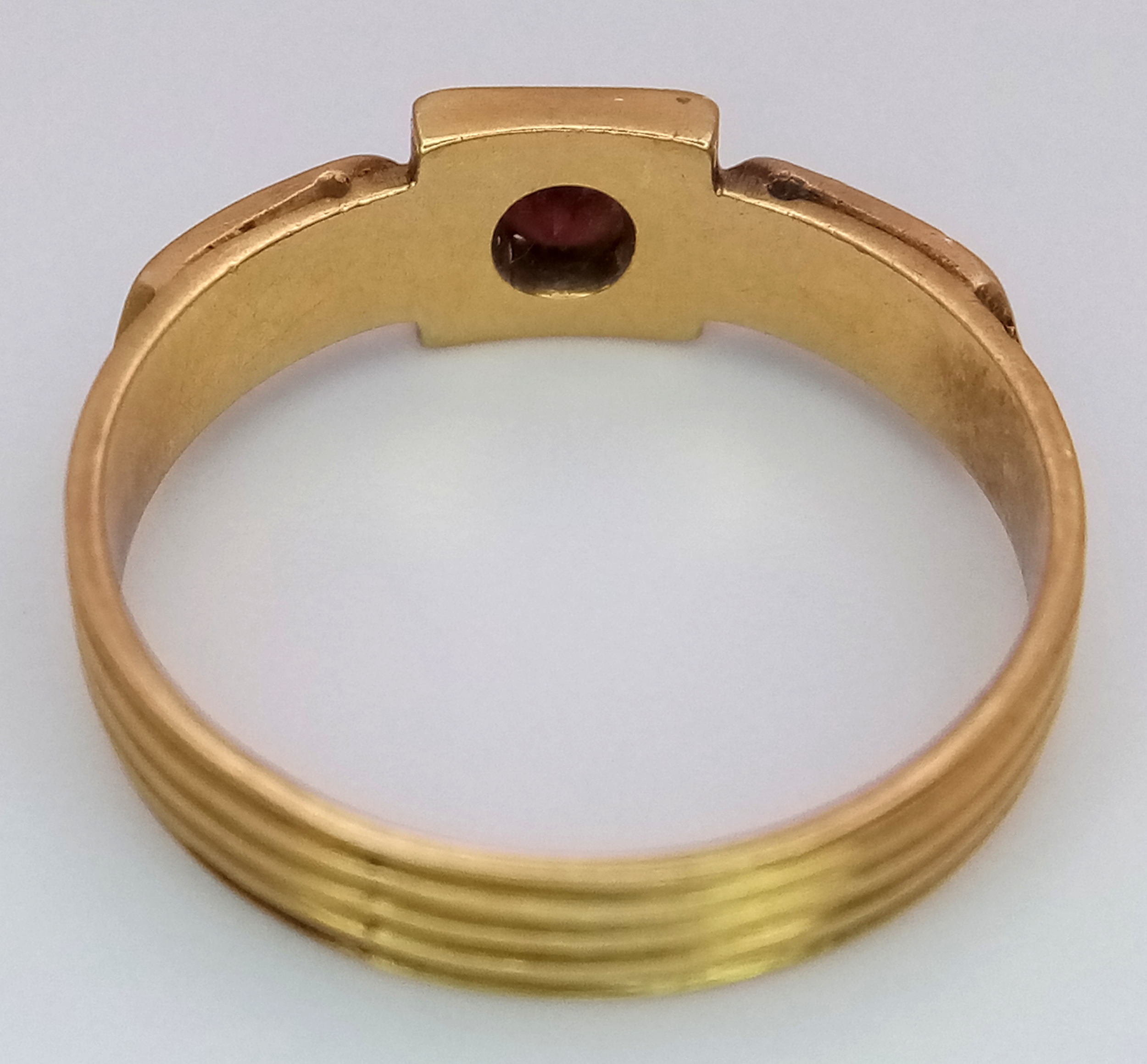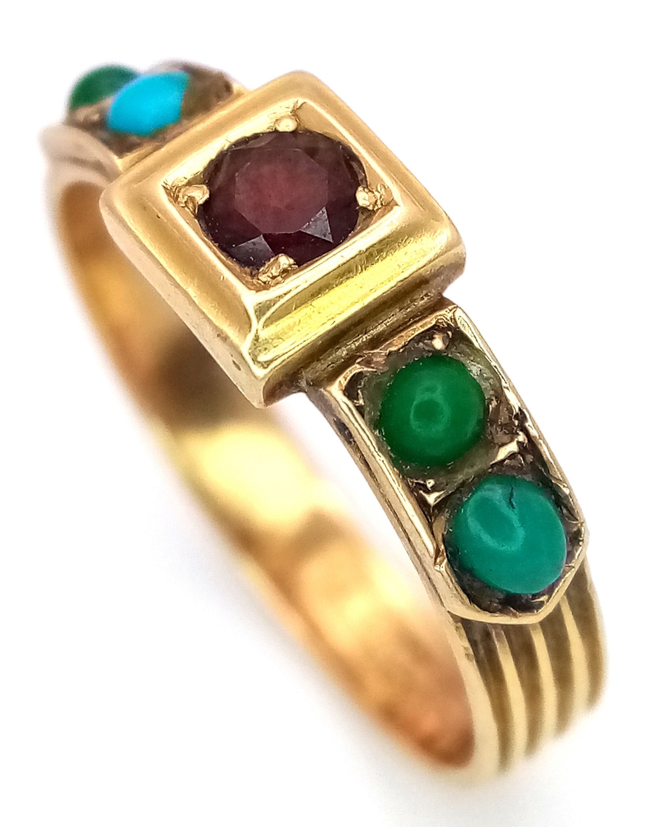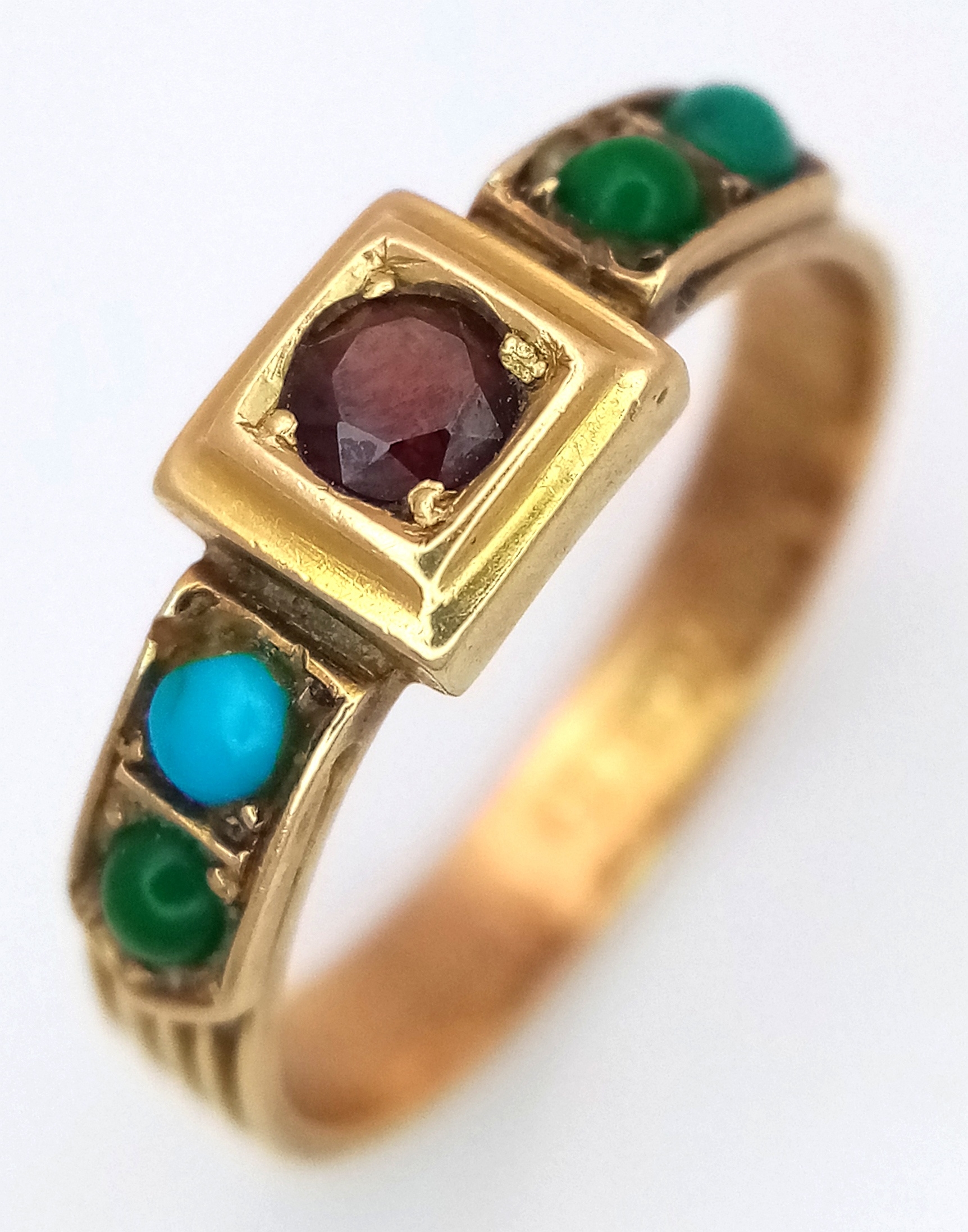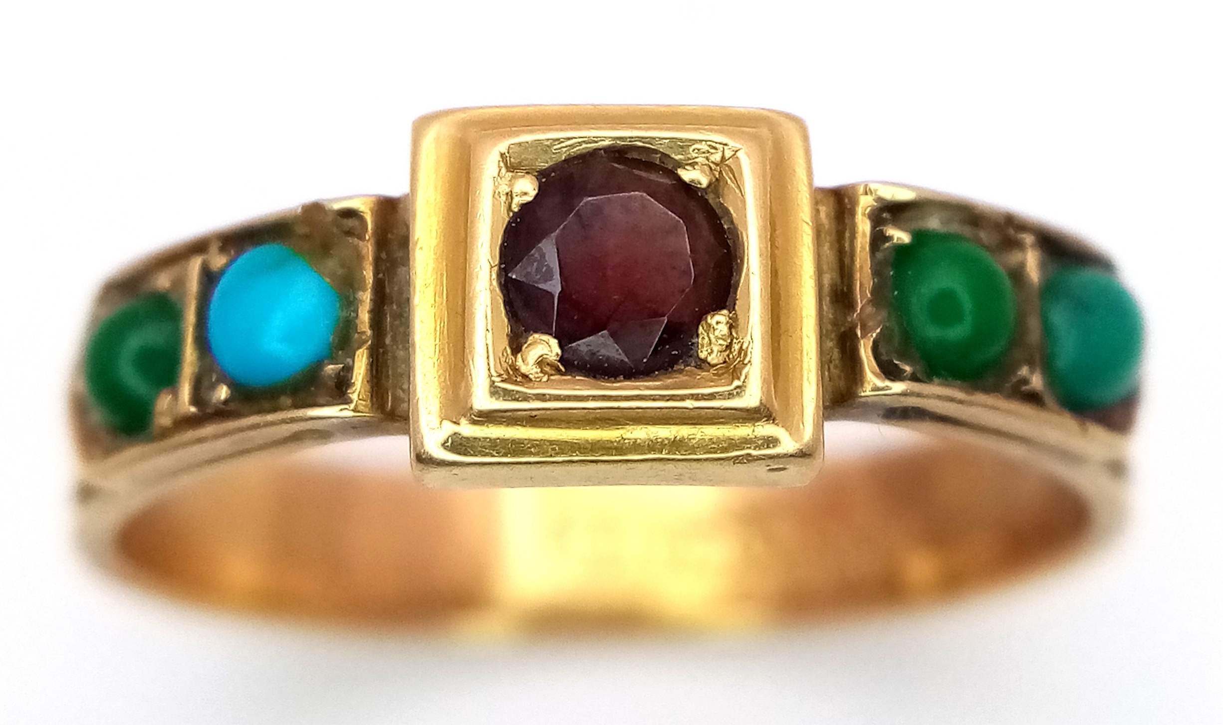 AN 18K YELLOW GOLD ANTIQUE GARNET & TURQUISE RING 2.7G SIZE L 1/2. REF: SC 9091