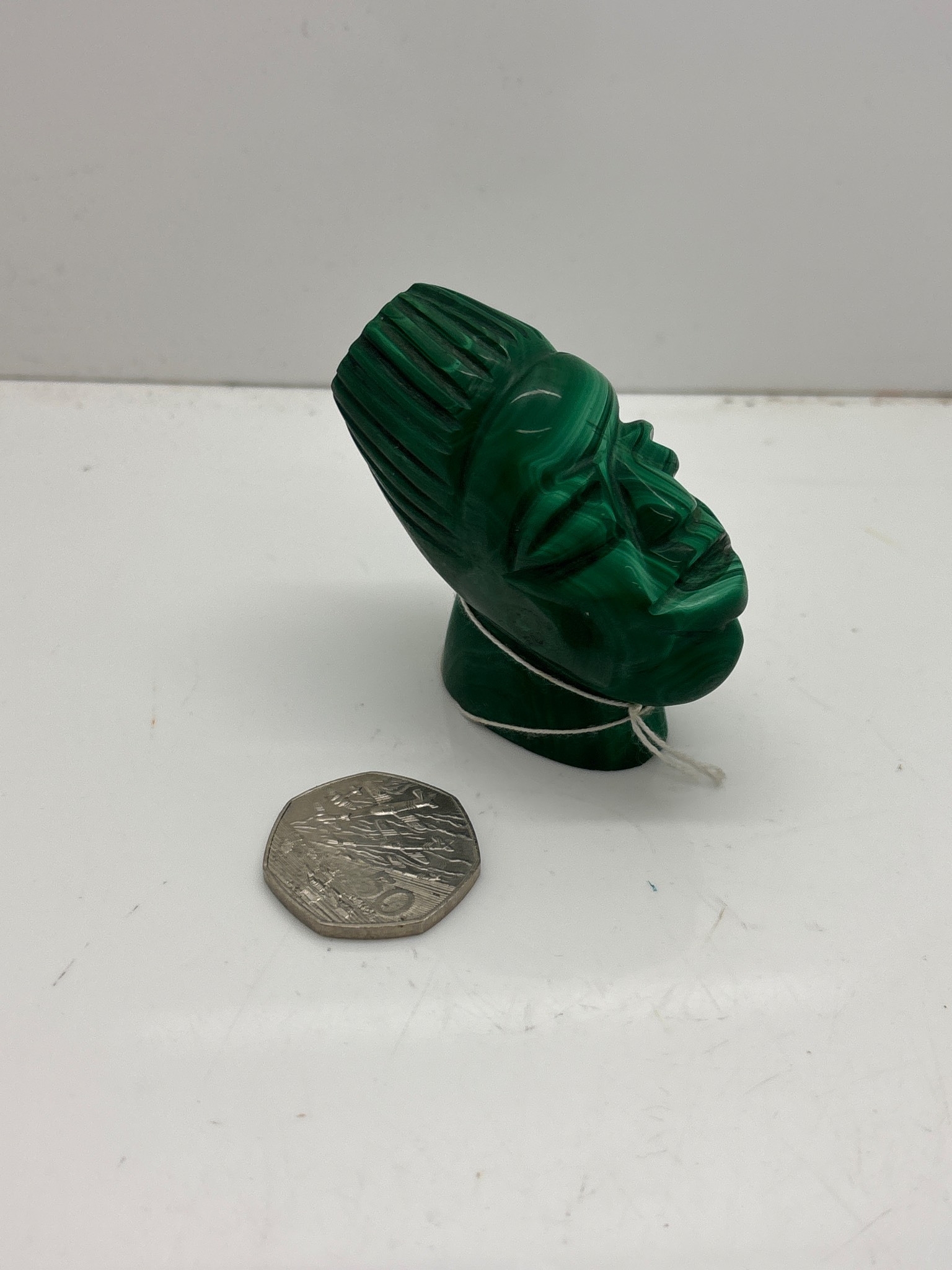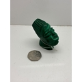 Carved green bust depicting a stylized human head, shown next to a coin for scale, material unknown, in good condition.