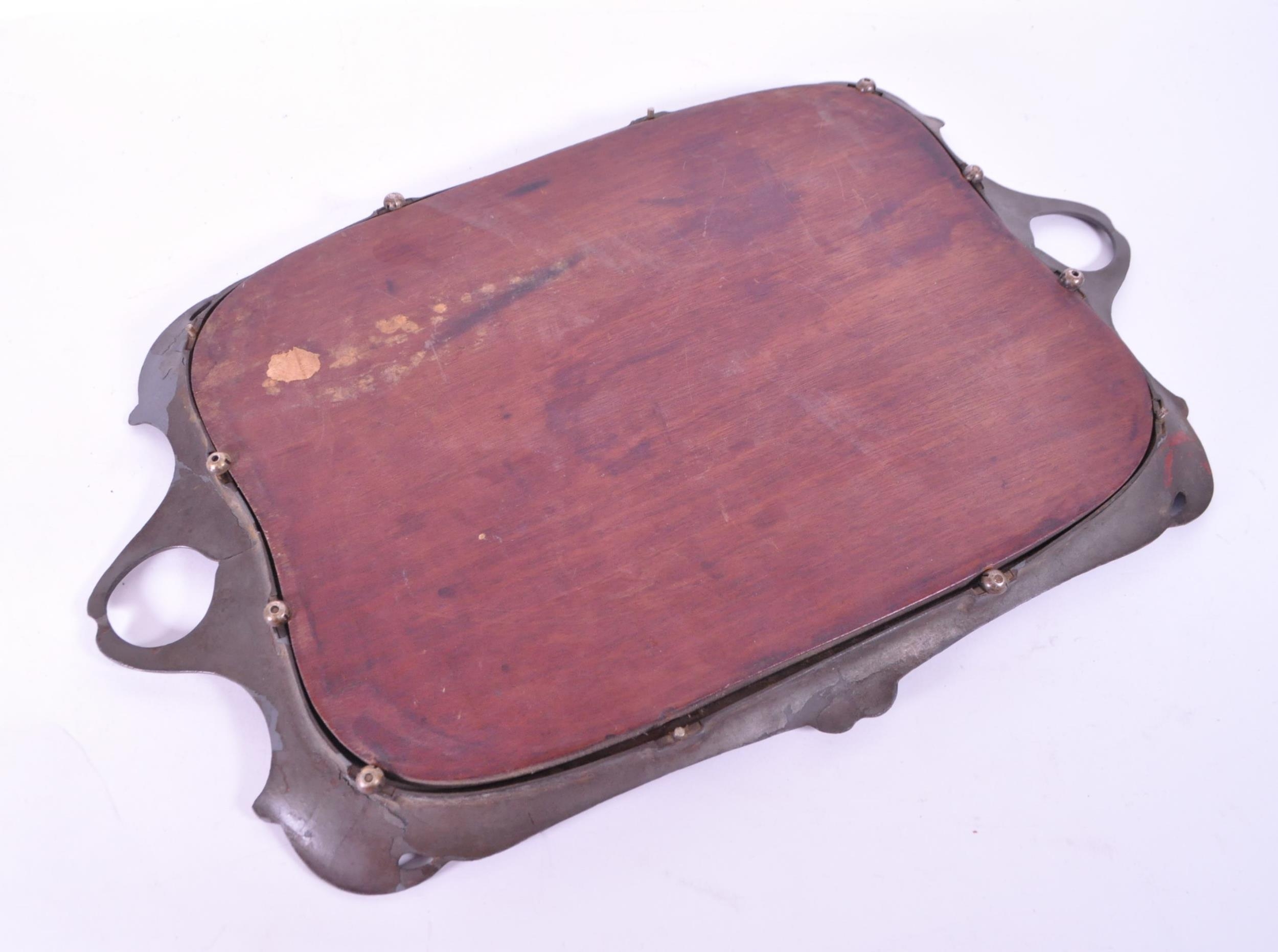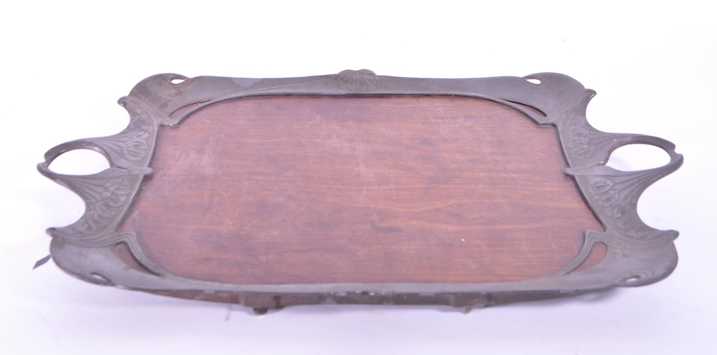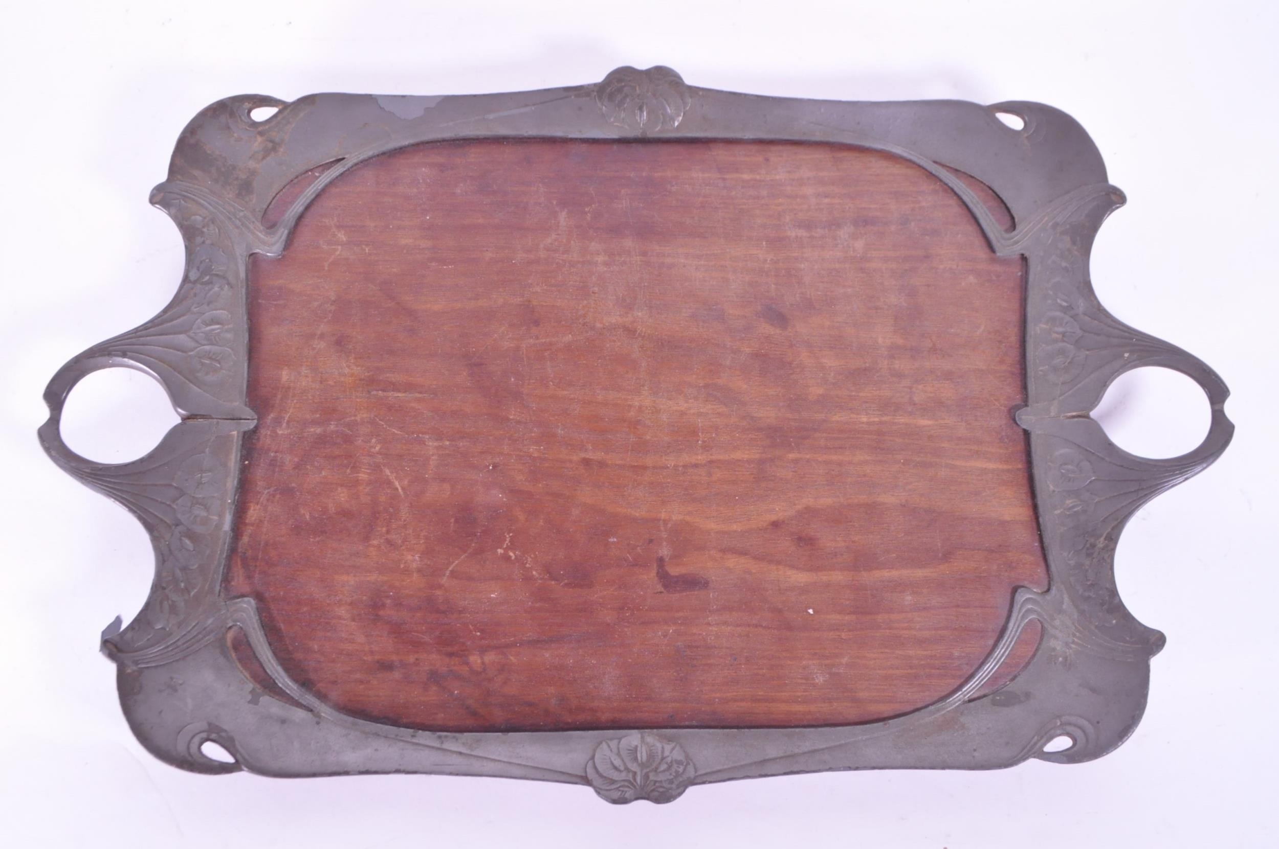 Early 20th century art nouveau style serving tray, comprised of a wooden teak base and pewter moulded frame with two handles.