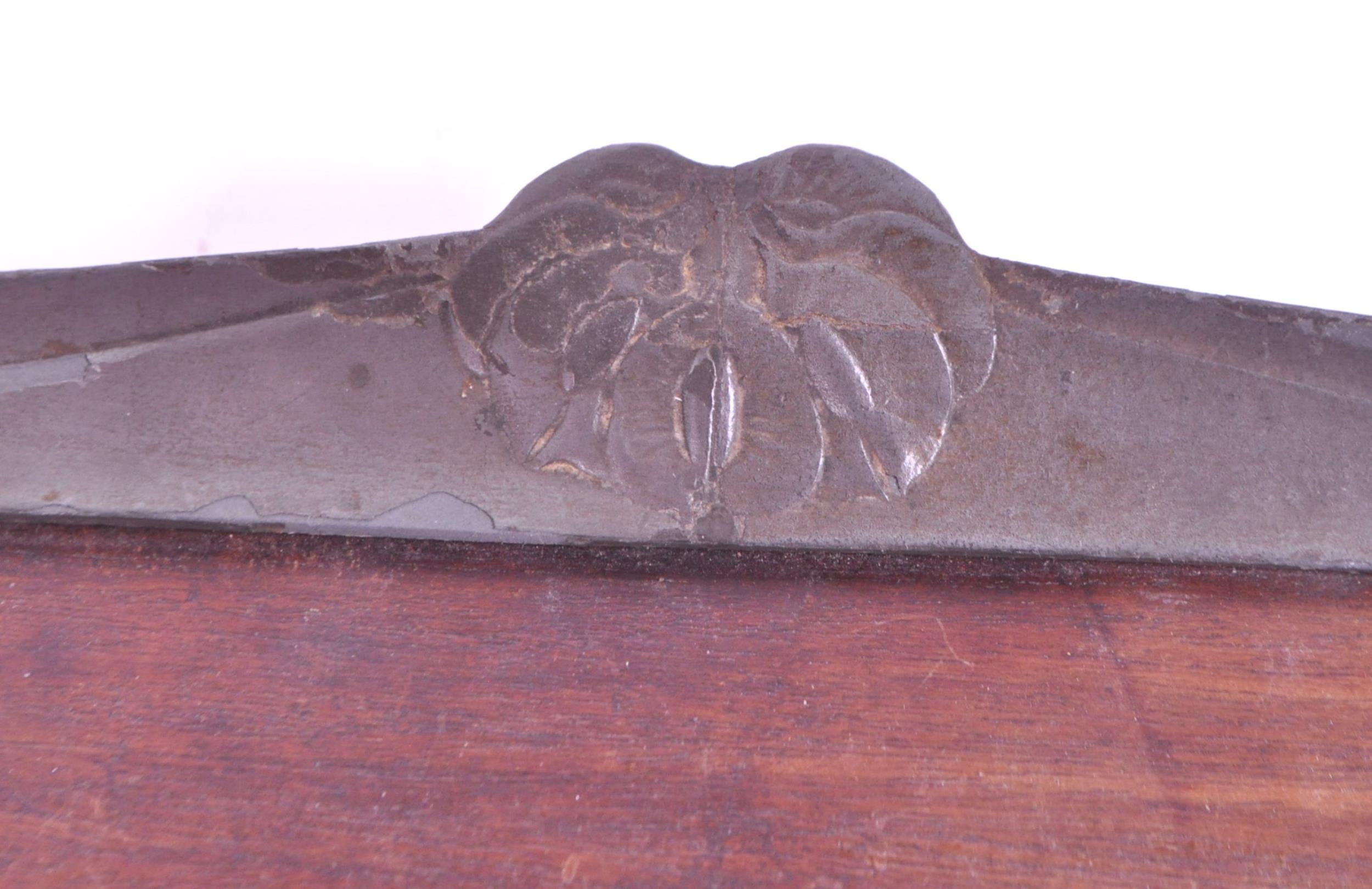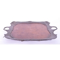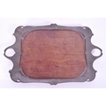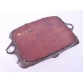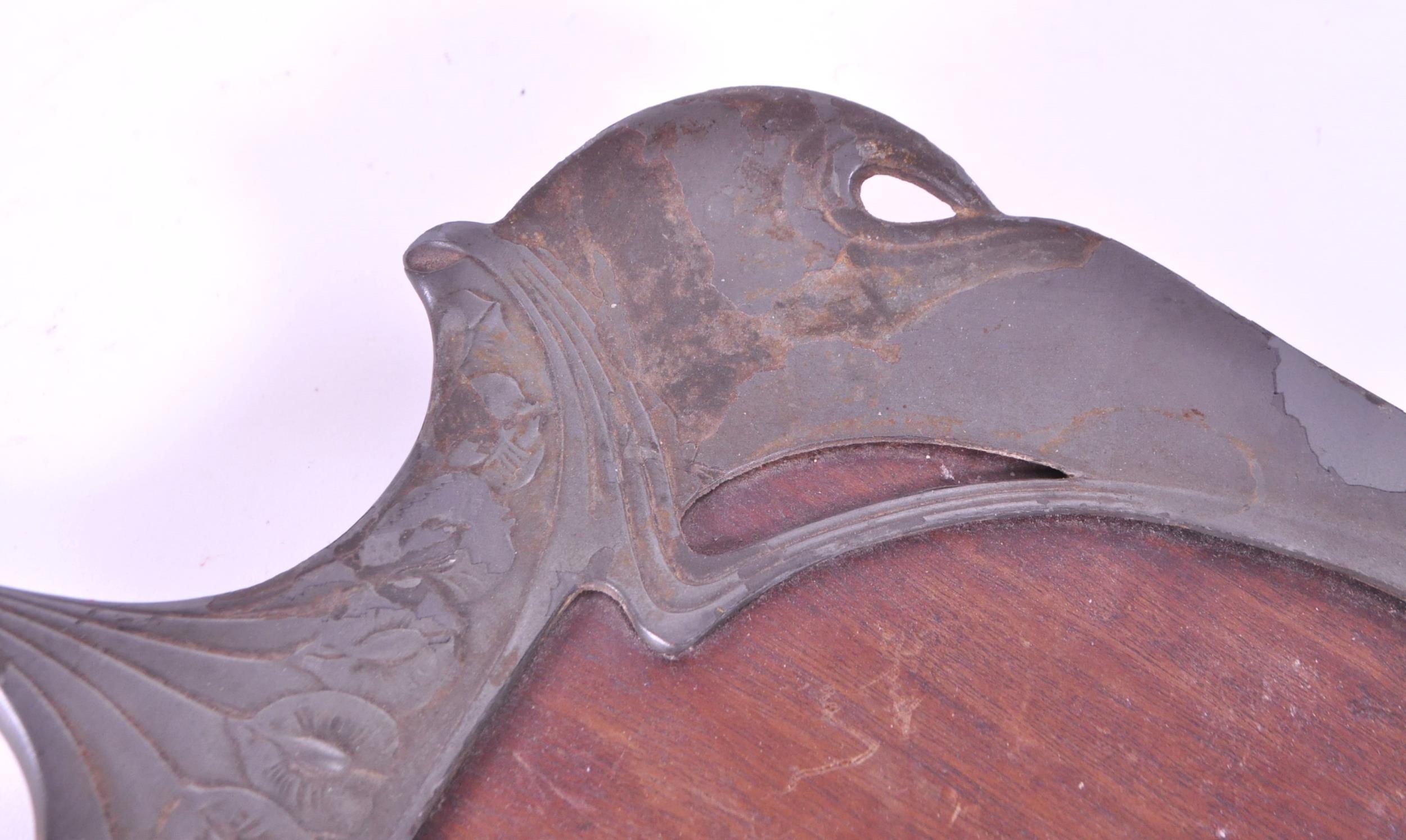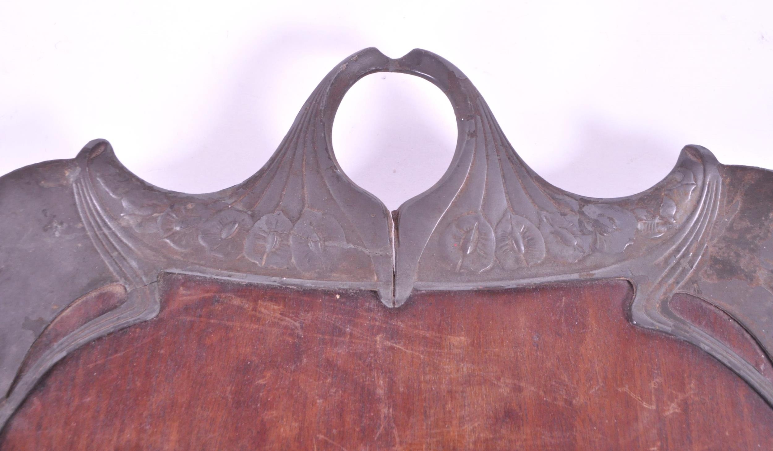 Early 20th century art nouveau style serving tray, comprised of a wooden teak base and pewter moulded frame with two handles.