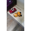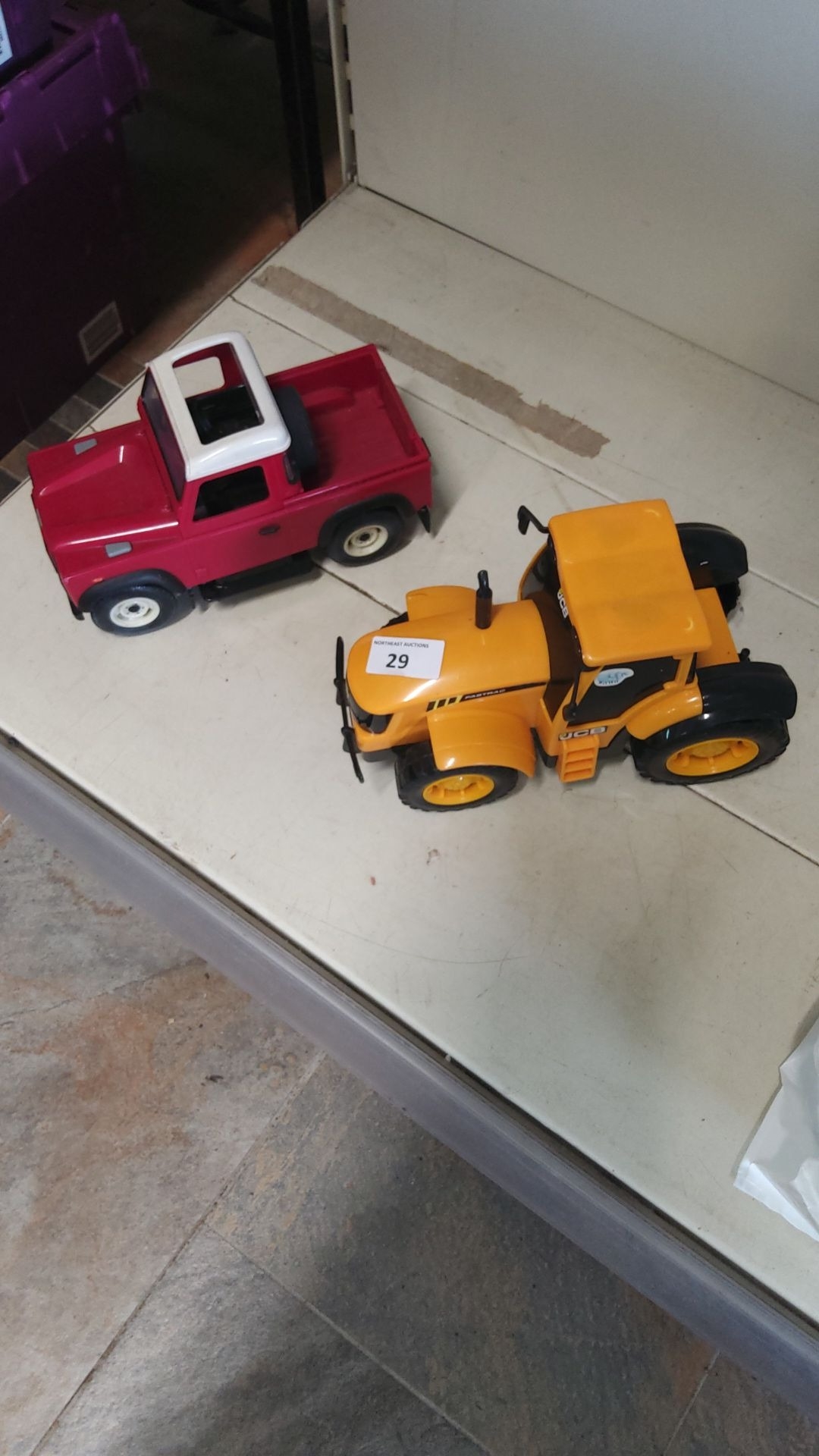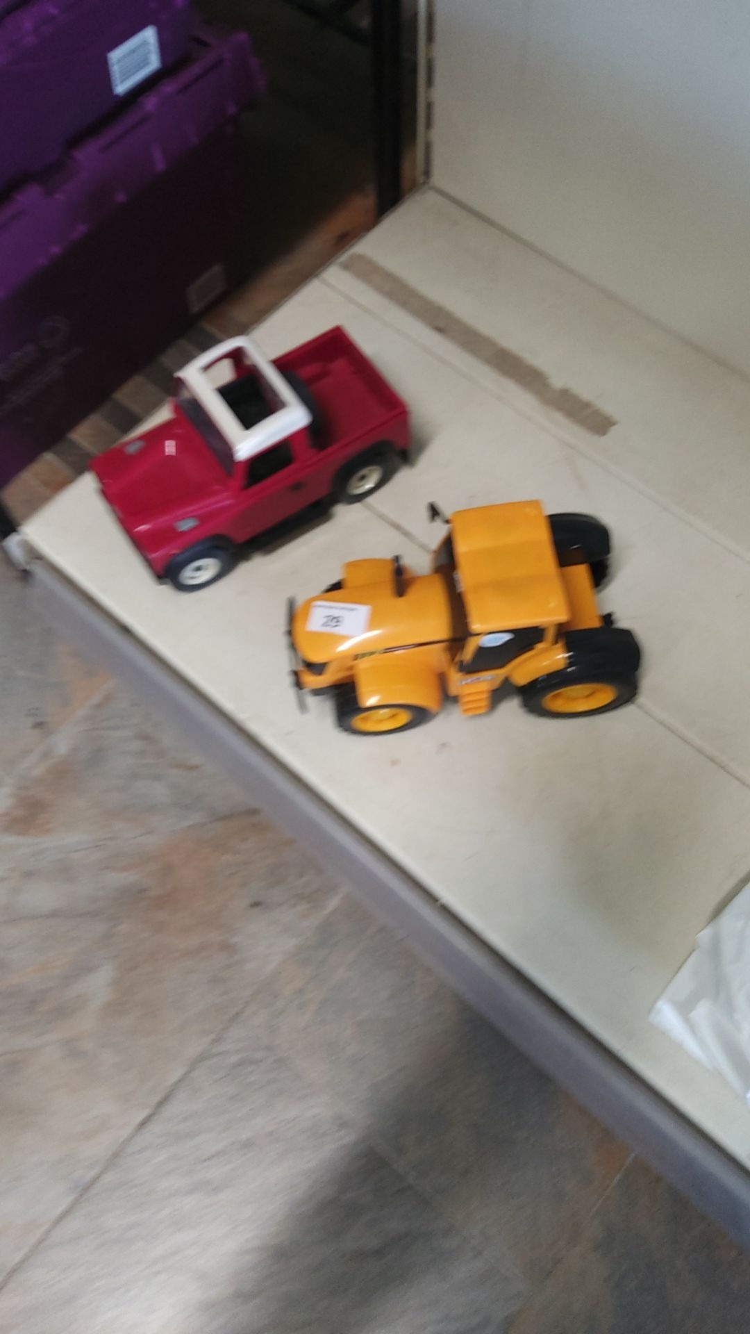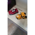 Set of two toy vehicles: red truck with white roof and yellow tractor. Plastic construction, vibrant colors.