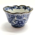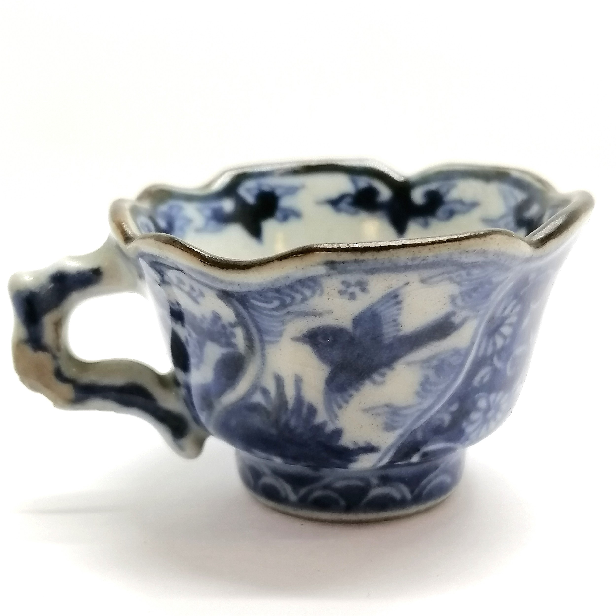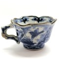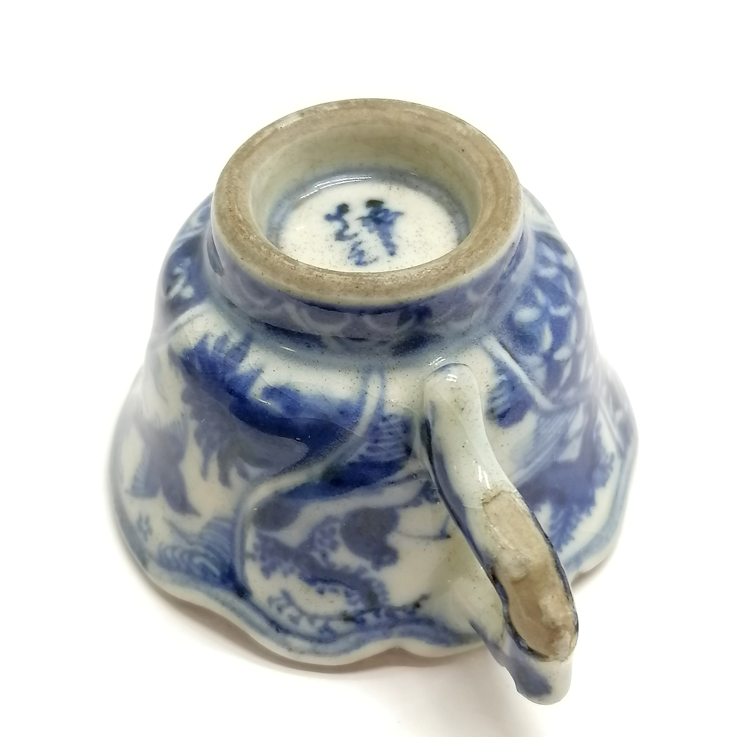 Antique Oriental blue & white small teacup with marks to base - 3cm high ~ has losses of glaze to the handle