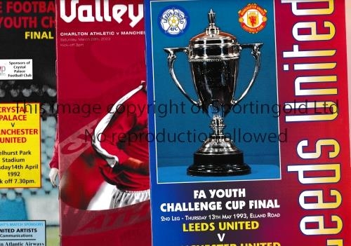 MANCHESTER UNITED / YOUTH CUP TIES Fourteen away programmes for the Youth Cup ties from the 1980's-2000's, including Watford 6/5/1982, Leeds United 13/5/1993, Liverpool 5/3/1996 and Charlton Athletic 29/3/2003. Generally good