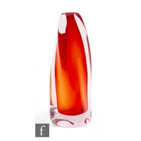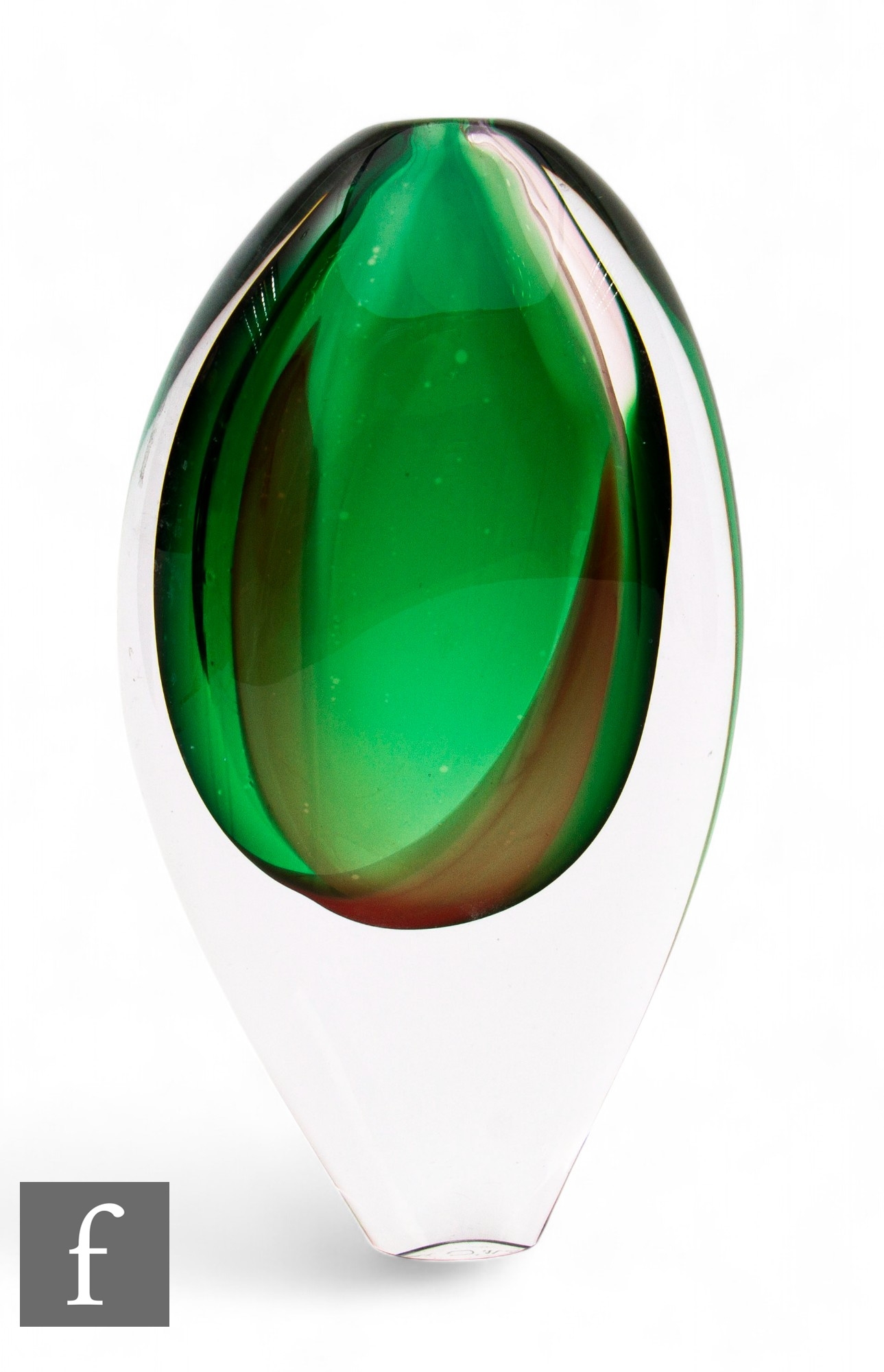 Nikki Williams - A contemporary studio glass vase of compressed ovoid form, the green core with an orange trail and cased in clear, engraved signature, height 27cm.