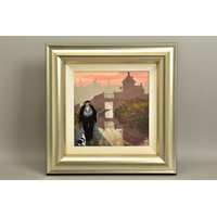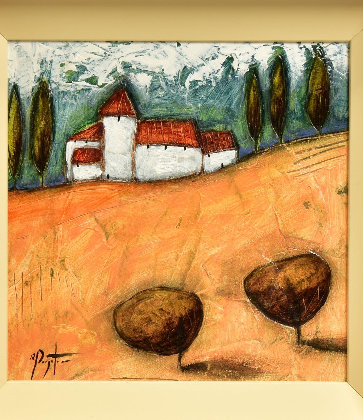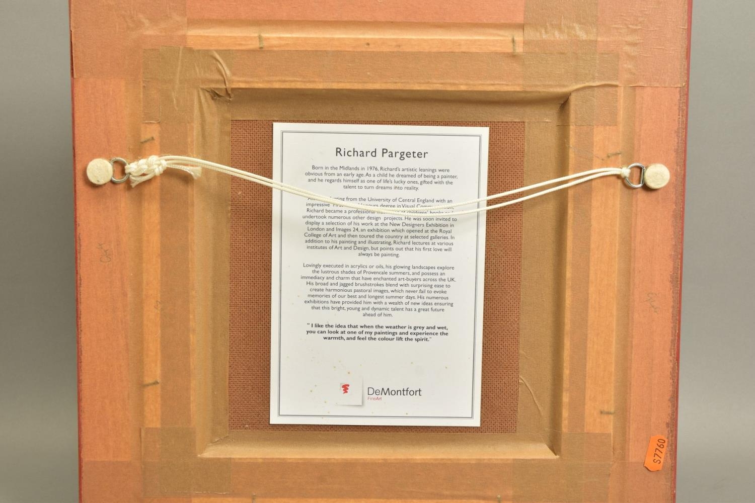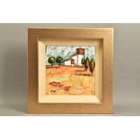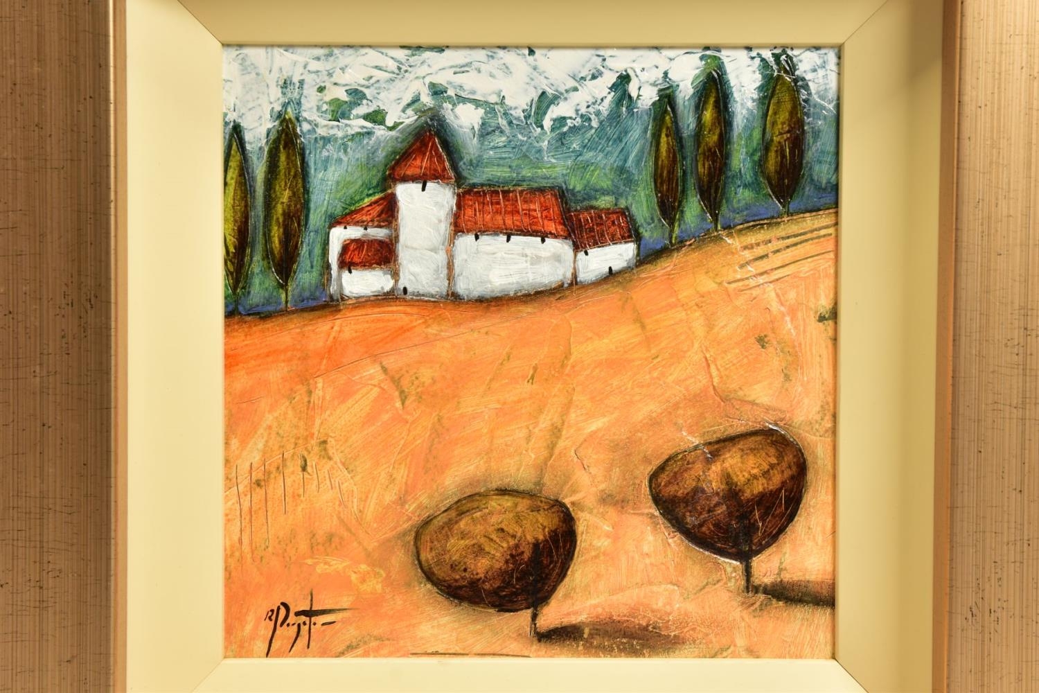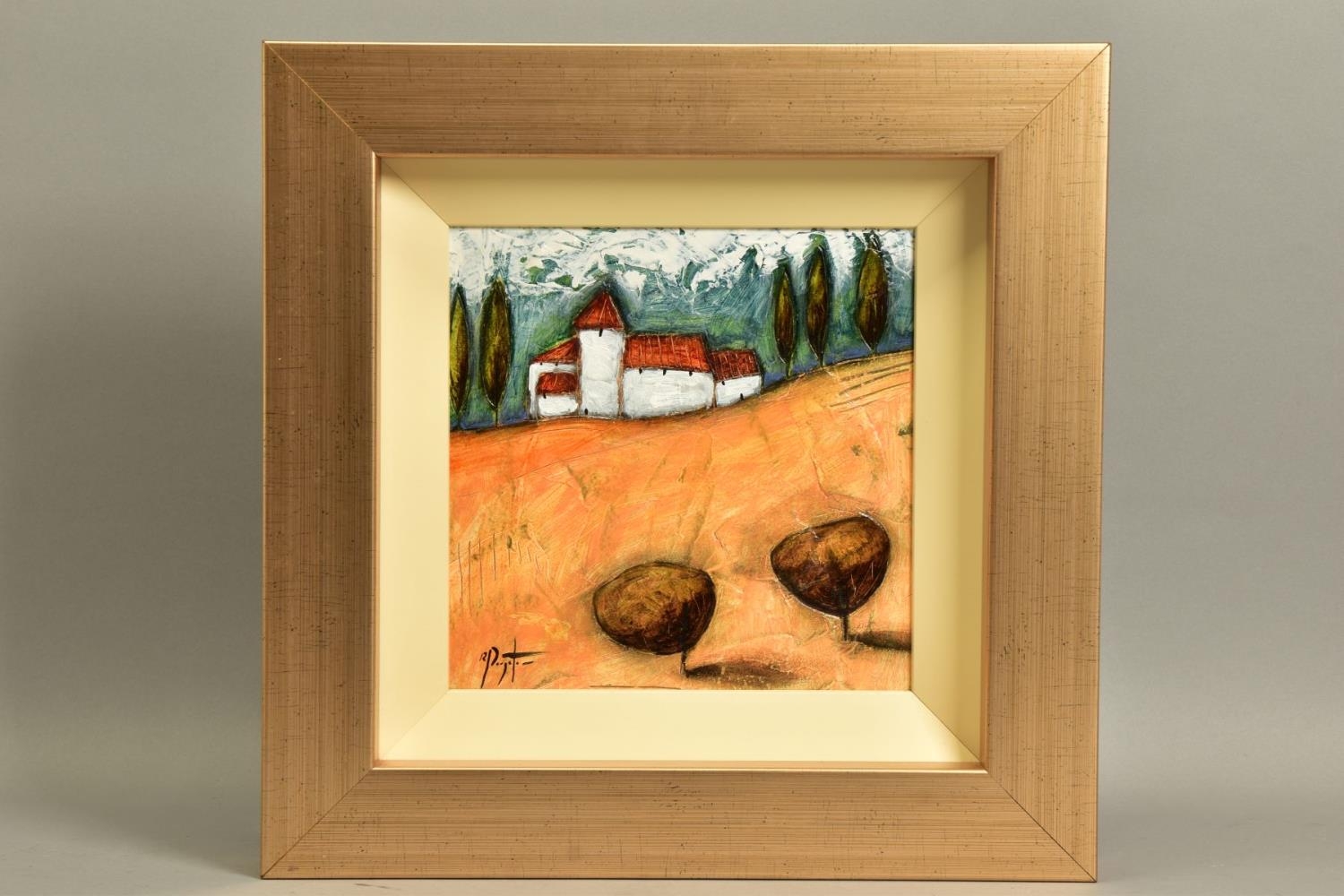 RICHARD PARGETER (BRITISH 1976) A MODERN CONTINENTAL LANDSCAPE, signed bottom left, oil on board, approximate sizes: image 24cm x 24cm frame 40cm x 40cm, (Condition report: Good condition) (artist resale rights apply)