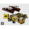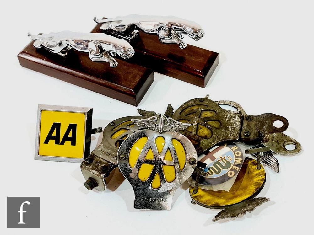 Two chrome leaping Jaguar car mascots each on mahogany plinths, also six AA badges and Aston Martin and Alpha Romeo badge. (10)