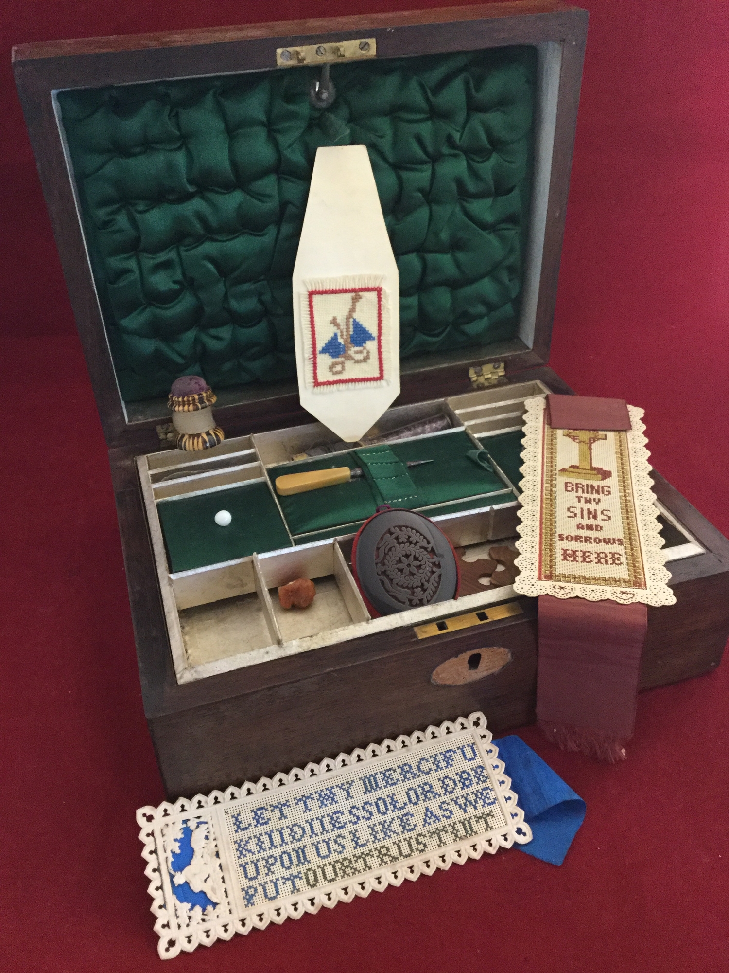 with a Victorian wax threader, pin cushion, Victorian bookmarks etc -