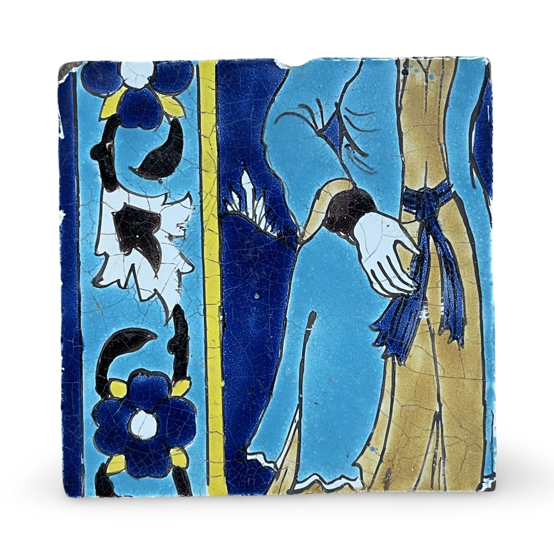 This square earthenware tile is decorated in polychrome glazes featuring a fragmentary figurative scene set against a deep cobalt blue ground. The composition depicts the lower portions of two figures; the figure on the left wears a vibrant turquoise-blue robe with a dark cuff, while the figure on the right is dressed in a tan garment cinched with a dark blue sash. To the far left is a vertical decorative border containing five-petaled blue flowers and black foliate motifs on a light blue ground, separated from the main scene by a thin yellow vertical band. The reverse of the tile is composed of buff-colored earthenware with a recessed central square and a border of parallel incised lines designed to aid mortar adhesion.
