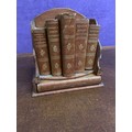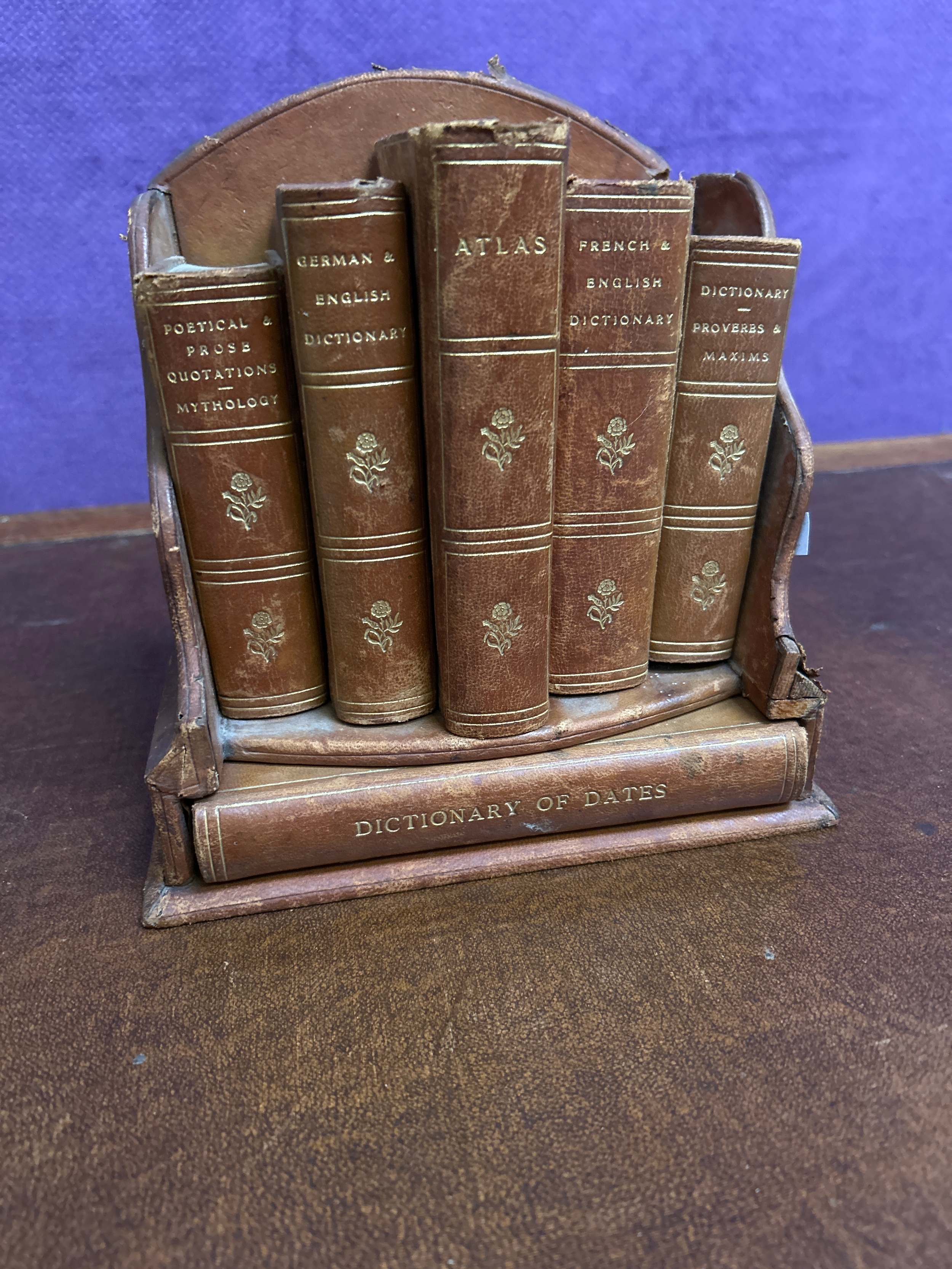An Edwardian Compendium “Reference Library” of Leather Bound reference books in a leather bookstand. Includes A Dictionary of dates, an Atlas, French & English Dictionary, German & English Dictionary, Dictionary of Proverbs & Maxims & Poetical Prose & Quotations. Uniformly bound but different publishers inc Temple Press, Letchworth, Greycaine Watford, George Philip & Son, London.