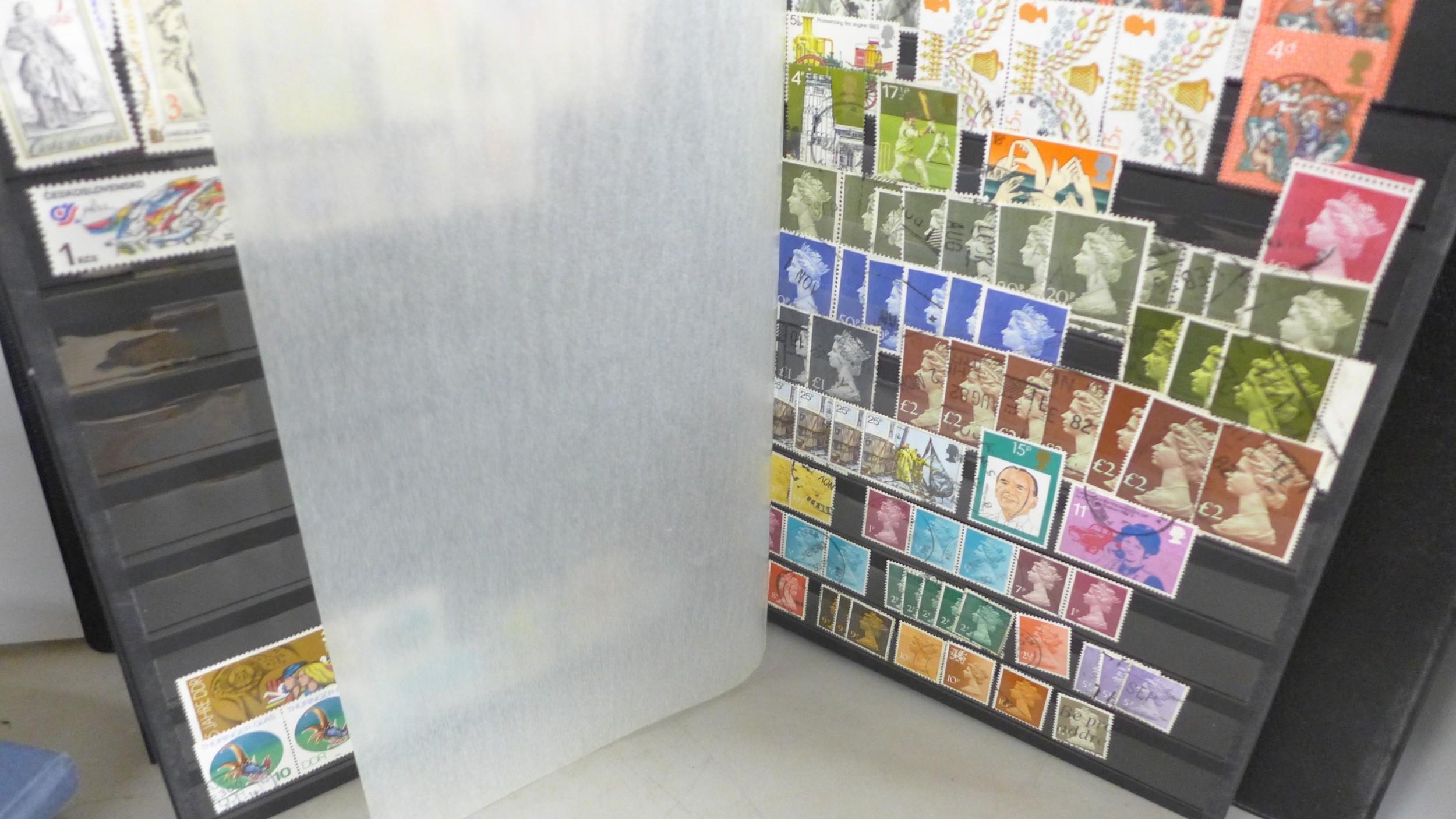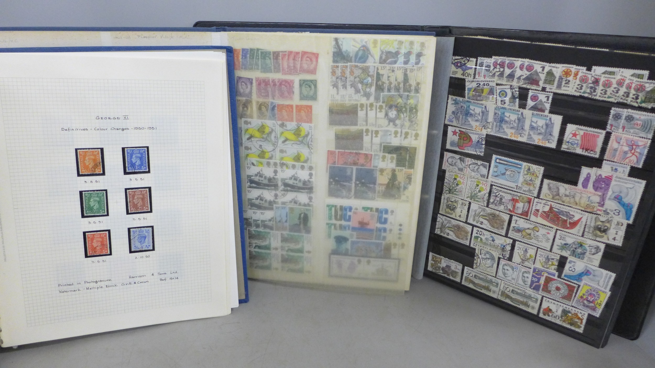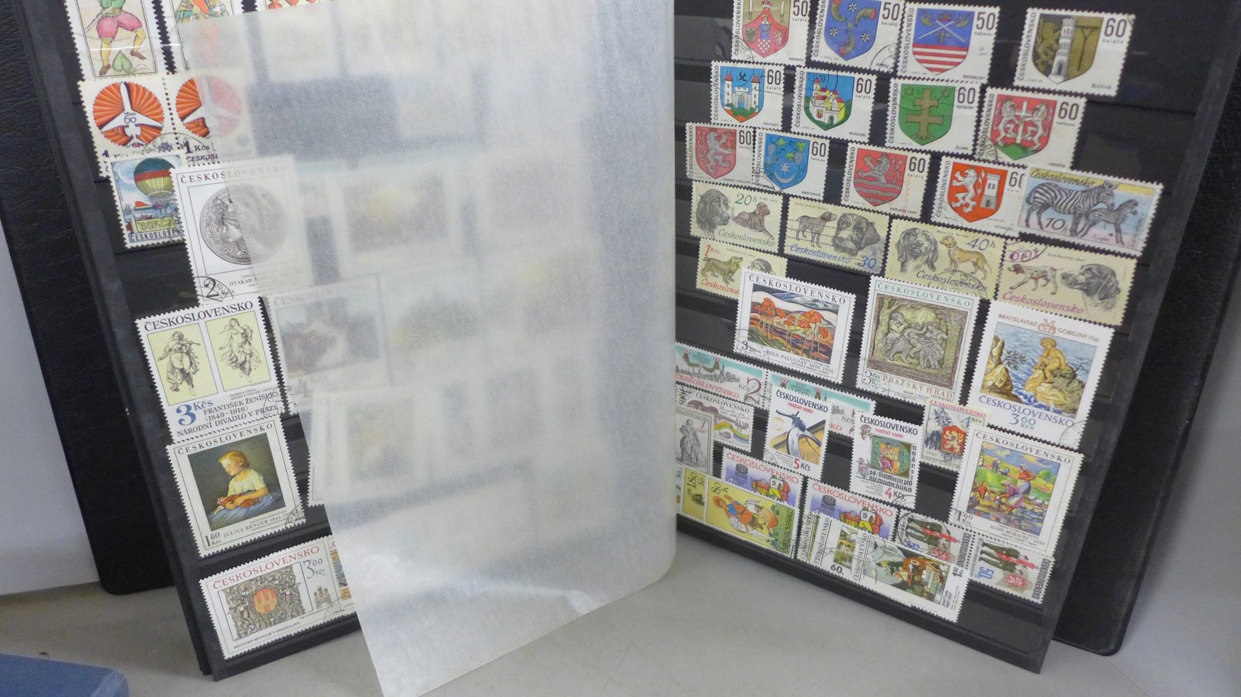 A collection of stamps in three albums, some British stamps dating back to 1930s onwards, British stamps in stock album and foreign including some Russian & Czech stamps