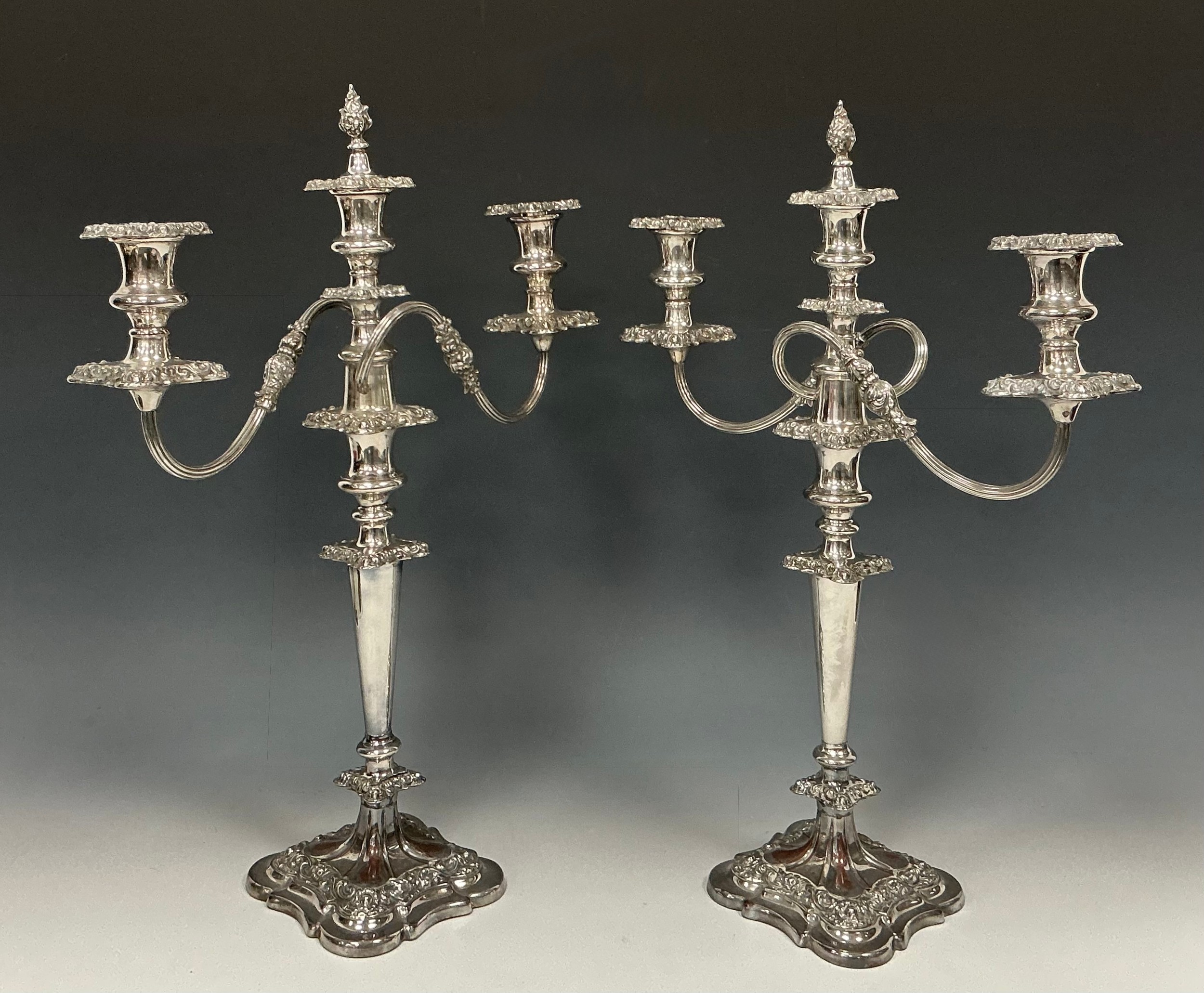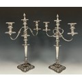 A pair of late 19th century silver plated single or two branch convertible table candlesticks, each with detachable sconces and flame finial cap, 53cm