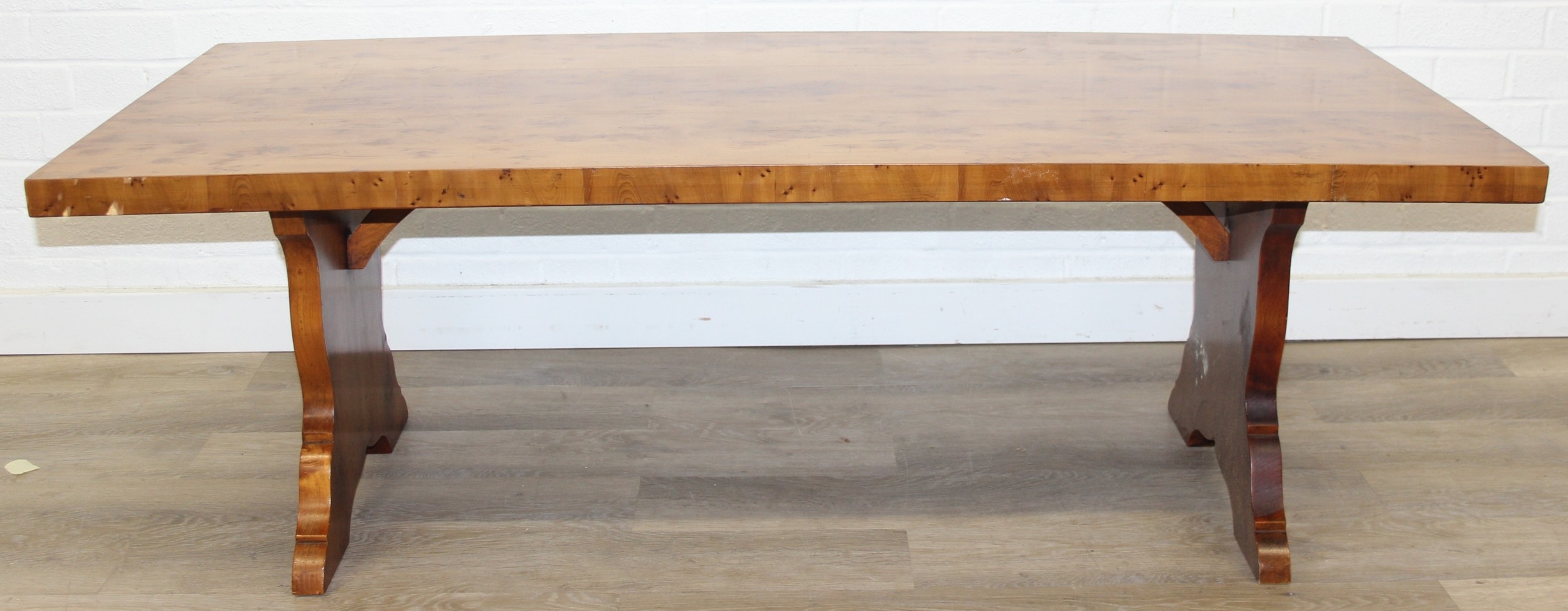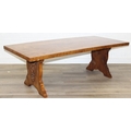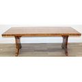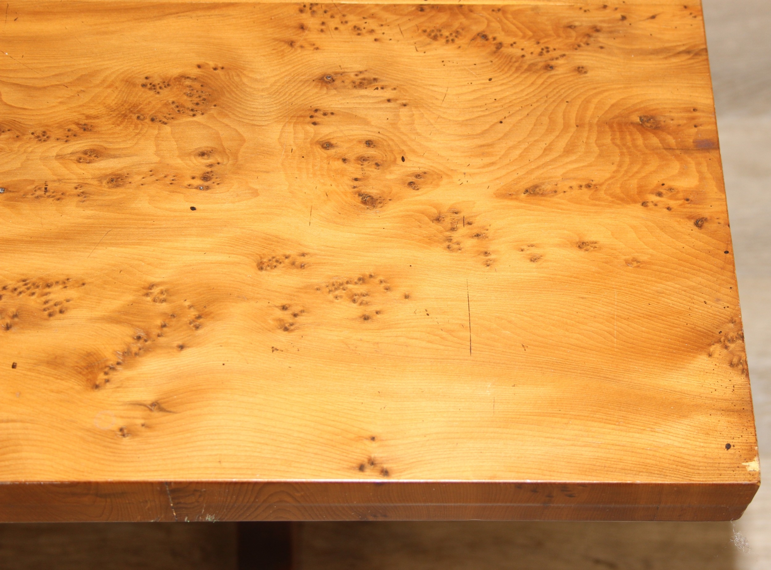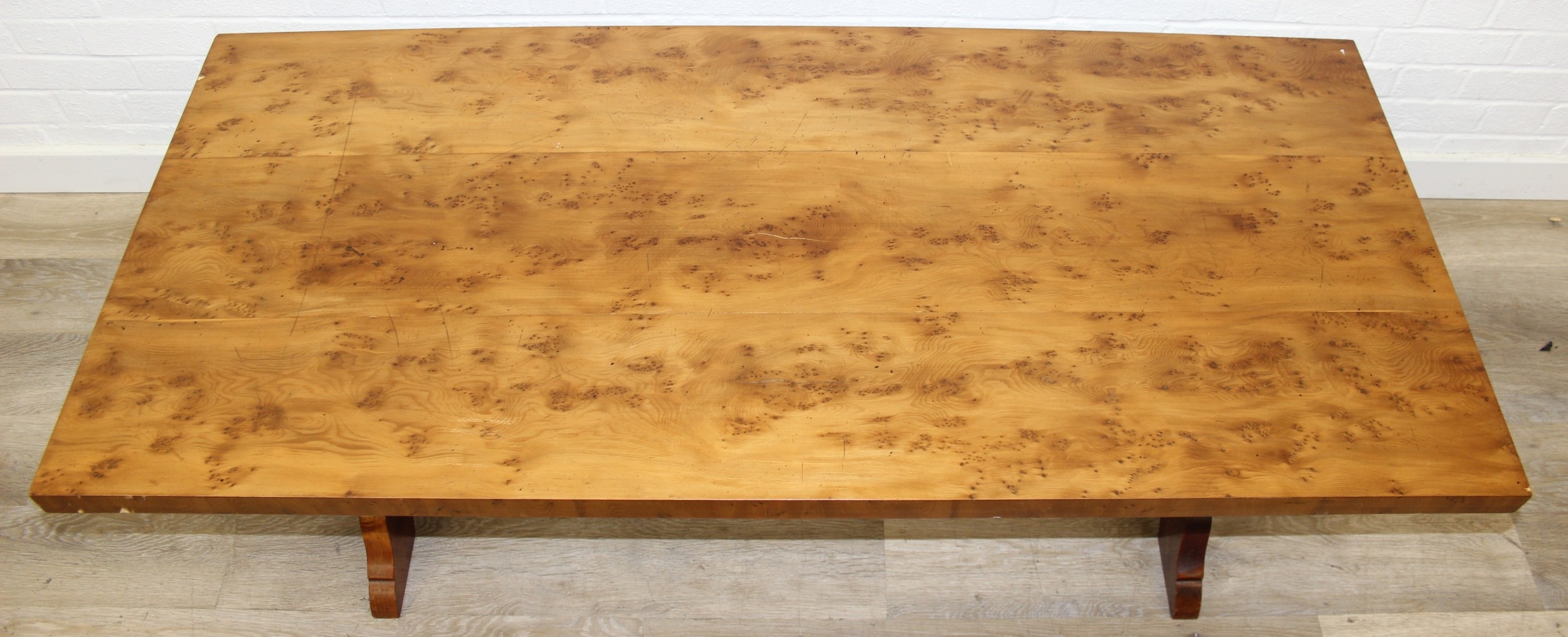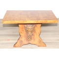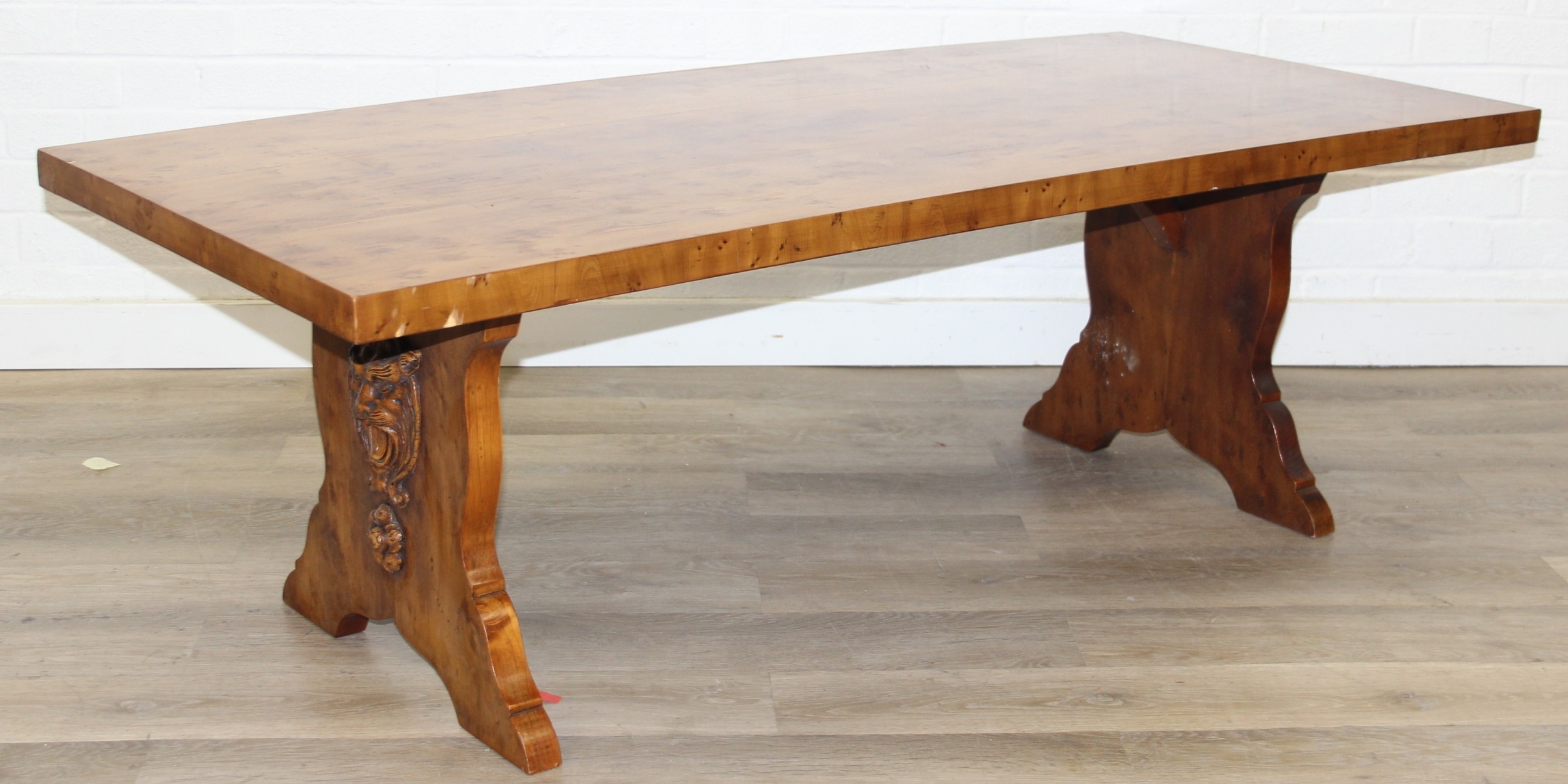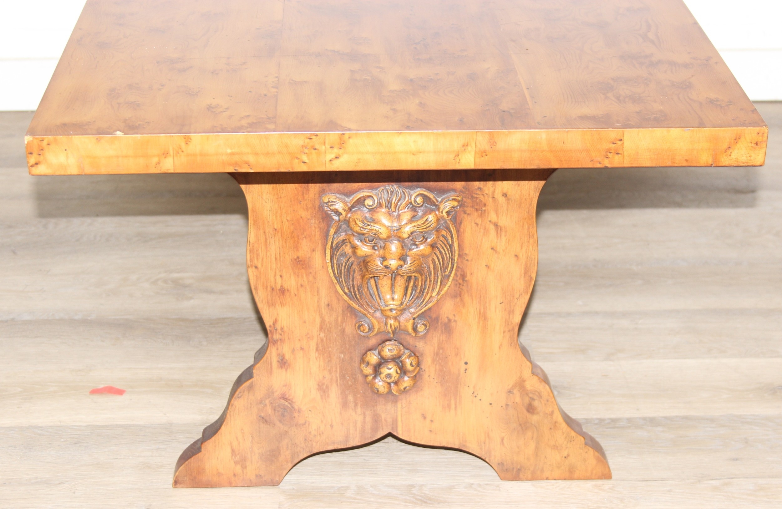 A superb quality modern coffee table with yew wood finish, lion mask adornments to legs, 143cm x 69cm x 51cm