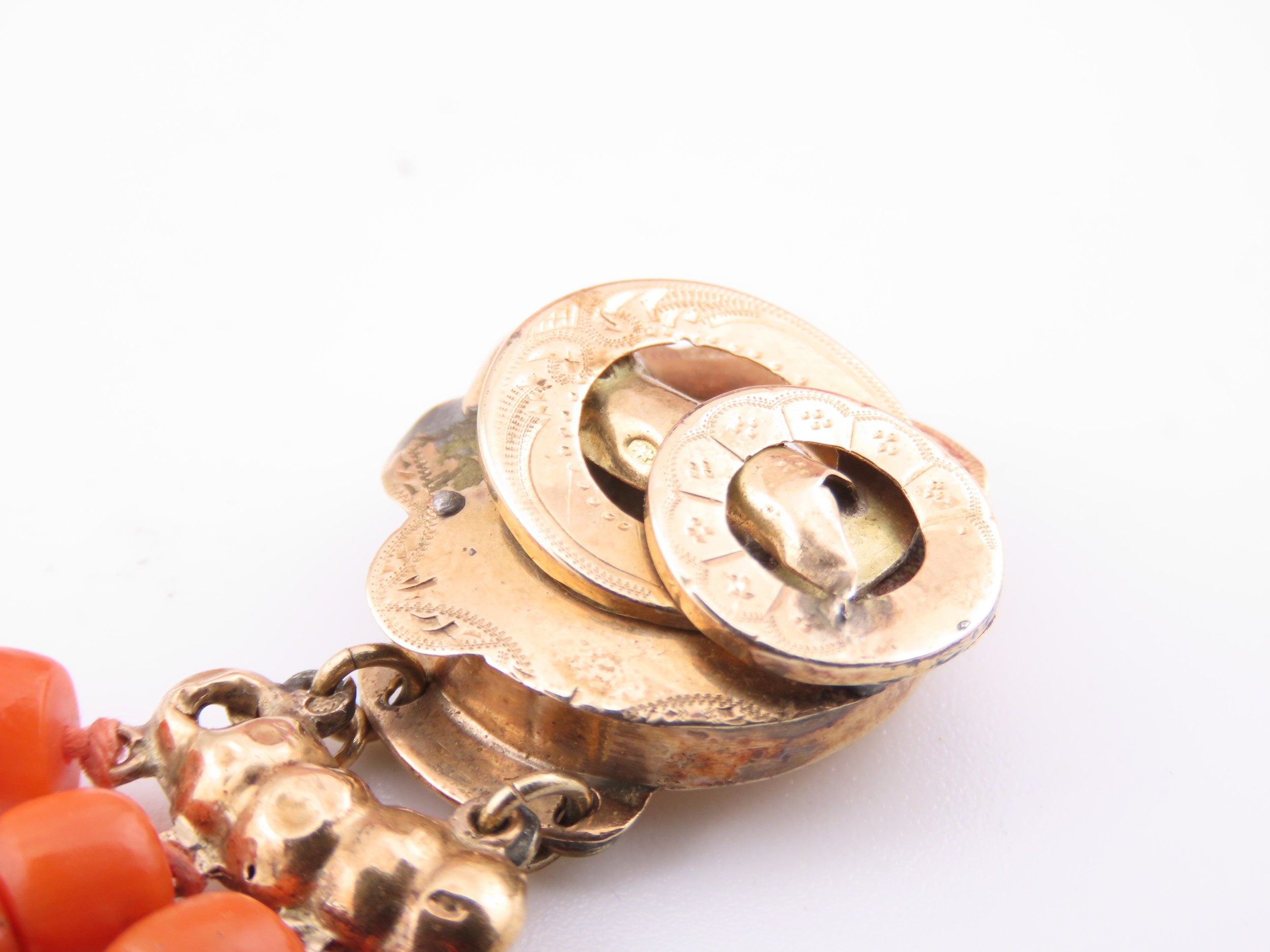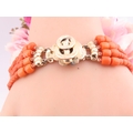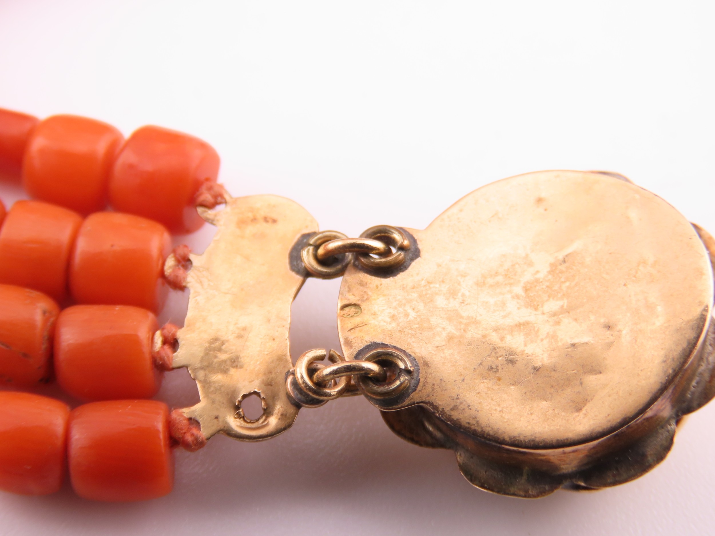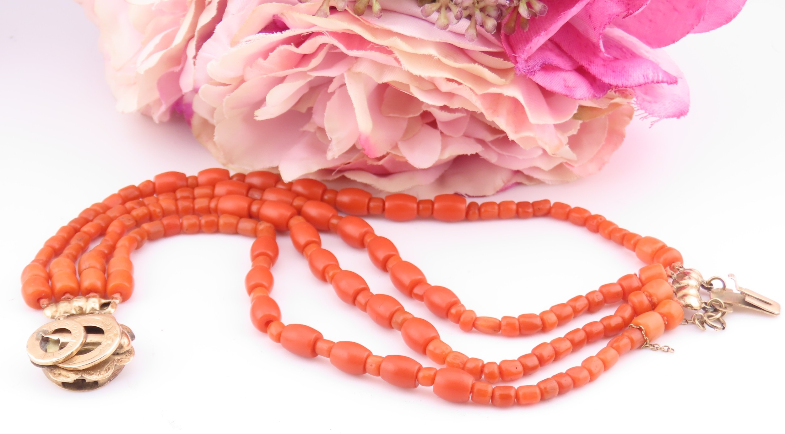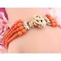 Multi strand coral bracelet with fourteen carat gold clasp Dutch hallmark pre 1906. A beautiful multi strand coral bead bracelet fitted with an ornate fourteen carat gold clasp stamped with early Dutch hallmarks dating to before 1906. The deep orange coral beads are well matched in tone creating a striking antique bracelet of fine colour and craftsmanship.