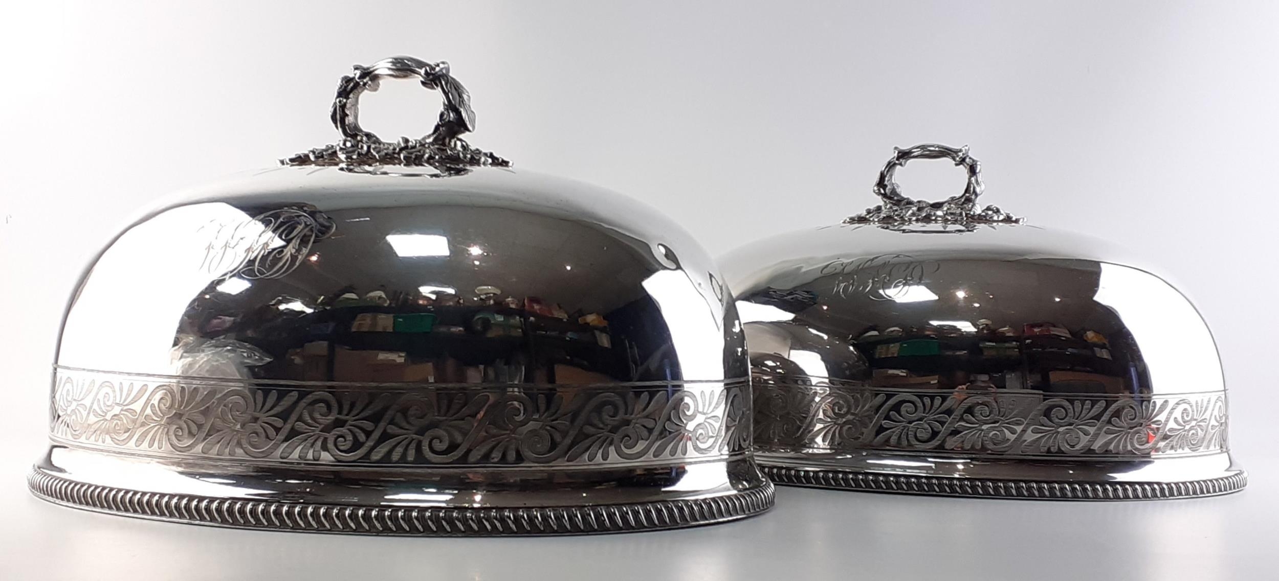 Two very large plated meat covers with ornate acorn leaf handles and monograms.The largest 45cm across. Substantial and classy.