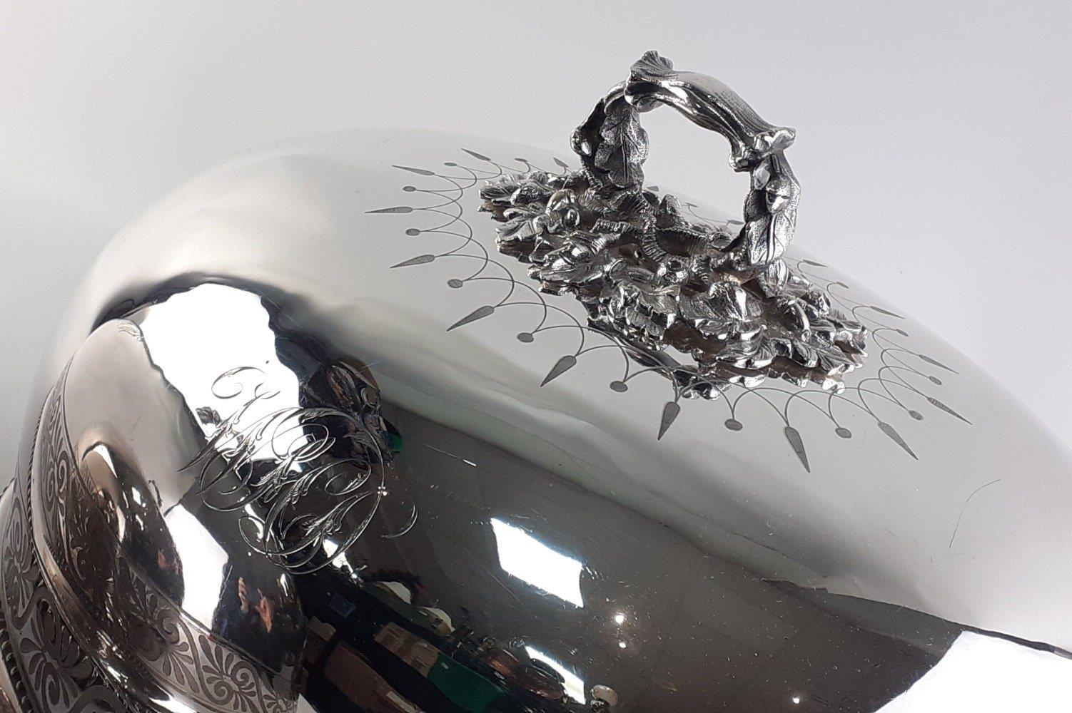 Two very large plated meat covers with ornate acorn leaf han...