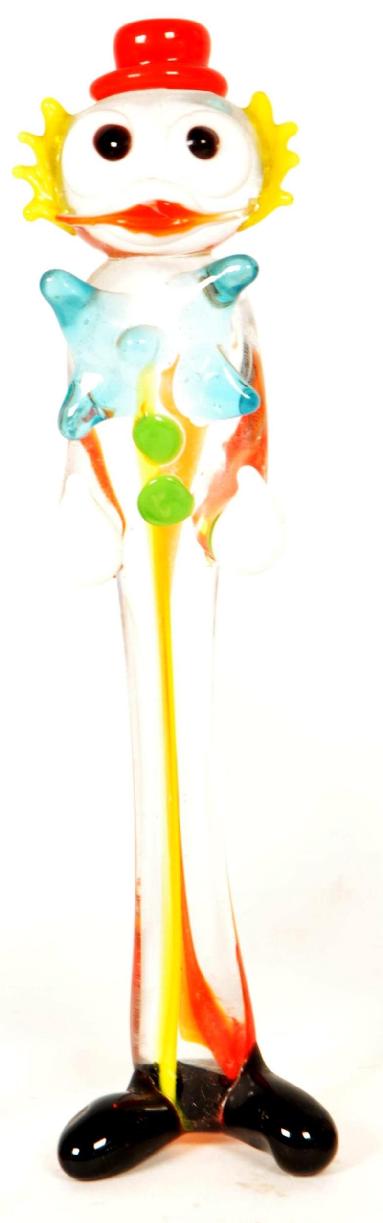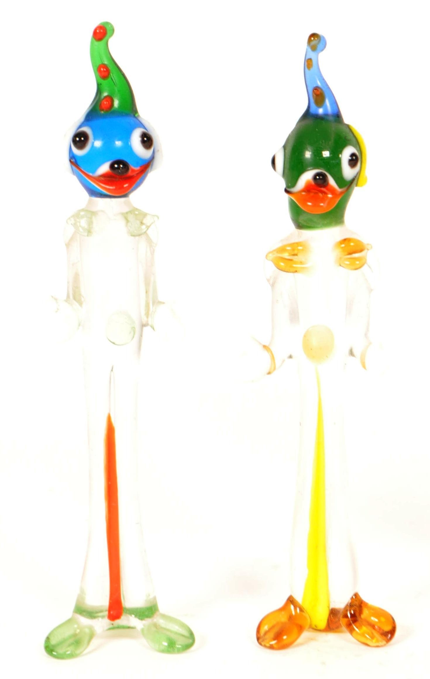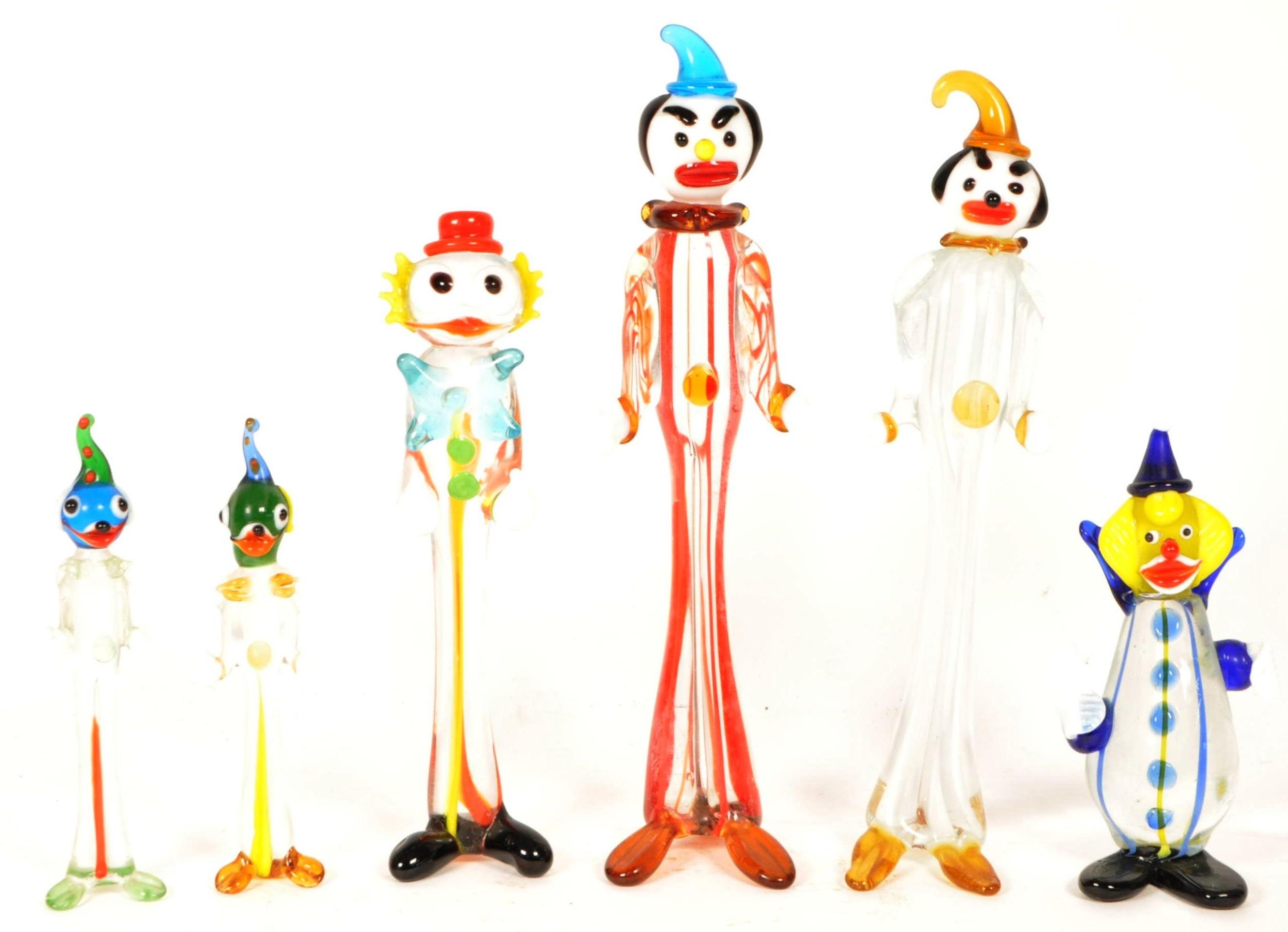 Collection of six small mid century Murano style studio glass multicolored clown figures. Largest measuring approx. 19cm tall.