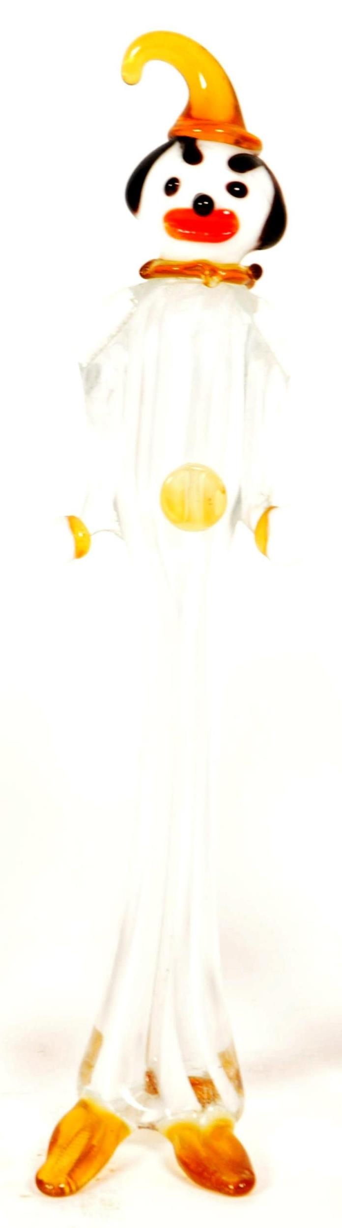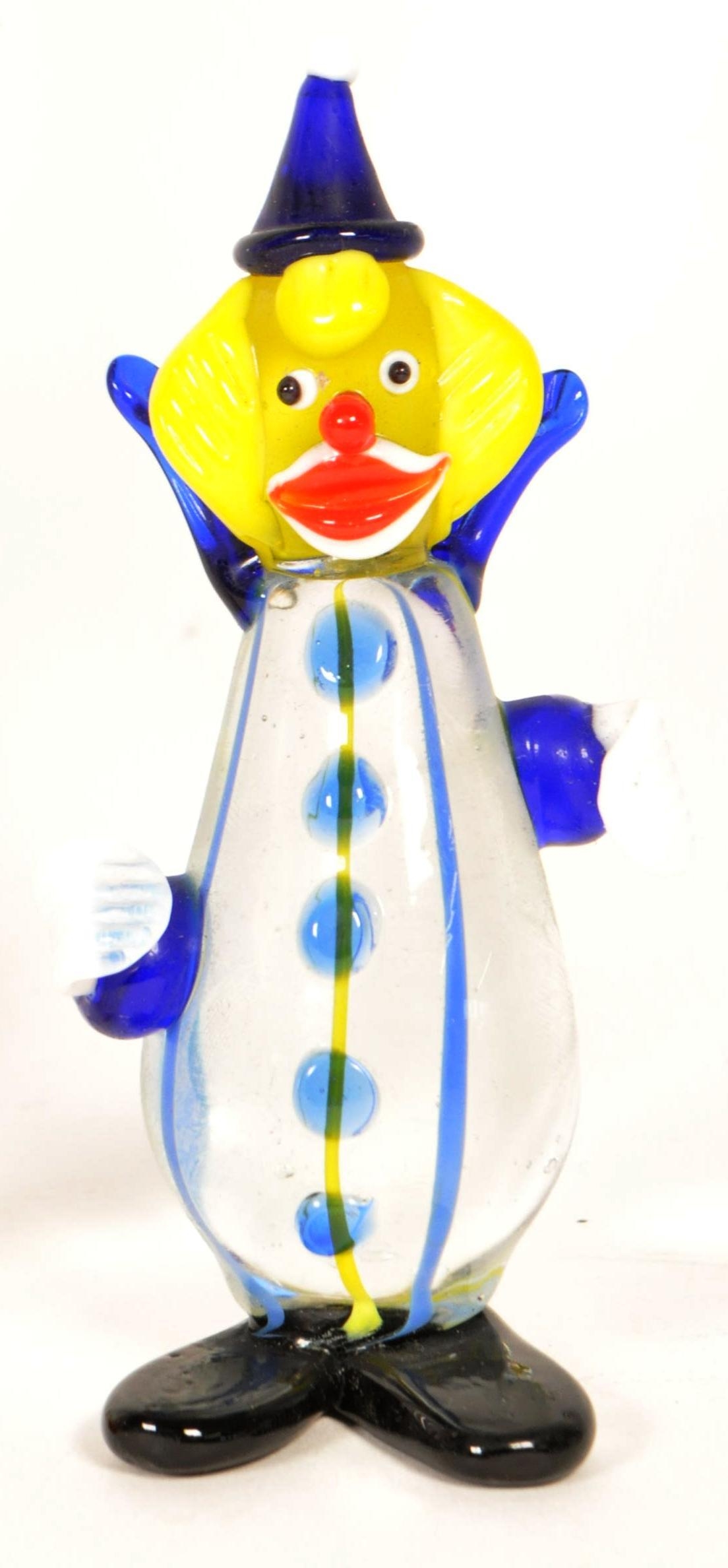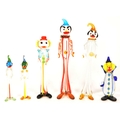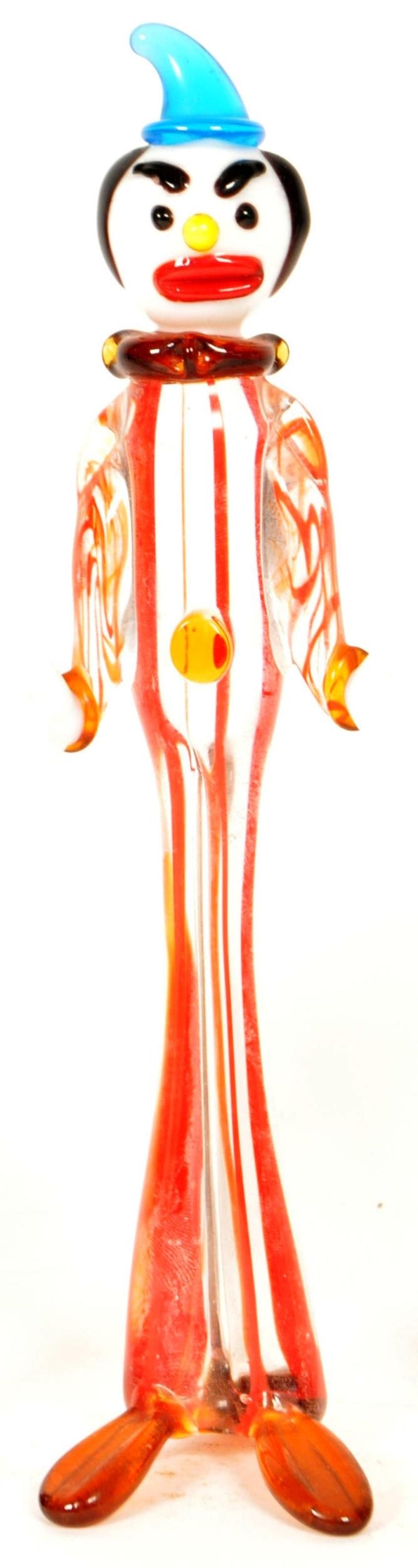 Collection of six small mid century Murano style studio glass multicolored clown figures. Largest measuring approx. 19cm tall.