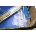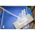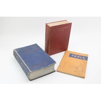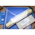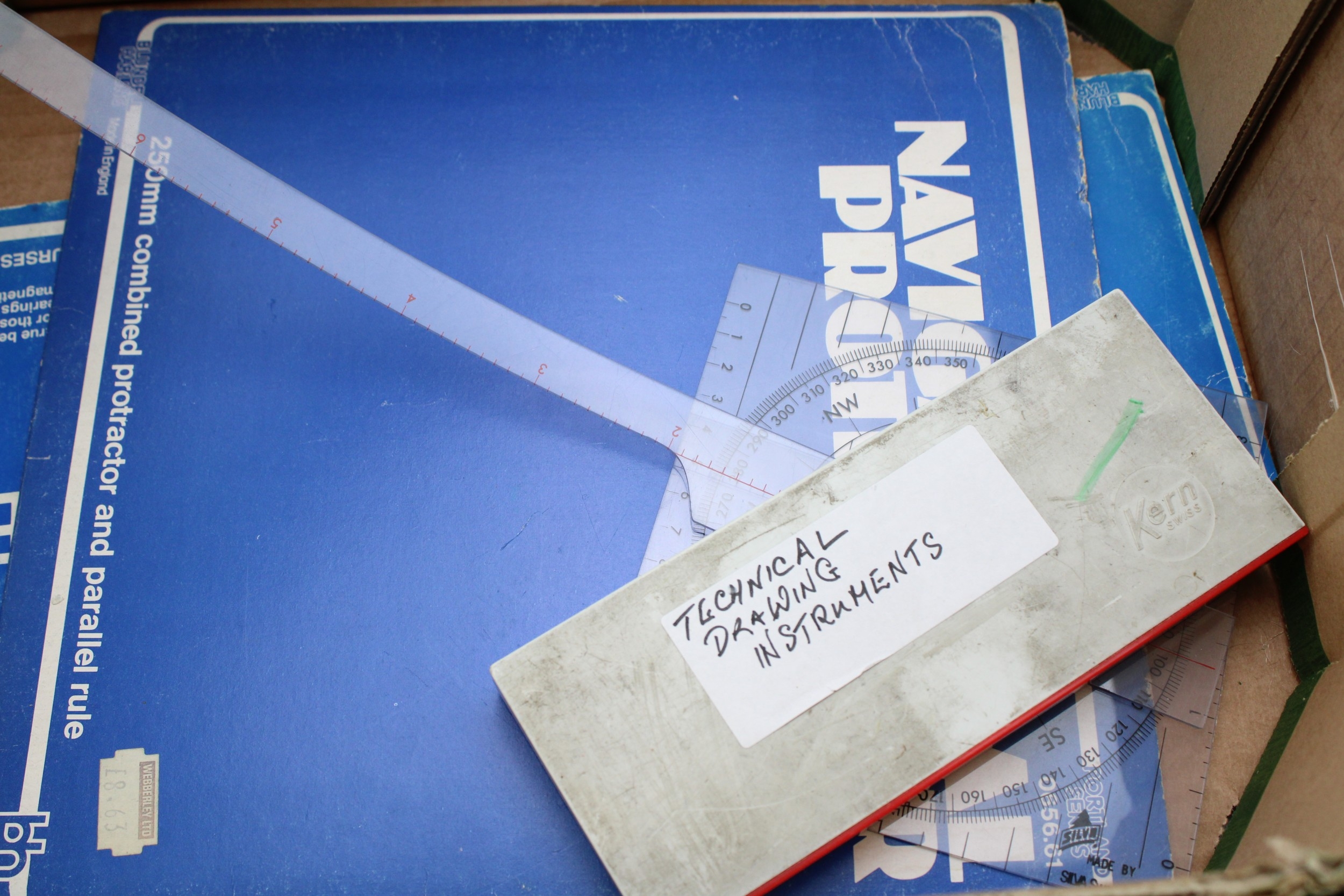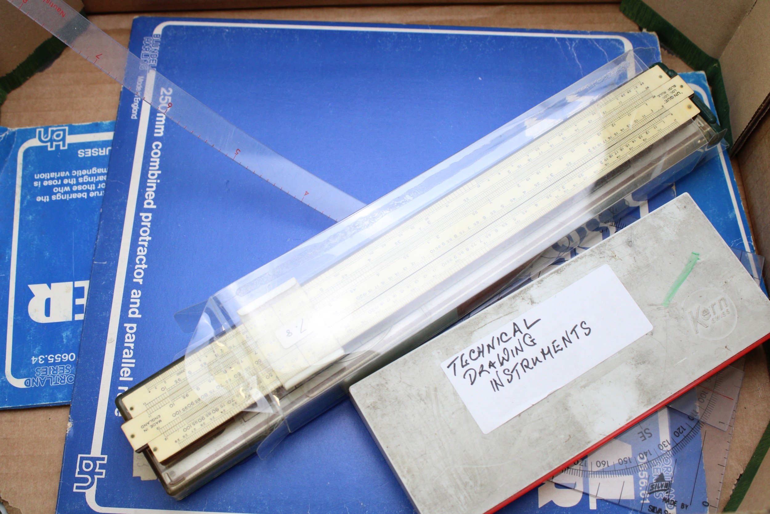 A collection of technical drawing instruments including a slide rule, Breton Plotter, Navigational Protractor, compass set etc