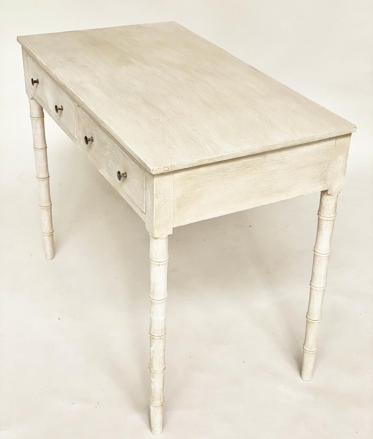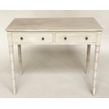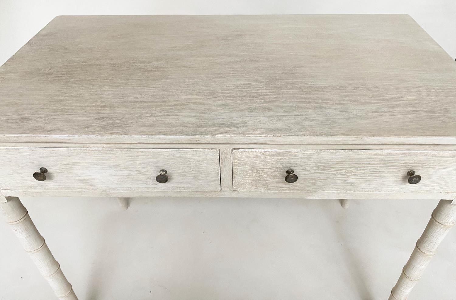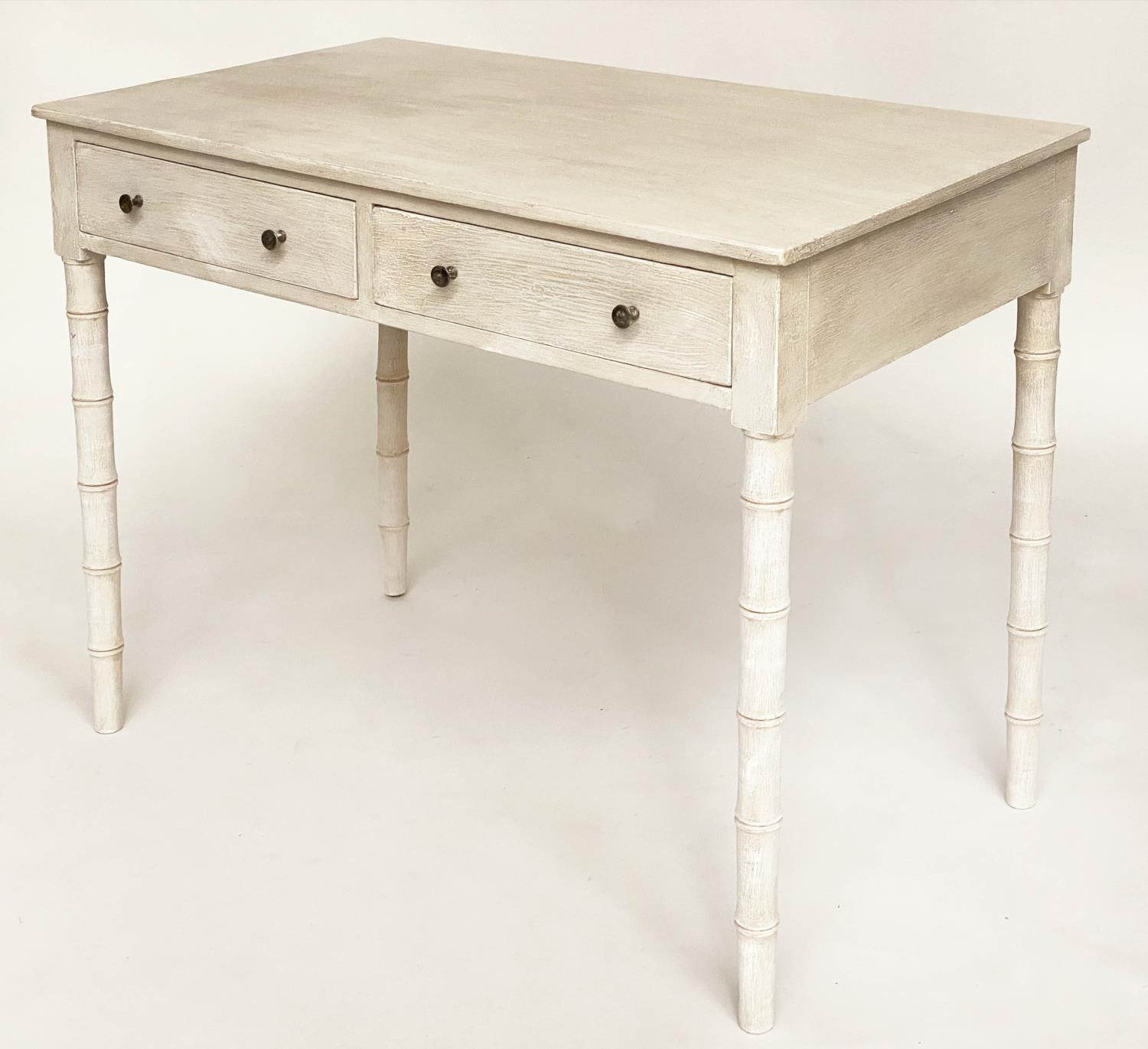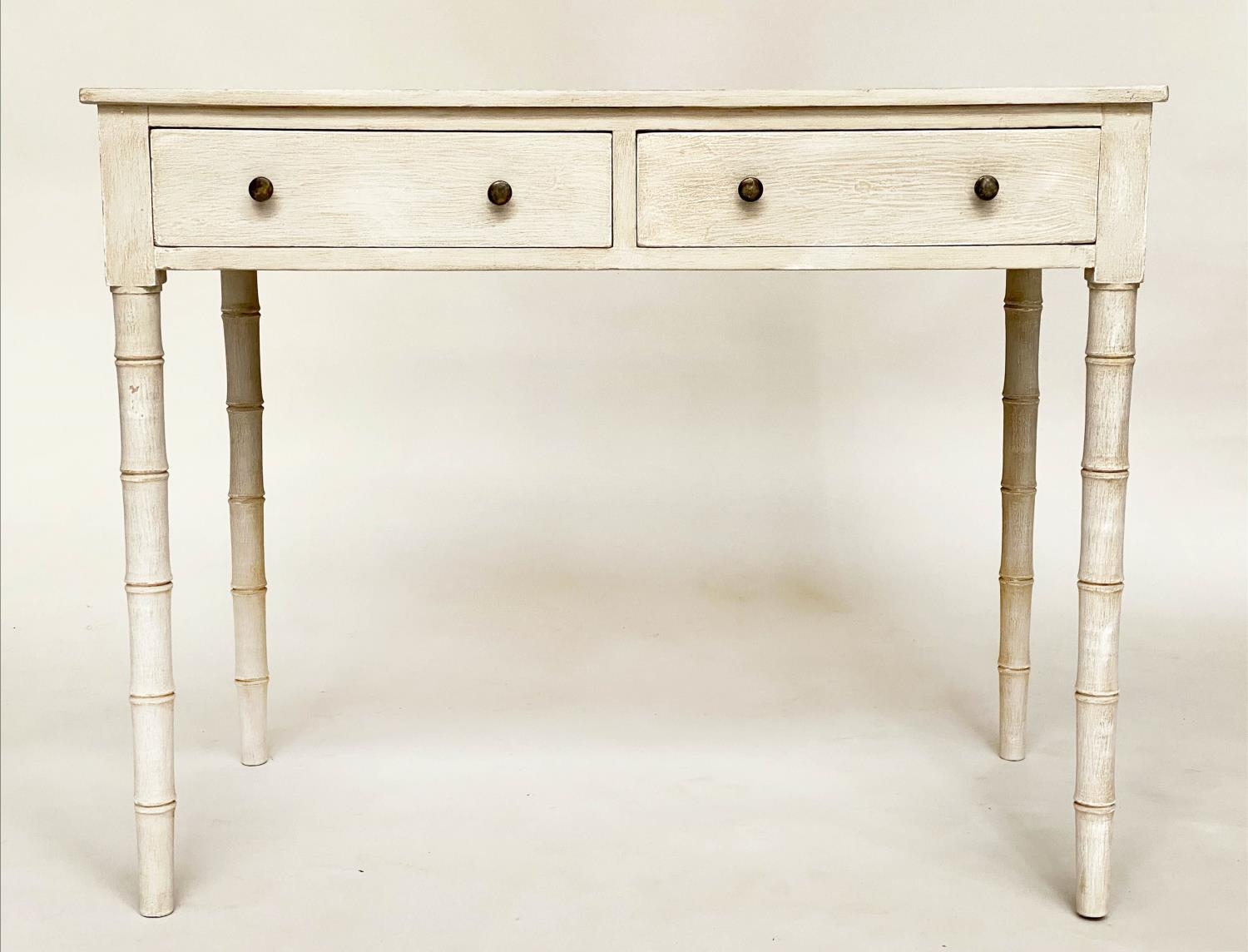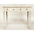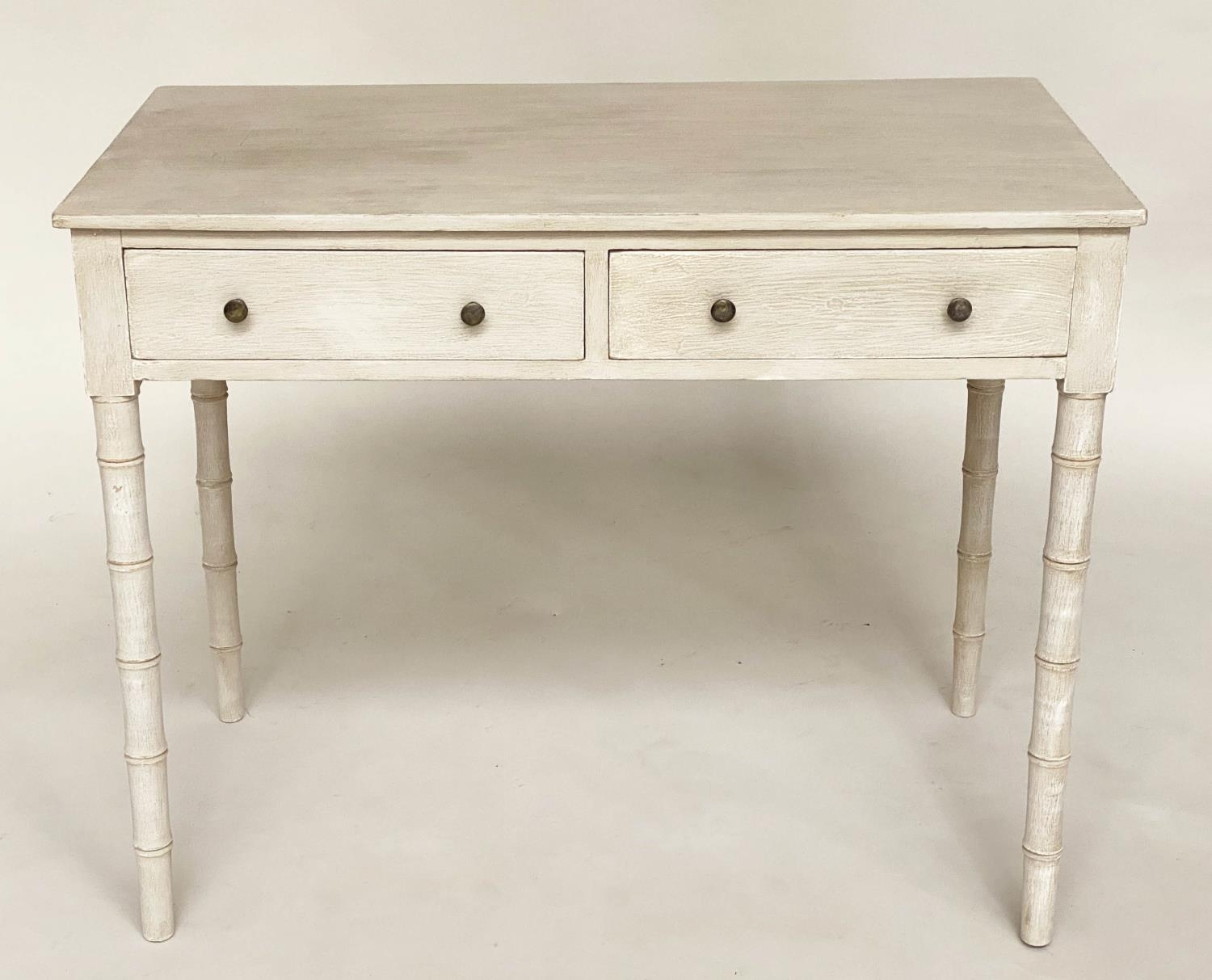 FAUX BAMBOO WRITING TABLE, early 19th century grey painted with two frieze drawers and faux bamboo carved tapering supports, 95cm W x 51cm D x 78cm H.