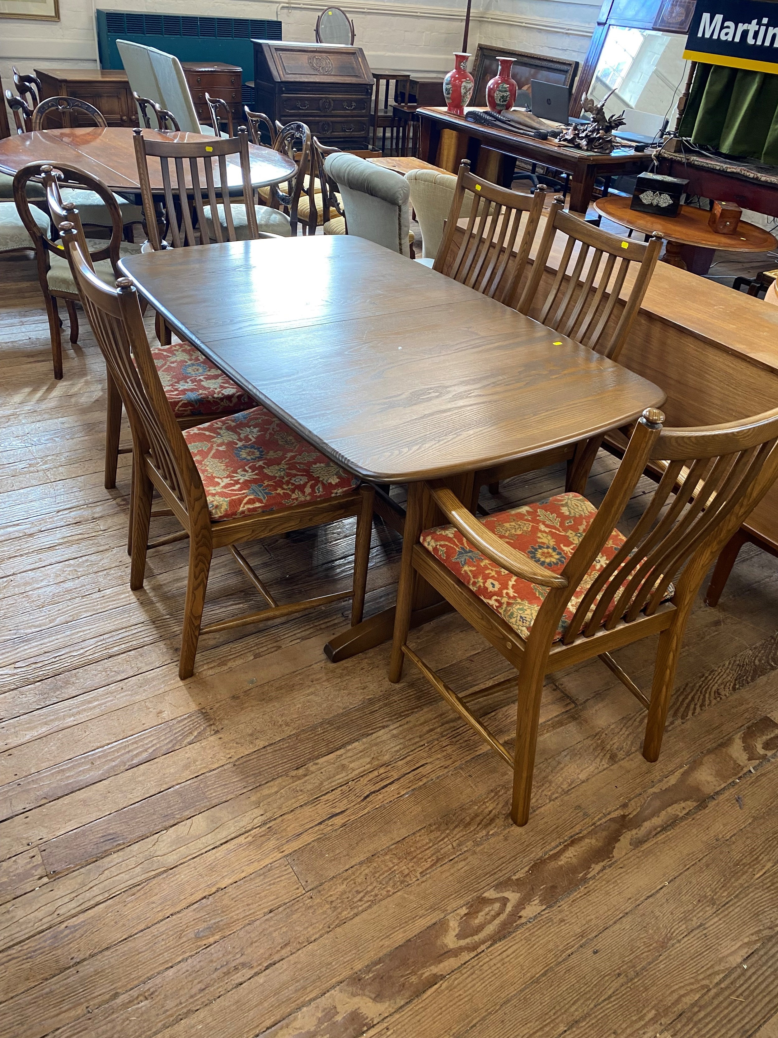 A Modern teak Ercol Style Dining Room Suite. Comprising a dining table and six chairs