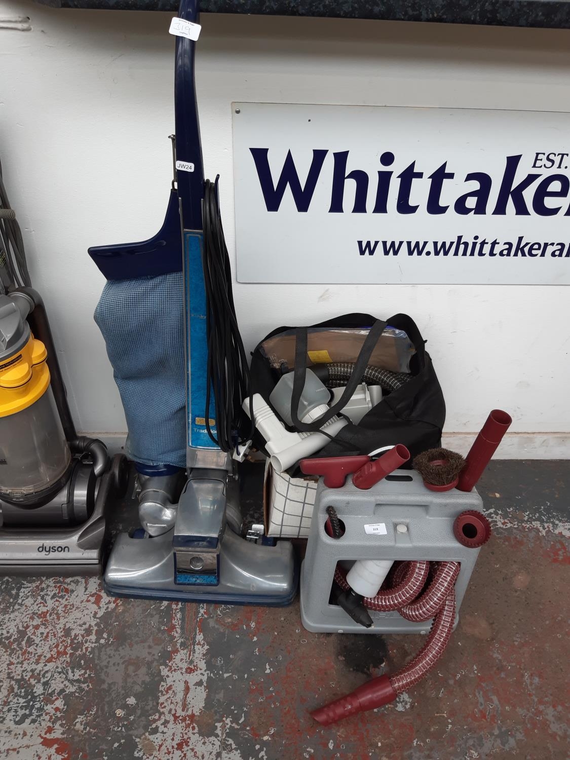 A KIRBY TRADITIONAL INDUSTRIAL VACUUM CLEANER WITH A LARGE SELECTION OF TOOLS AND ACCESSORIES