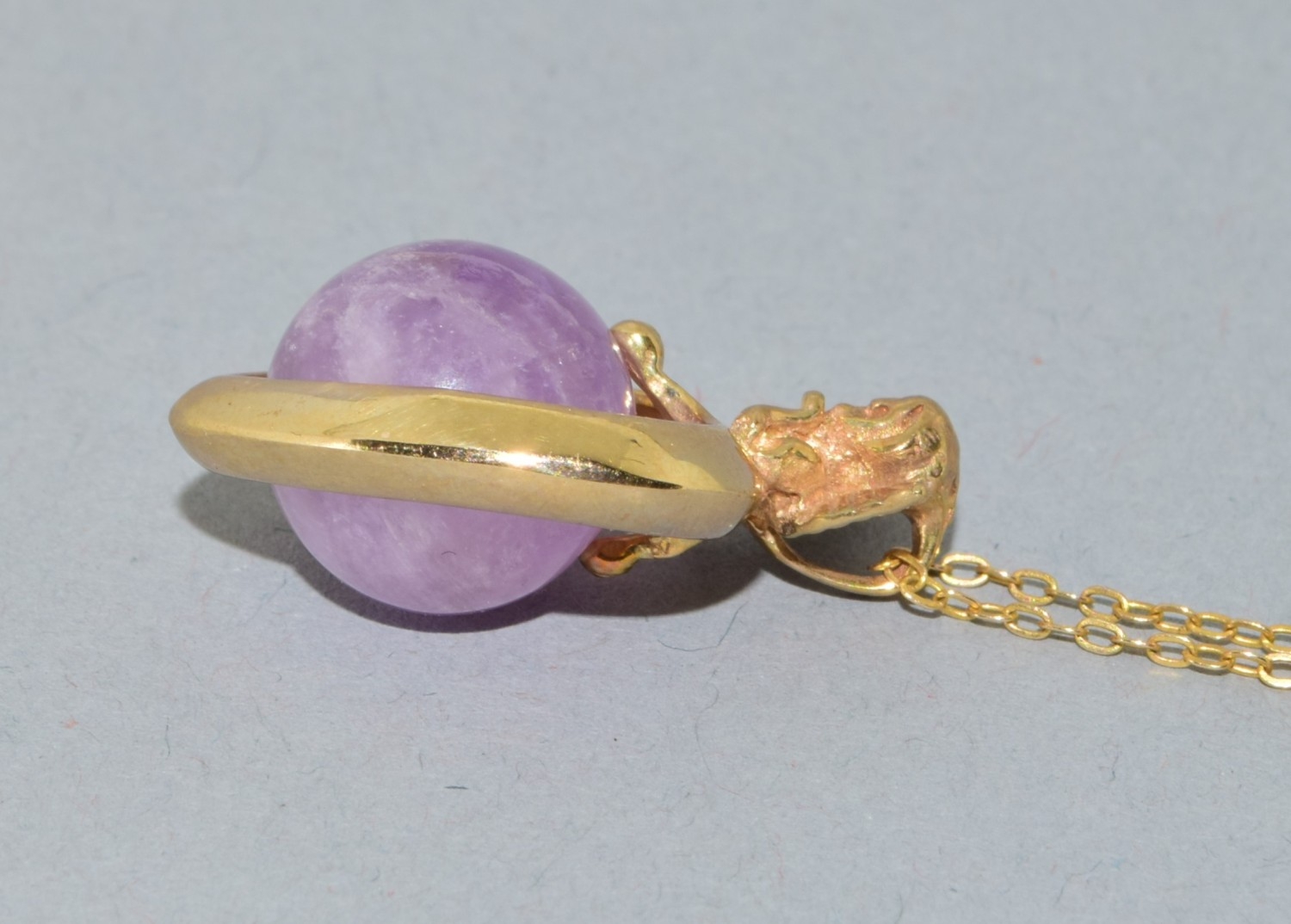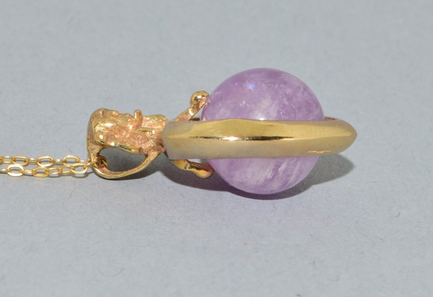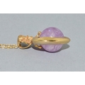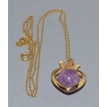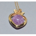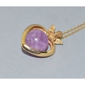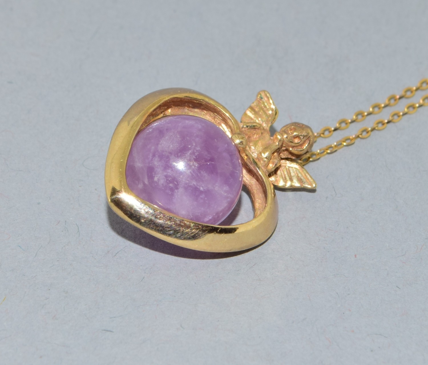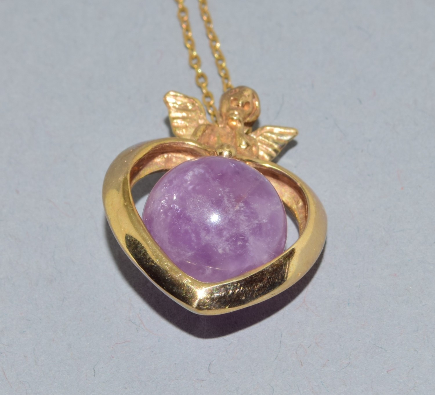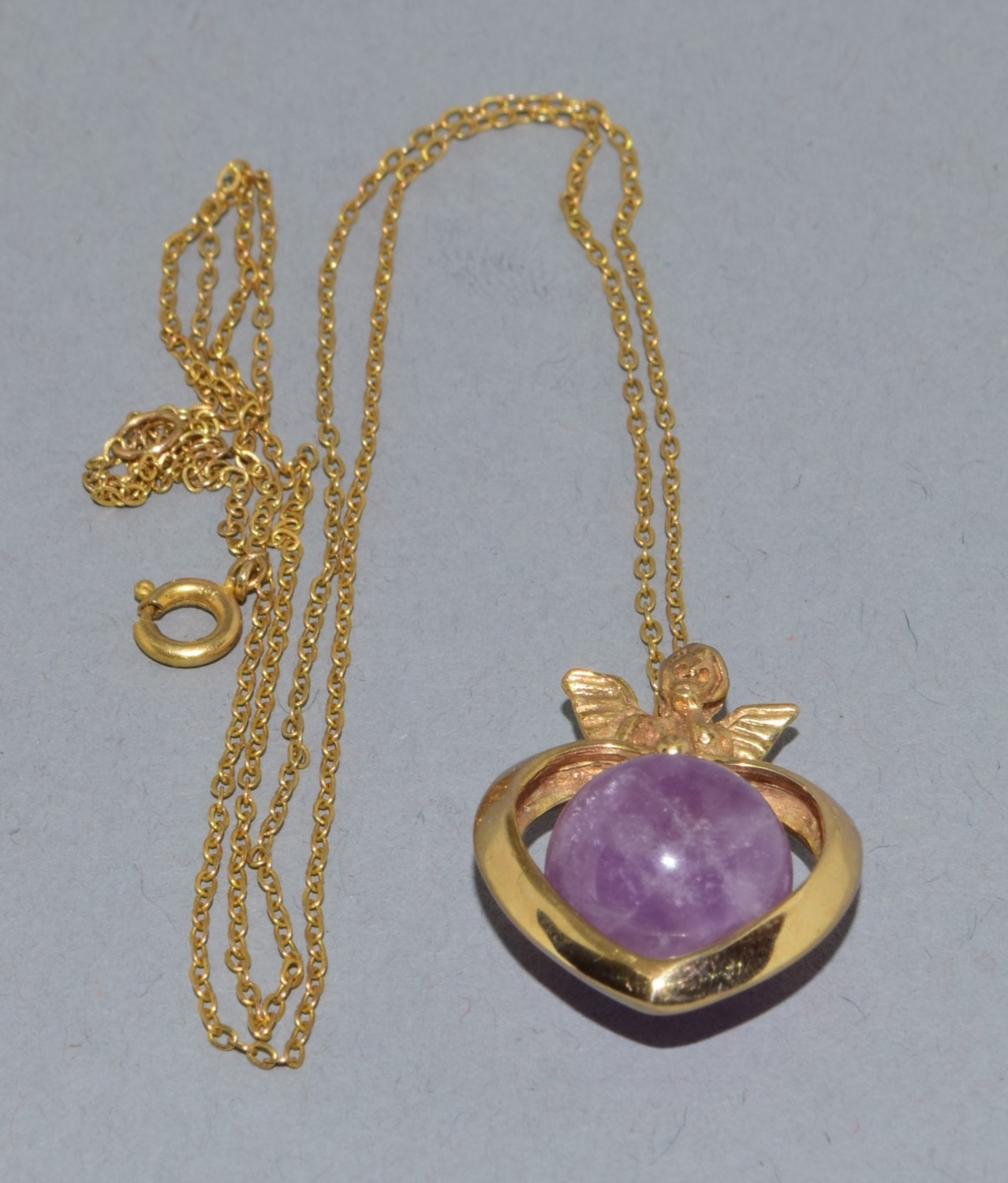 9ct gold pendant necklace. Cherub top on a Heart centrally set with an Amethyst sphere. On a 9ct gold chain of 50cm long 6.2grams