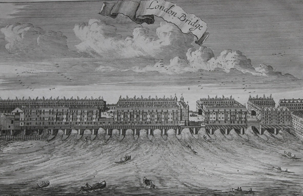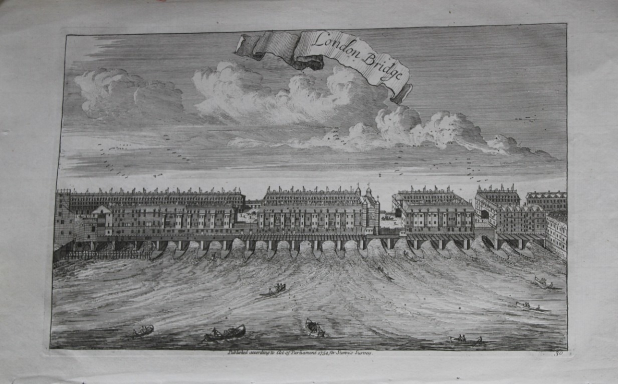 John Stow - London Bridge in 1754 by John Strype . Original antique 18th century engraving. Published in the 1755 edition of John Stow's survey of London by John Strype.