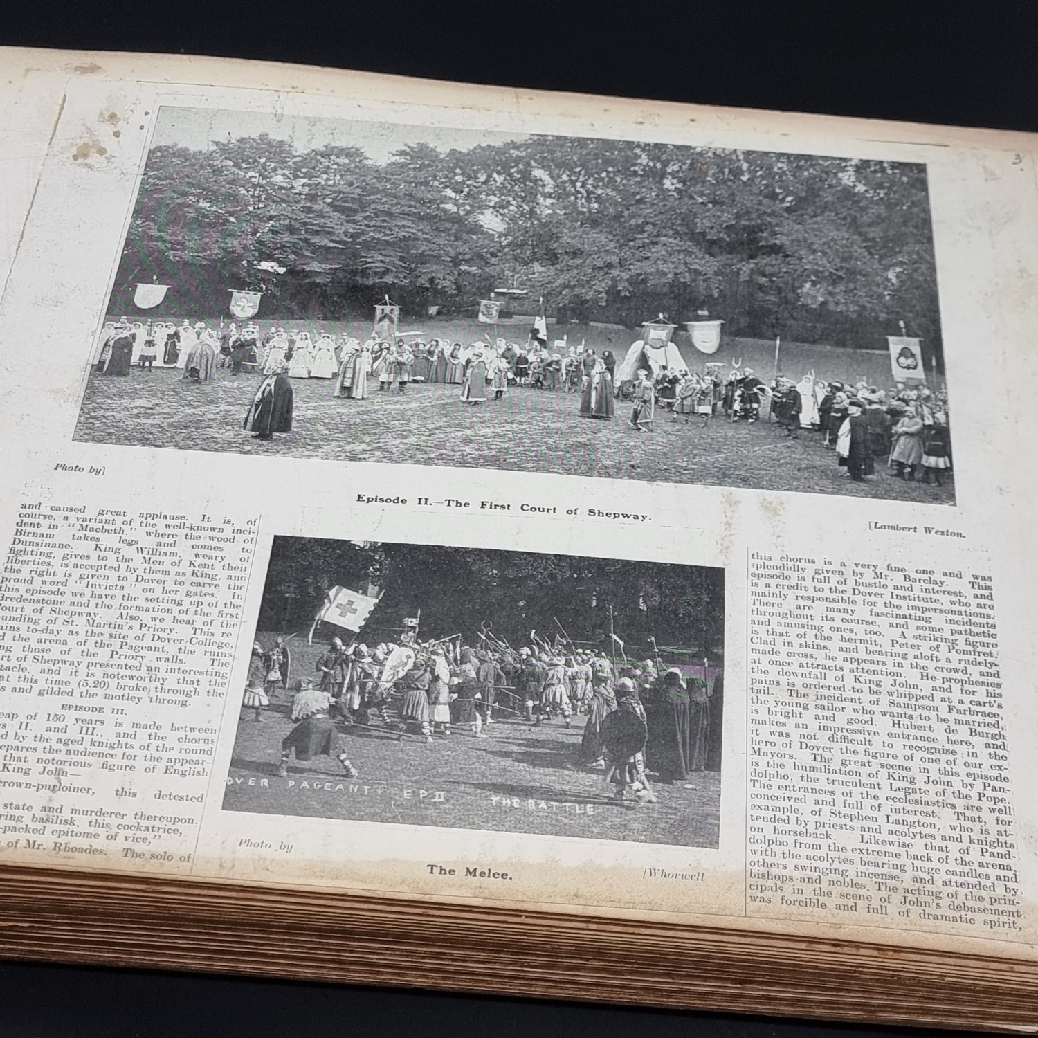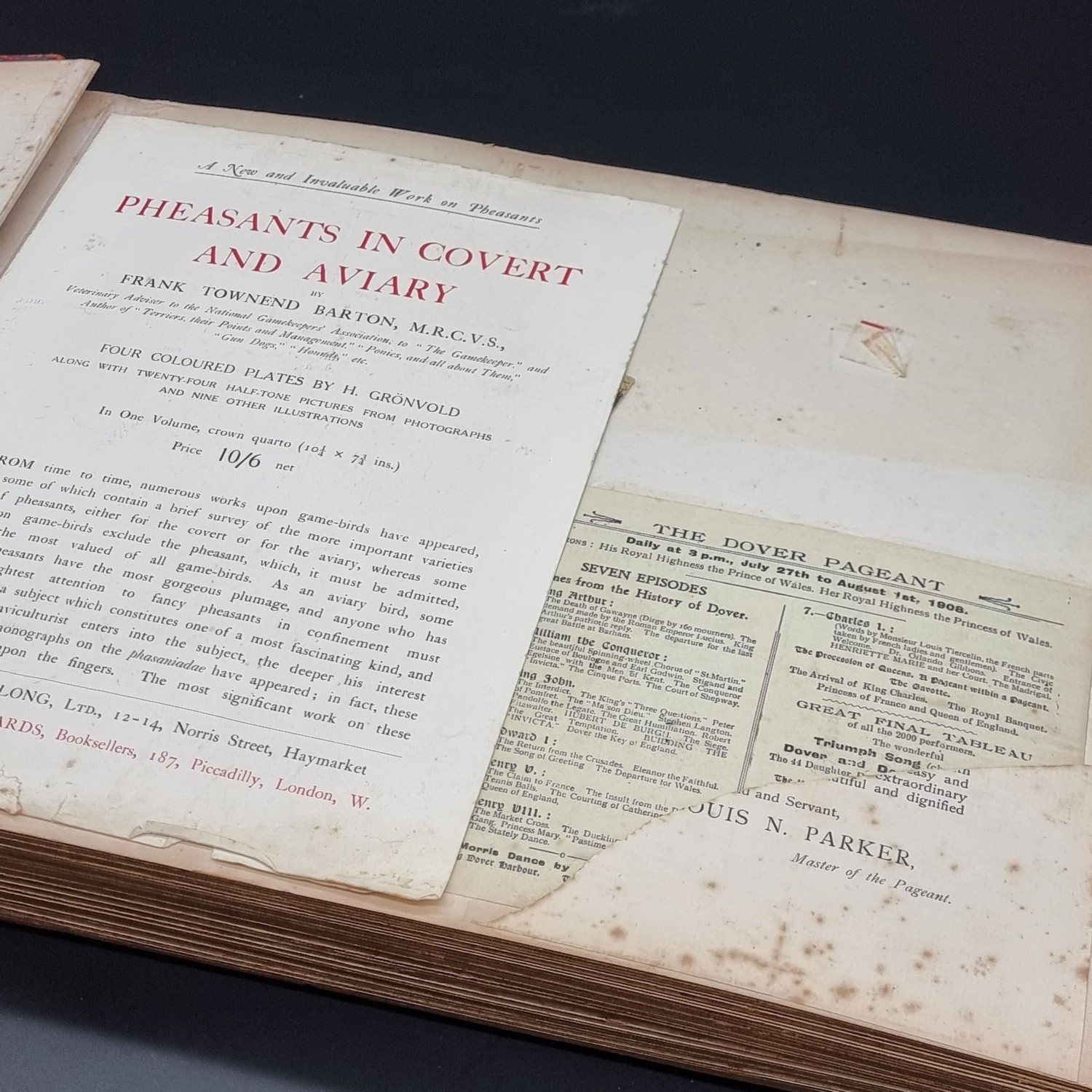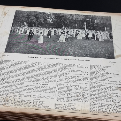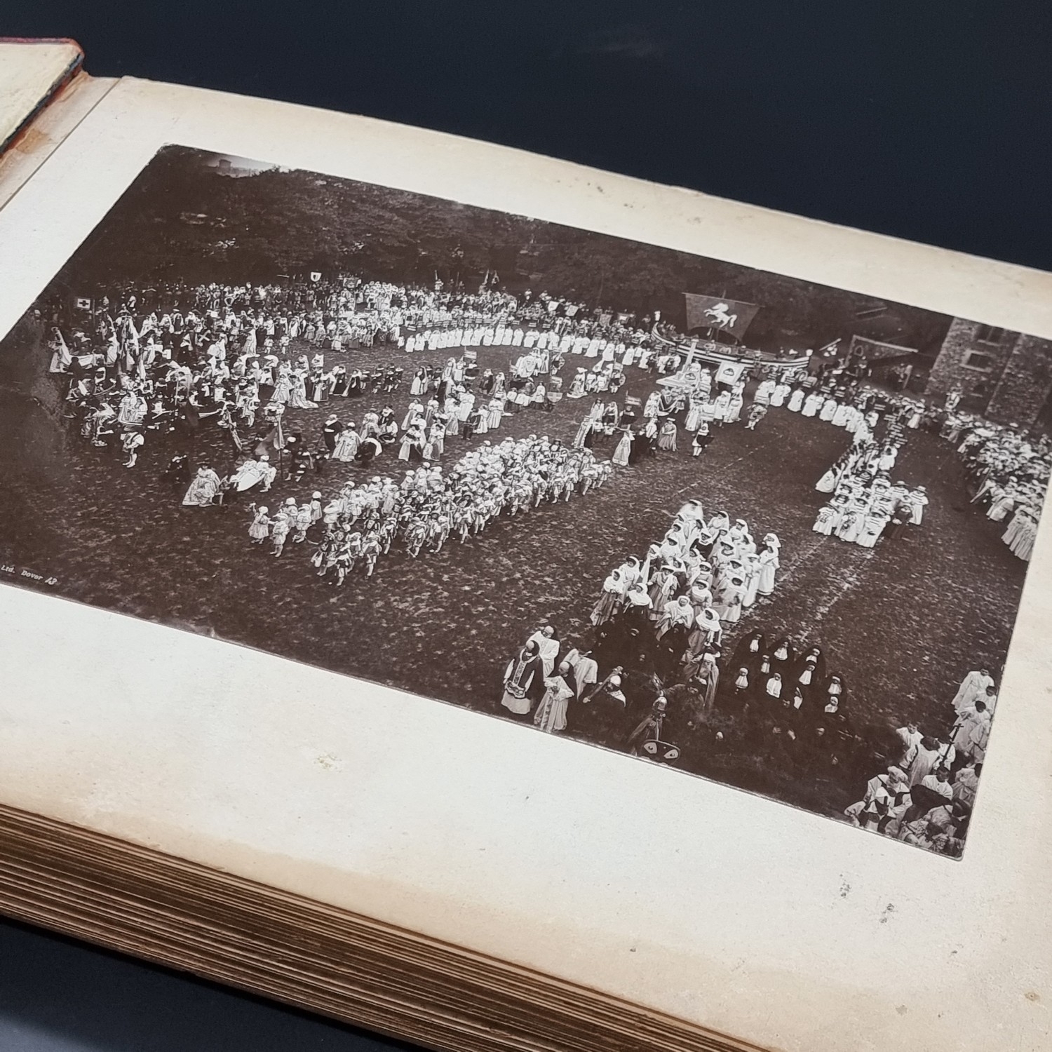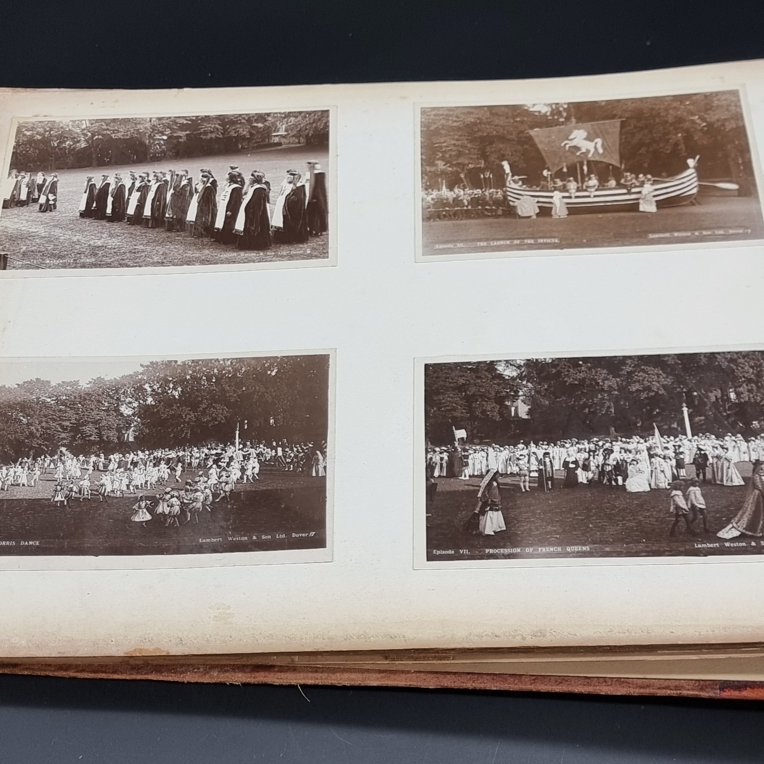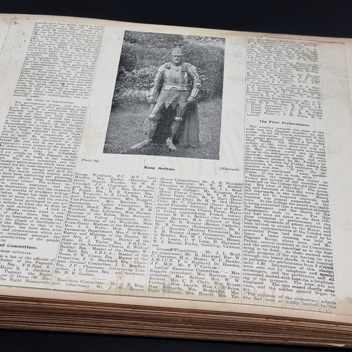 KENT: DOVER PAGEANT, 1908: an album of printed ephemera photographs and cuttings relating to the Dover Pageant of 27th July-1st August 1908: approx 60 postcards and original photographs of various sizes, all tipped-onto thick card album leaves, together with printed programme for the event: instructions and notices to performers (some folding and backed onto linen): contained in worn half leather album of period, spine loose and boards detached, thick oblong folio. (1)