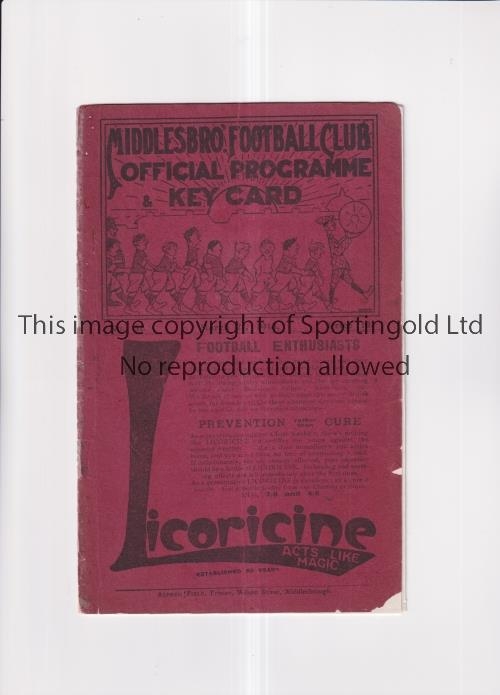MIDDLESBROUGH V MANCHESTER CITY 1913 Programme for the League match at Middlesbrough 21/3/1913, ex-binder, the original cover has repaired and has minor paper loss. Fair to generally good