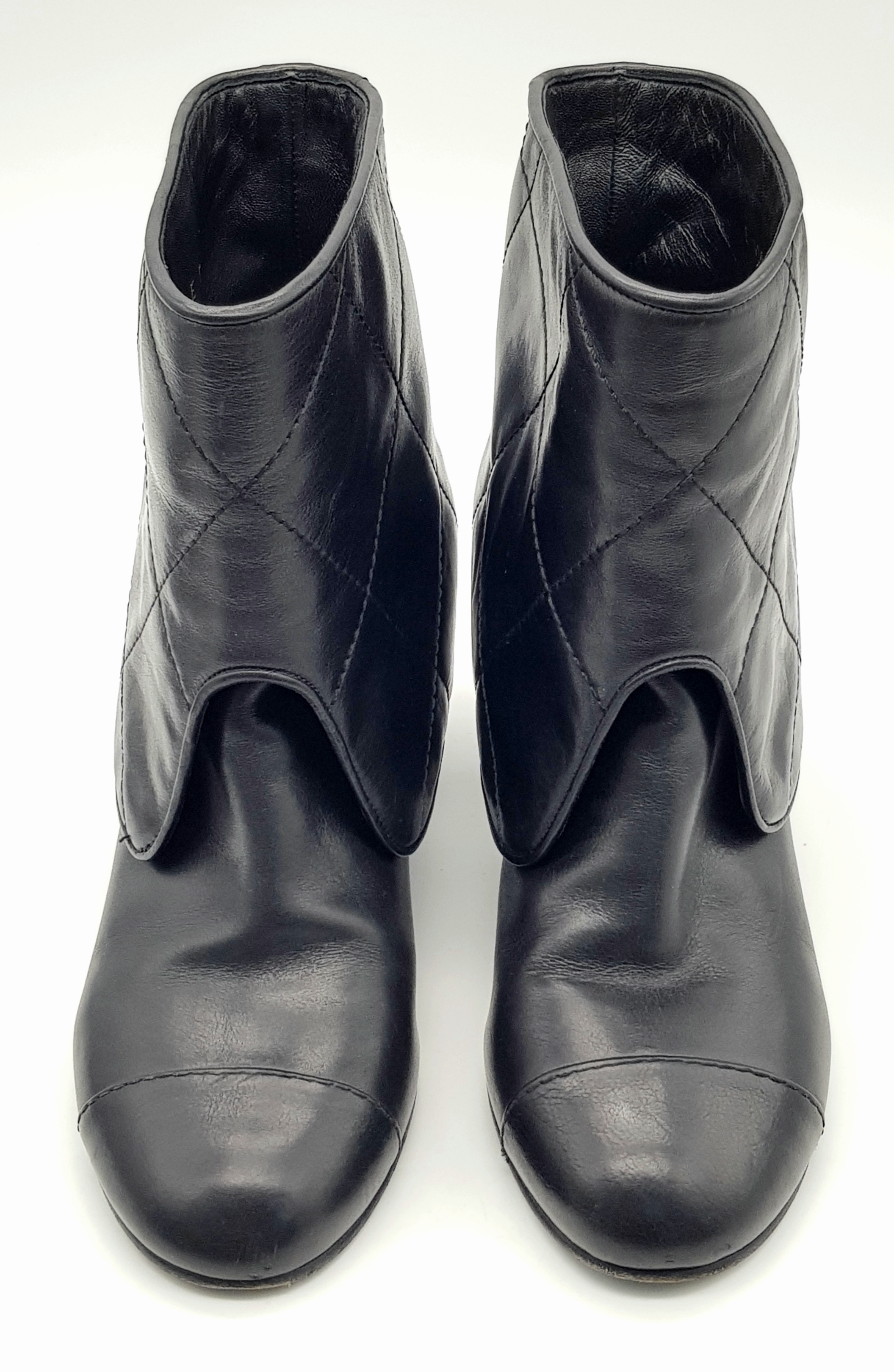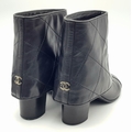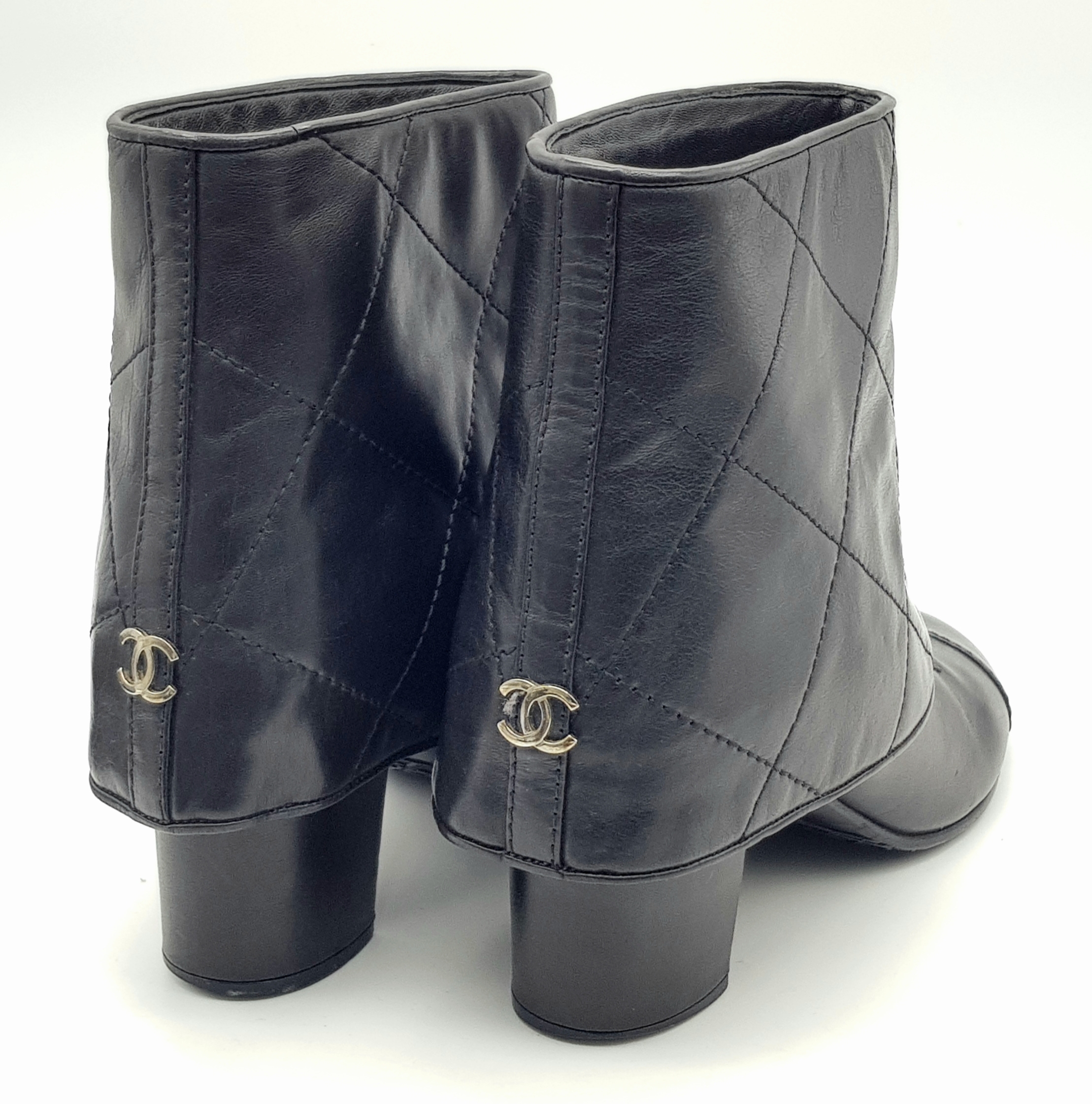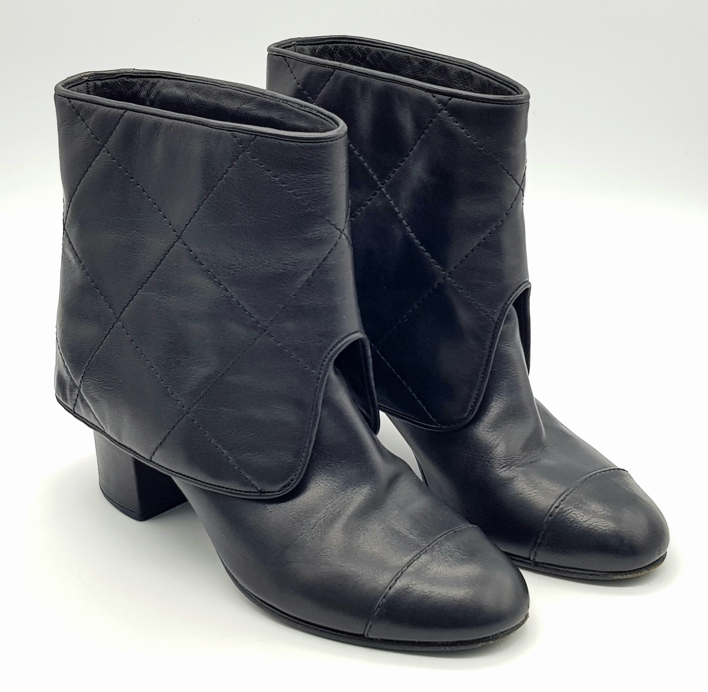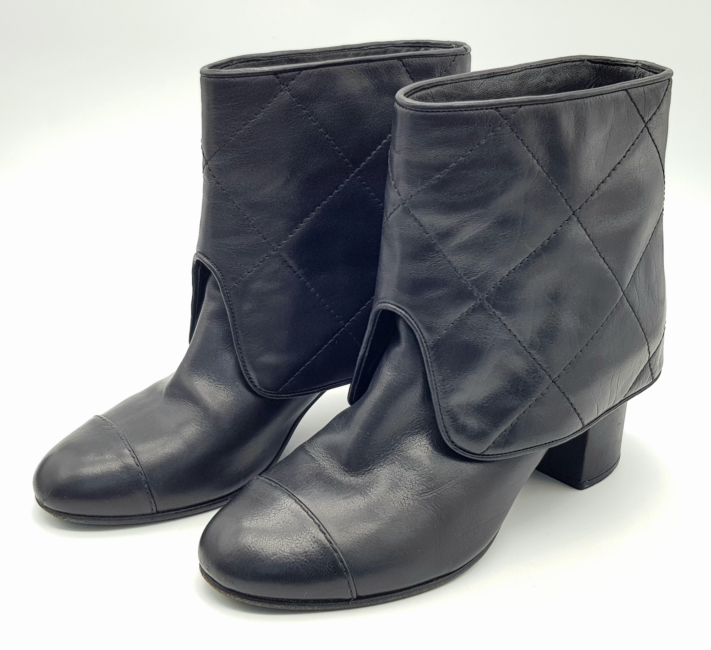 A Pair of Chanel Black Quilted Leather Ankle Boots. Black leather featuring a fold-over cuff design, 7cm block heels adorned with silver-tone CC logo hardware at the back, and leather soles stamped “Made in Italy.” The total height of the boots are approximately 19cm. Size 36½ EU (UK 3.5). Some signs of wear to soles and slight creasing to the uppers. Please see photos or request a condition report. Ref: JJ539.